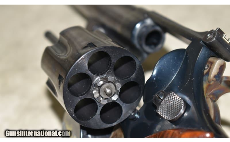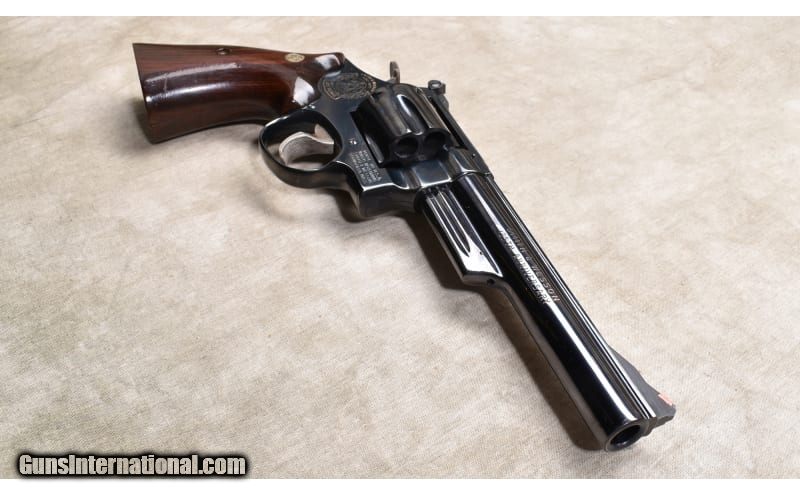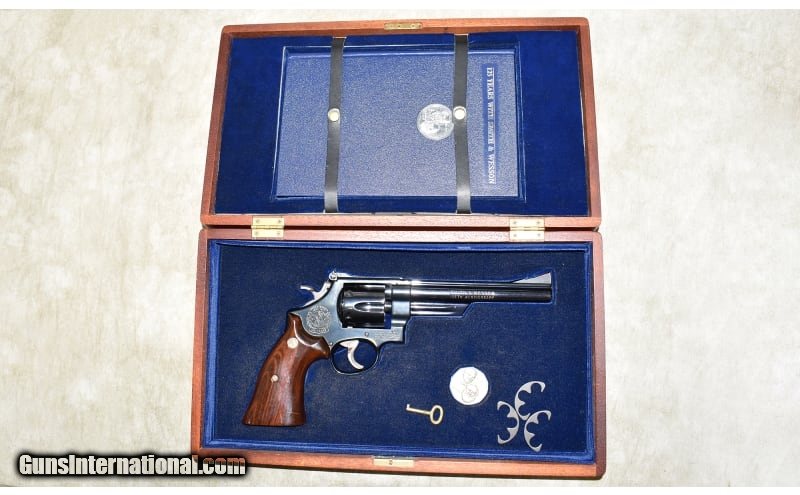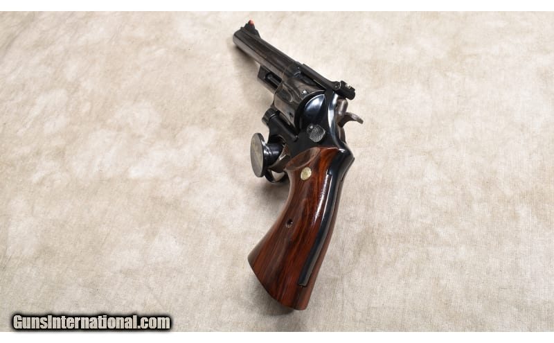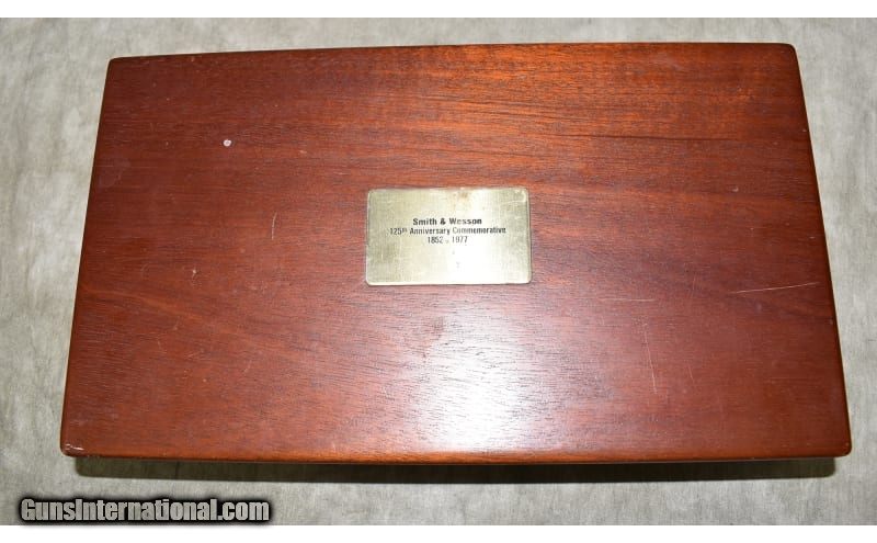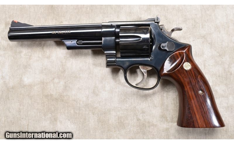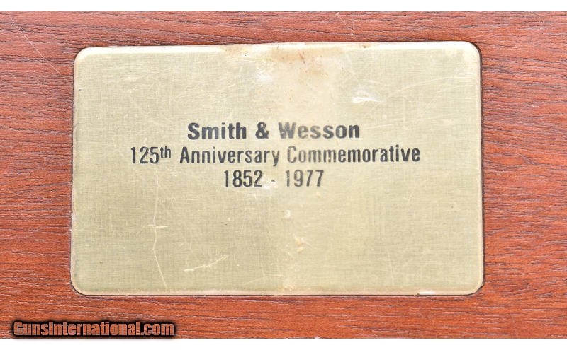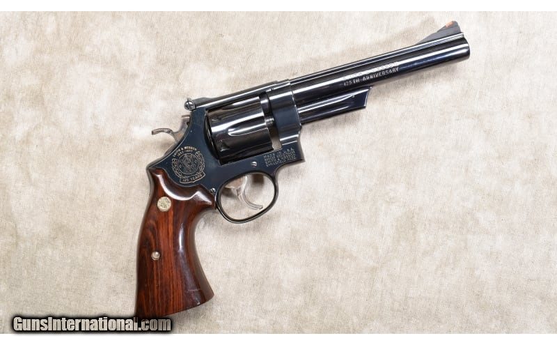 Description: It is hard to believe that Smith and Wesson has been around for more than 170 years. This 125th Anniversary Model 25 was released in 1977. The Model 25 was based upon the Model of 1917, a revolver developed for the military using .45ACP cartridges, common with the Colt 1911, and readily available in the military supply chain. The 1917 became known as the Target Model, and then renamed Model 25. This is made for target shooting with target type sights, trigger, and hammer. It has oversize target grips made of dark straight-grain hardwood. .45 SOLD Chambers: 6 rounds Metal Condition: Excellent. Wood Condition: Excellent. Bore Condition: "Shiny and bright, crisp rifling. Barrels: 6-1/2 inch Triggers: "Half inch wide grooved trigger, double or single action, half inch wide hammer spur. Butt Pad: Smooth oversize hardwood grips. Weight: 47 oz. Sights: "Serrated ramp with red insert front sight, adjustable notch rear sight. Item Location: Rogers |