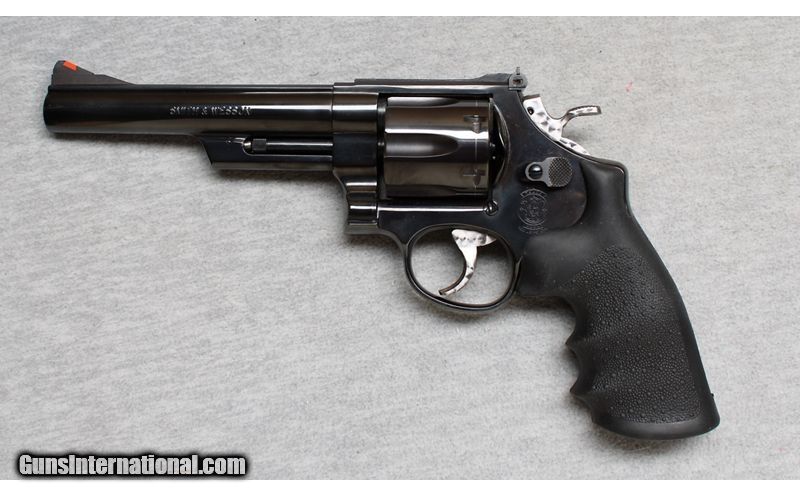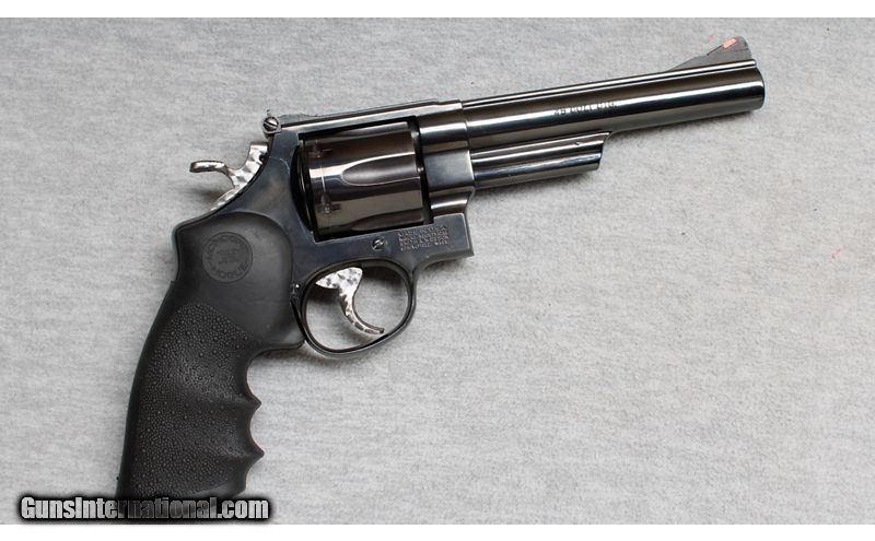 Description: Excellent, light wear and handling marks. S&W large frame 6 shot .45 caliber revolver. 6" Barrel, adjustable sights, jeweled trigger and hammer and Hogue hard rubber grips. .45 Colt SOLD Chambers: revolver Metal Condition: Excellent Wood Condition: Grips are excellent Bore Condition: Bright Barrels: 6 Triggers: Double and single action Butt Pad: Hogue grips Sights: Adjustable Item Location: La Vista, NE |