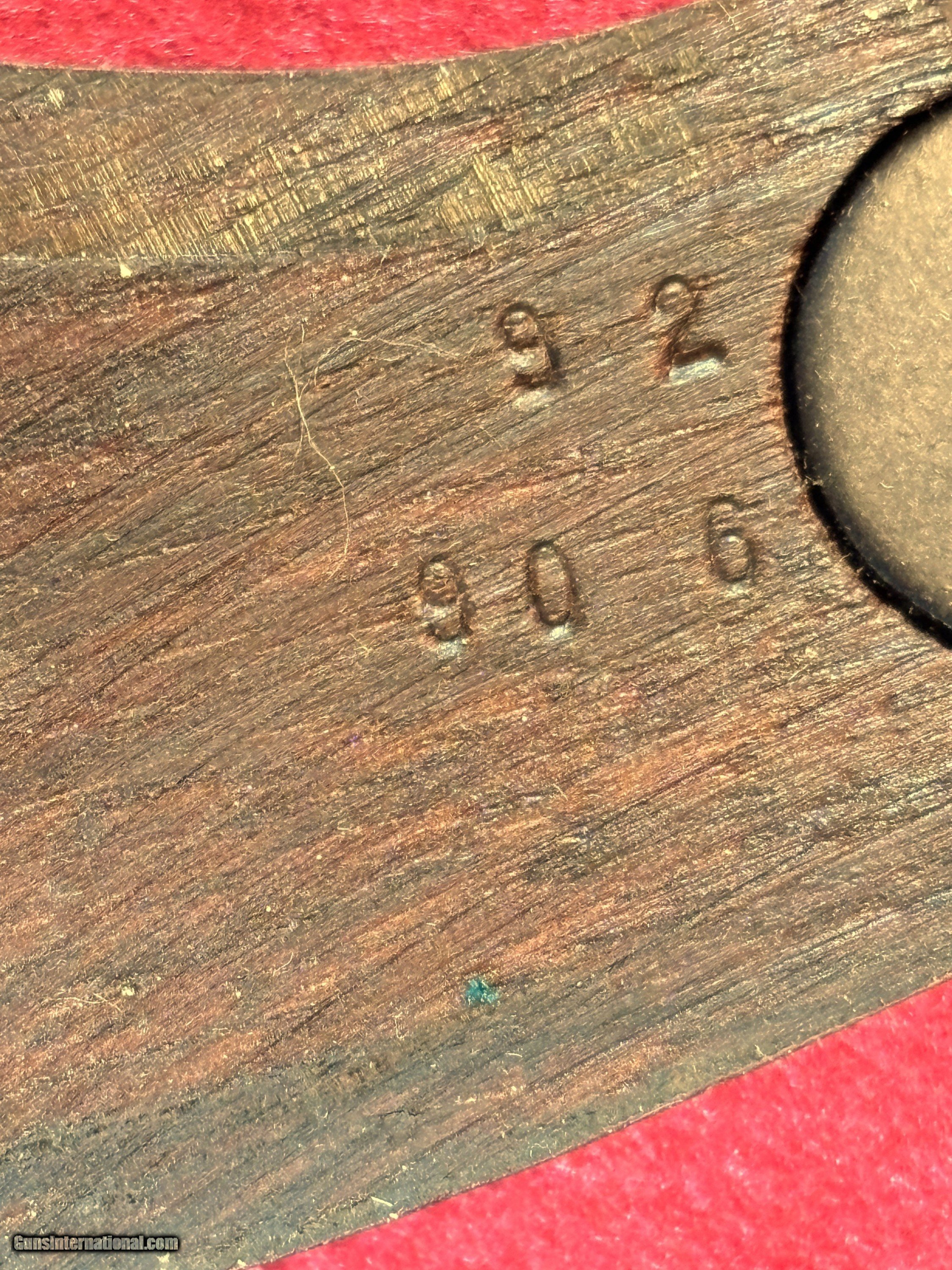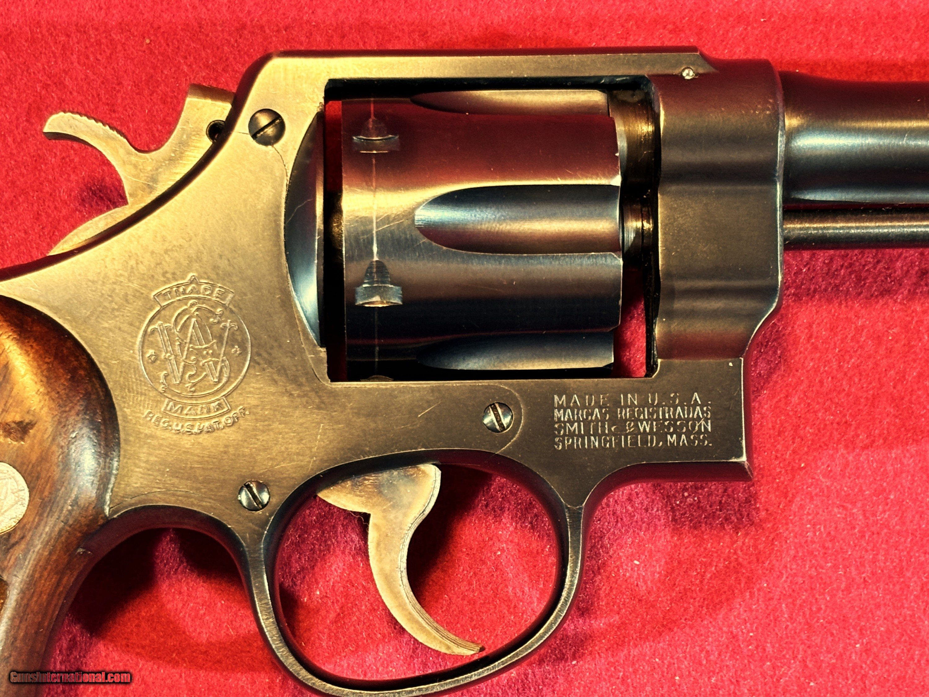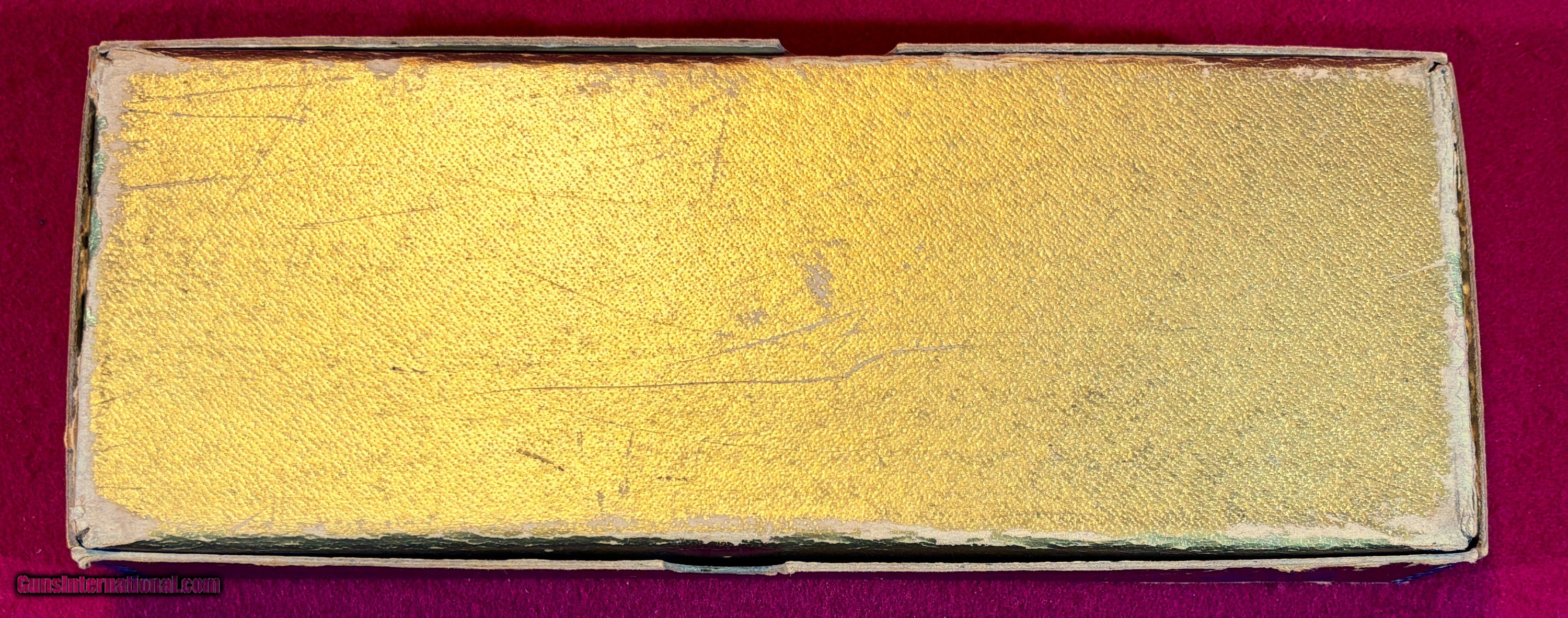 Description: Smith & Wesson 45acp 1950 Army Model Revolver, Pre Model 22, Blue Finish, Square Butt, with 5 1/2 inch Barrel. This one comes with a correct Smith & Wesson Factory Gold box un-numbered. The box contains a cleaning rod and some half moon clips. At first glance the revolver looks new but if you look closely there is some minor wear in certain places. I have tried to highlight it in the photos. These revolvers are getting very difficult to find in original, pristine condition. The grips are original and are numbered to the revolver. This is the best one that I have seen, but I'm sure that there are a few better ones in a collector's safe somewhere. This one was made in 1953 and is chambered in 45acp and uses moon clips or half moon clips. Some are contained in the box with the revolver. If you have a collection of mint, Gold box guns, don't pass this one up. Buyer pays shipping and insurance. TERMS – PLEASE READ; PAYMENT - I can accept money orders, cashier’s checks, bank checks, or personal checks (pending verification of funds). Payments via USPS & UPS are acceptable. My FFL dealer (Dixie Gun & Fish) securely packs and ships each firearm, following all firearms laws, and will include a signed copy of their FFL with each firearm shipped. No private sales on firearms! SAFETY WARNING- Buyer is solely responsible for determining that a used gun is safe to shoot. The firearms offered may or may not have been test fired and some have been only visually inspected. It is a requirement that every used firearm is inspected by a qualified gunsmith before firing. The buyer agrees to hold seller harmless against damages, injury, or death caused by defective merchandise. RETURN POLICY- All firearms come with a 3-day non firing, no-tinkering with (turning screws, taking apart, removing parts, scoping. firing, cleaning or altering in any way) inspection/return privilege. Inspection is based on a visual review of the firearm to confirm that it is in the condition stated. In the case of a return, the buyer pays all shipping charges. Please ask questions. I appreciate your interest, and I thank you for your consideration. SOLD Curio/Relic: Yes Handgun Caliber: .45 ACP (.45 Auto) Manufacturer: Smith & Wesson Model: 1950 Army Model Serial Number: S +92906 Barrel Length: 5 1/2 inches Condition: Excellent Metal Condition: Excellent Wood Condition: Excellent Bore Condition: Excellent Action: Double Action Revolver Finish: Blue Sights: Fixed Manufacture Date: 1953 Extras: Correct Gold Box |