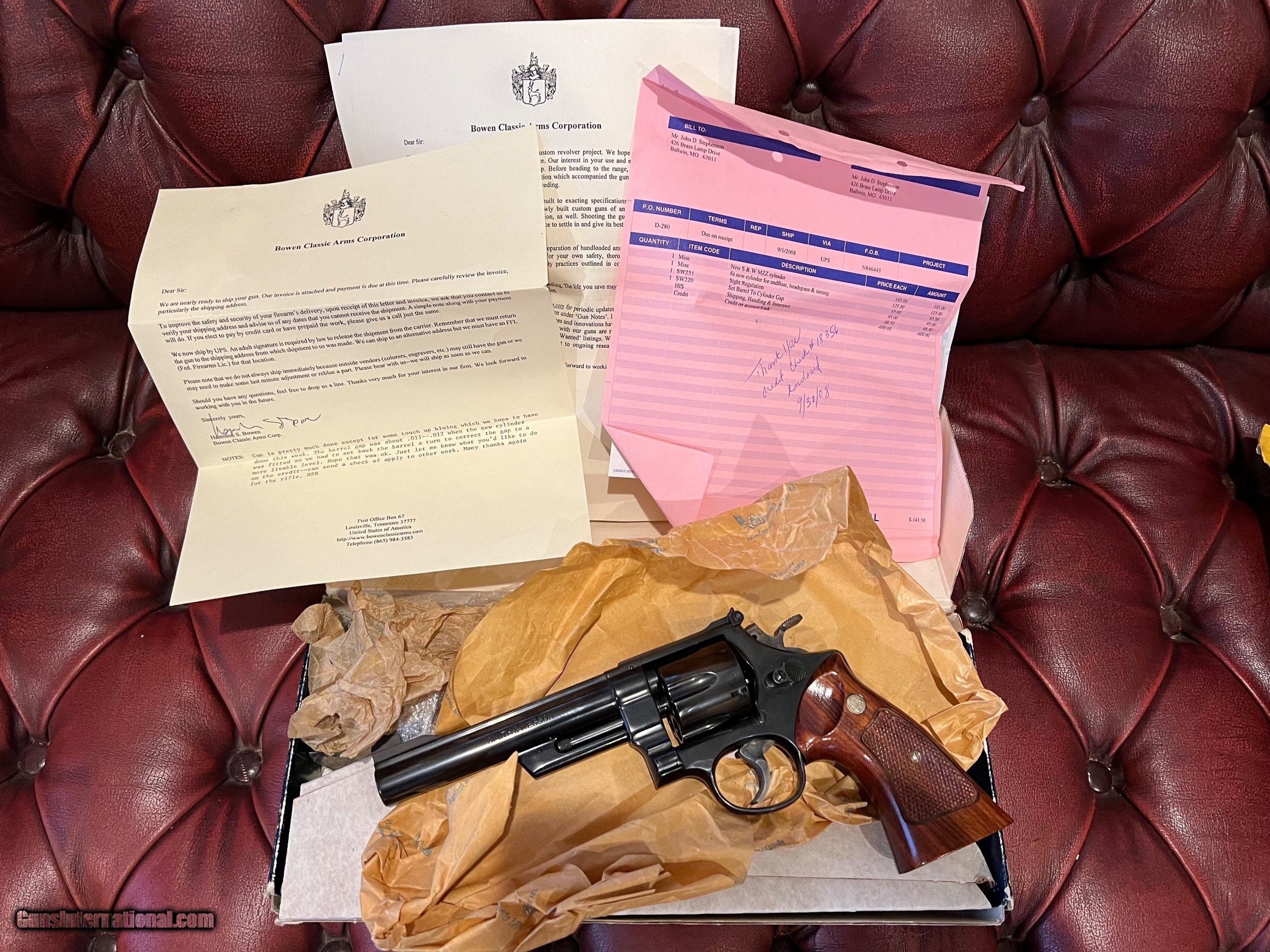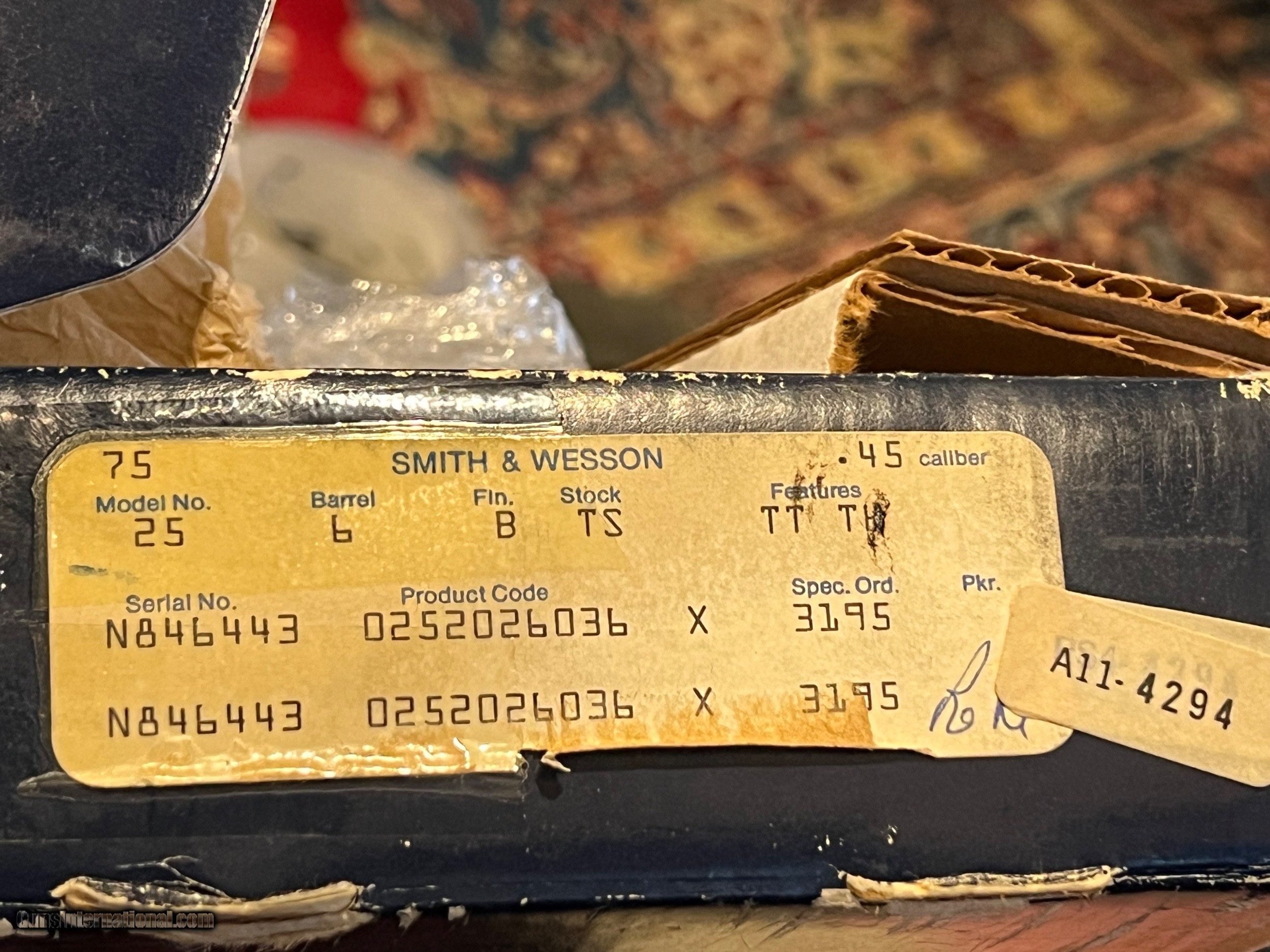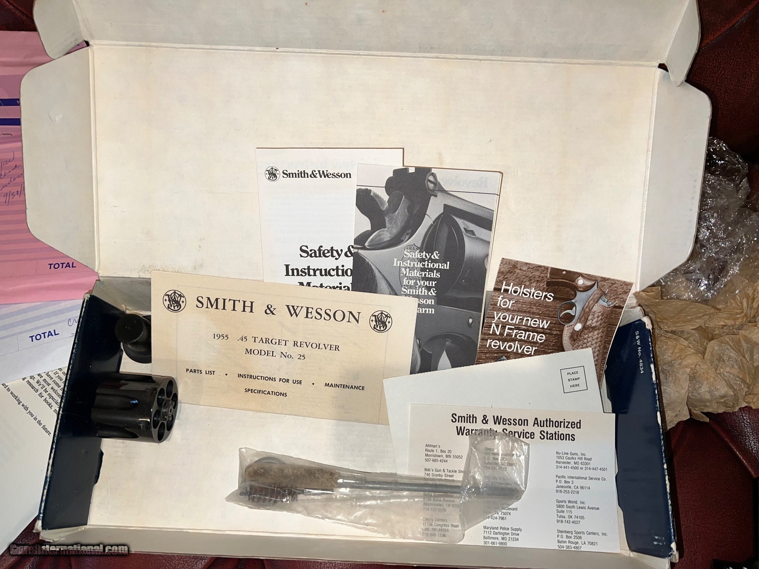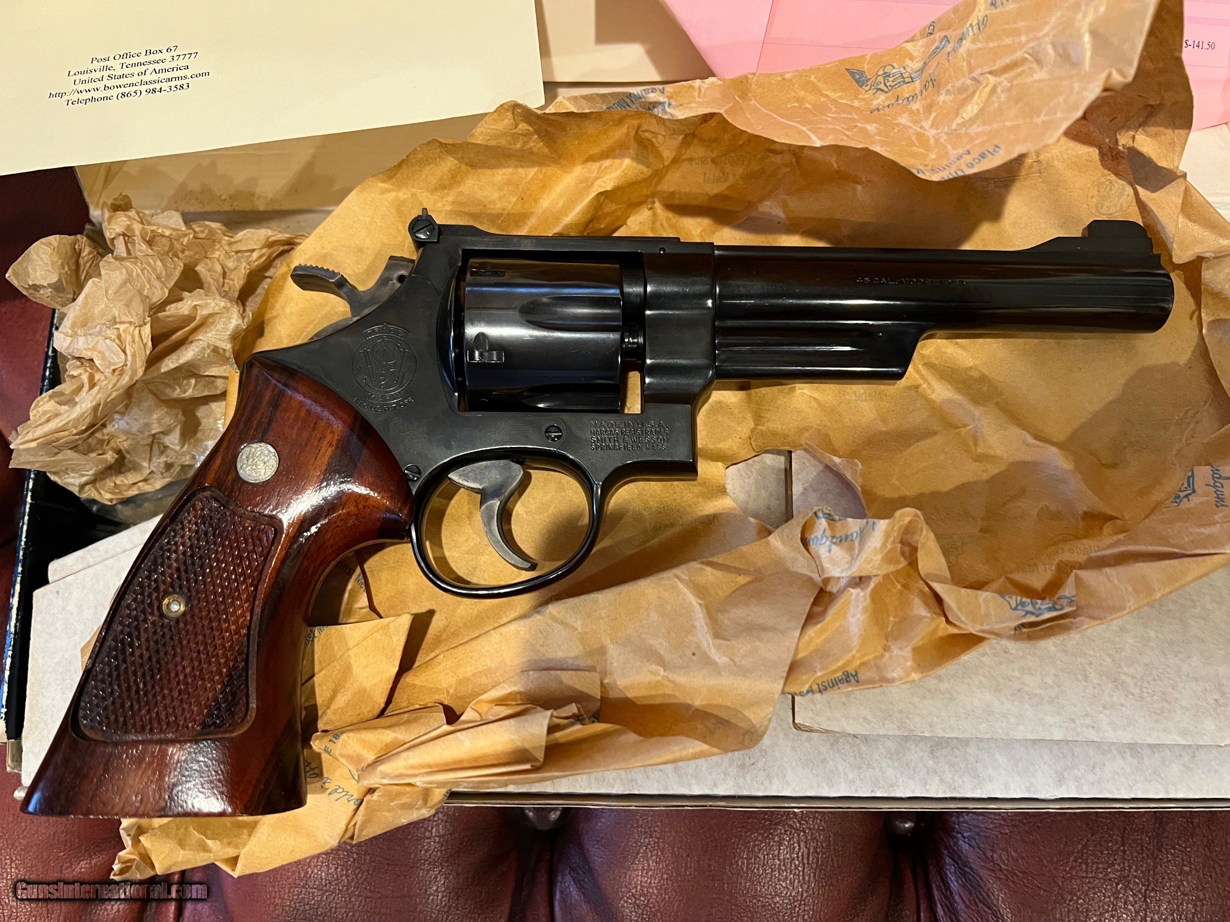 Description: Smith & Wesson Model 25-2 6" with box, extra cylinder, as accurized by Bowen Classic Arms. All paper work and receipts from Bowen Classic Arms, and also the original Smith and Wesson box, warranty cards, S&W Holster advertisements, Factory Cleaning tools, and wax paper. It doesn't get better than this: A factory 25-2 with all original documentation, in mint condition, with notations of exact modifications from arguably America's finest pistol smith, that will actually SHOOT ACCURATELY. If you have ever fired the stock 25-2, at least in my experience, they are NOT accurate with factory ammunition because the cylinder throats were so large. If you loaded your own ammunition, you could size your bullets to .455 or .457 maybe, and get them to shoot better. Bowen's shop fabricated a new cylinder, (probably via boring out a smaller bore N Frame cylinder) to approximately .452, re-set the barrel cylinder gap, and then regulated the sights. The original cylinder is included. Gun appears literally unfired since the work was performed. As of this time, I don't believe Bowen Classic arms is performing work on S & W Revolvers, only those made by Ruger, but I may be incorrect as to this. Bowen Classic Arms has done much in the way of work for me over the years, and the quality of their work is unsurpassed in my humble opinion. Gun was NOT re-blued, and , again, it appears virtually new. So if you want a 25-2 that is ACCURATE, don't want to search for your brass as you do with a semi-auto, here is your Revolver. Please feel free to contact me with questions via telephone or email. Please, no texting. Thanks for your interest, and please see my other ads. NO TAX, NO EXTRA FEES. $50. to ship via FedEx, packed carefully. SOLD Handgun Caliber: .45 ACP (.45 Auto), .45 Auto Rim Manufacturer: Smith & Wesson Model: 25-2 Barrel Length: 6 Condition: 99% Metal Condition: 99% Wood Condition: 99% Bore Condition: Mint Action: Double Action Revolver Triggers: Wide Sights: S & W adjustable Extras: Original Cylinder included |