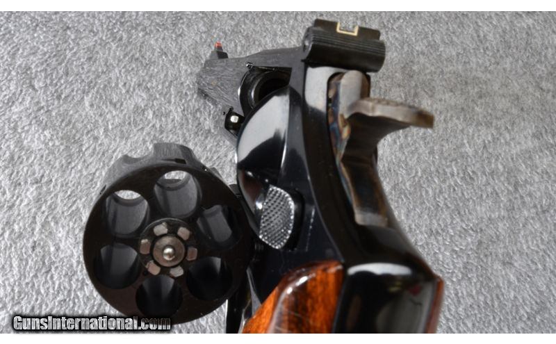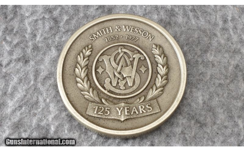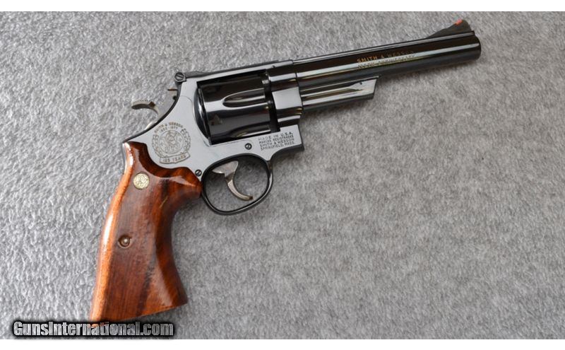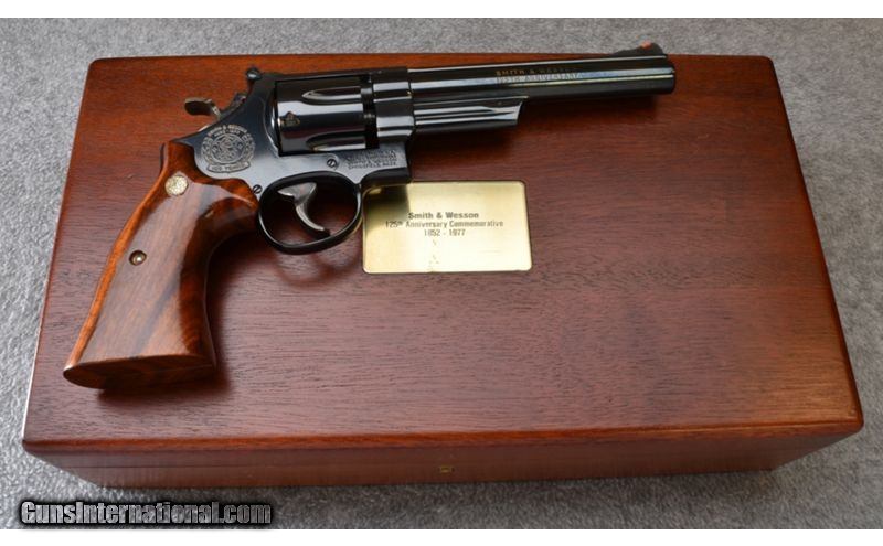 Description: This Smith and Wesson commemorates the 125th anniversary of the 25-3 revolver dating 1852-1977. Gun is in original presentation case and remains excellent. There is some light crazing from age on grips, but blue and bore are both excellent. Complete with presentation case and key, book, and coin. This is a classic handgun! .45 LC SOLD Metal Condition: Excellent Wood Condition: Excellent Bore Condition: Excellent Barrels: 6.5" Half Lug Triggers: Factory Butt Pad: Uncheckered Cocobolo Grips with S&W Medallion Weight: 40 Oz. Sights: Ramp Front Sight with Orange Insert - Adjustable White Outline Square Notch Rear Sight Item Location: Wheeling |