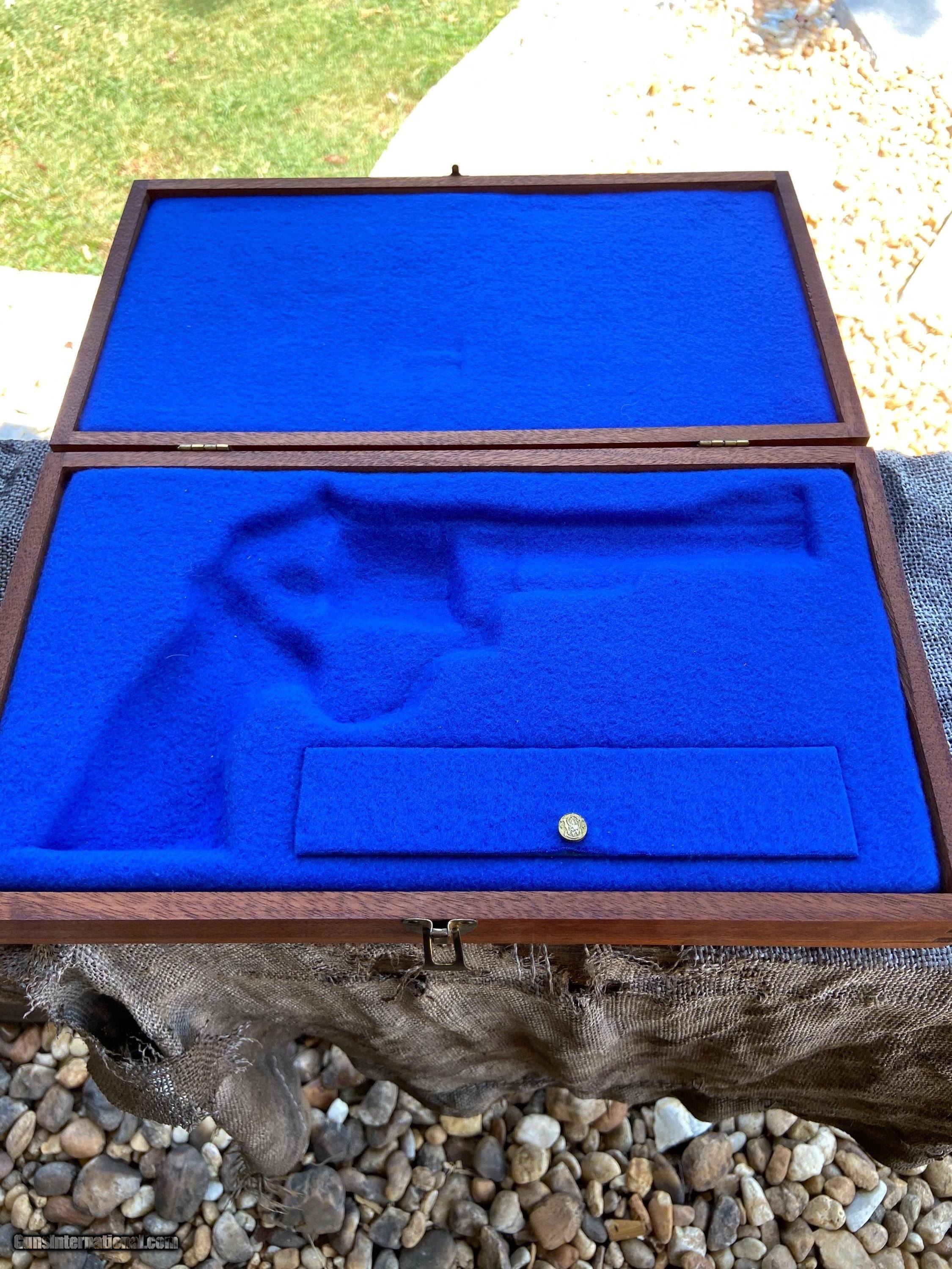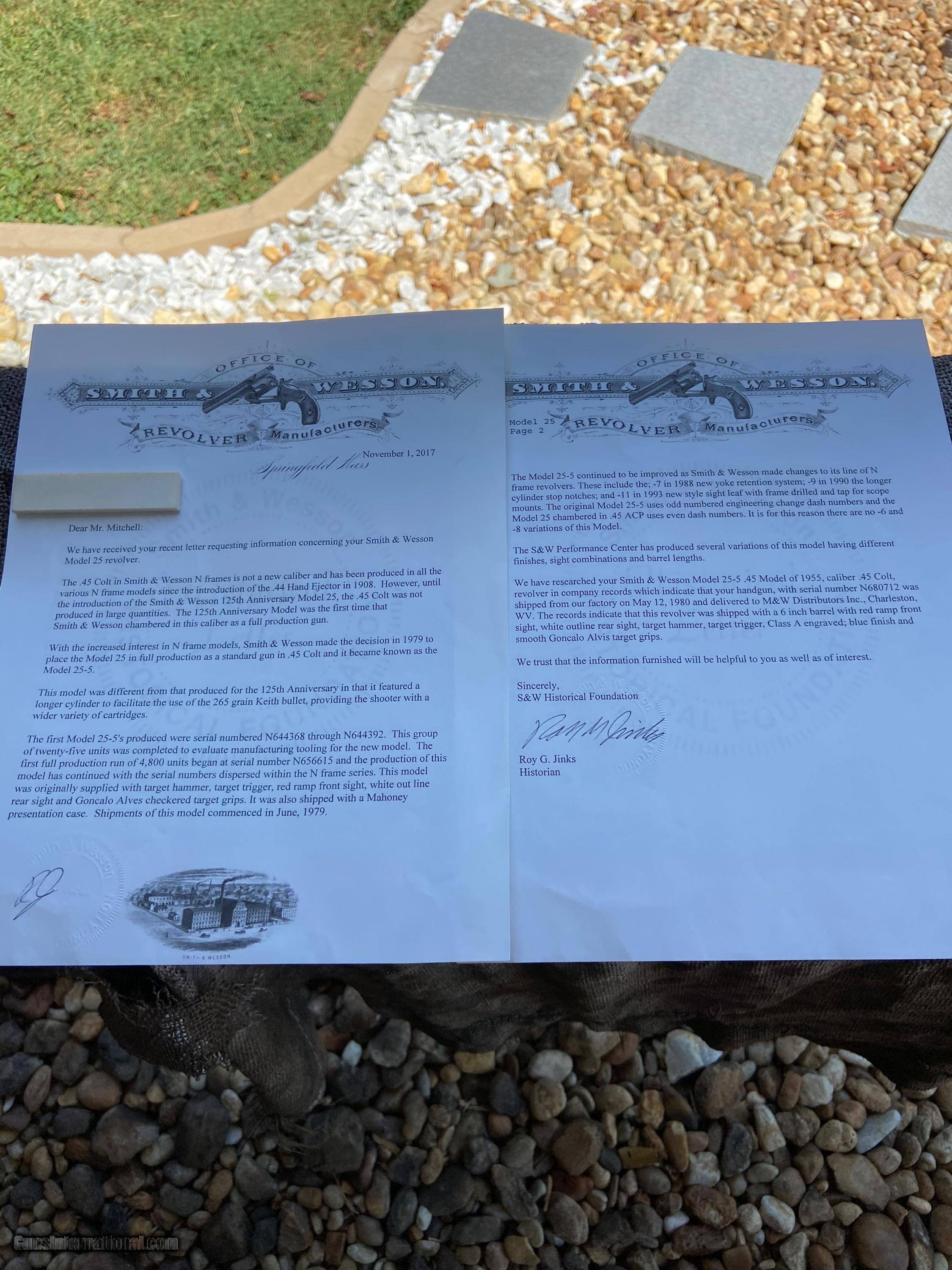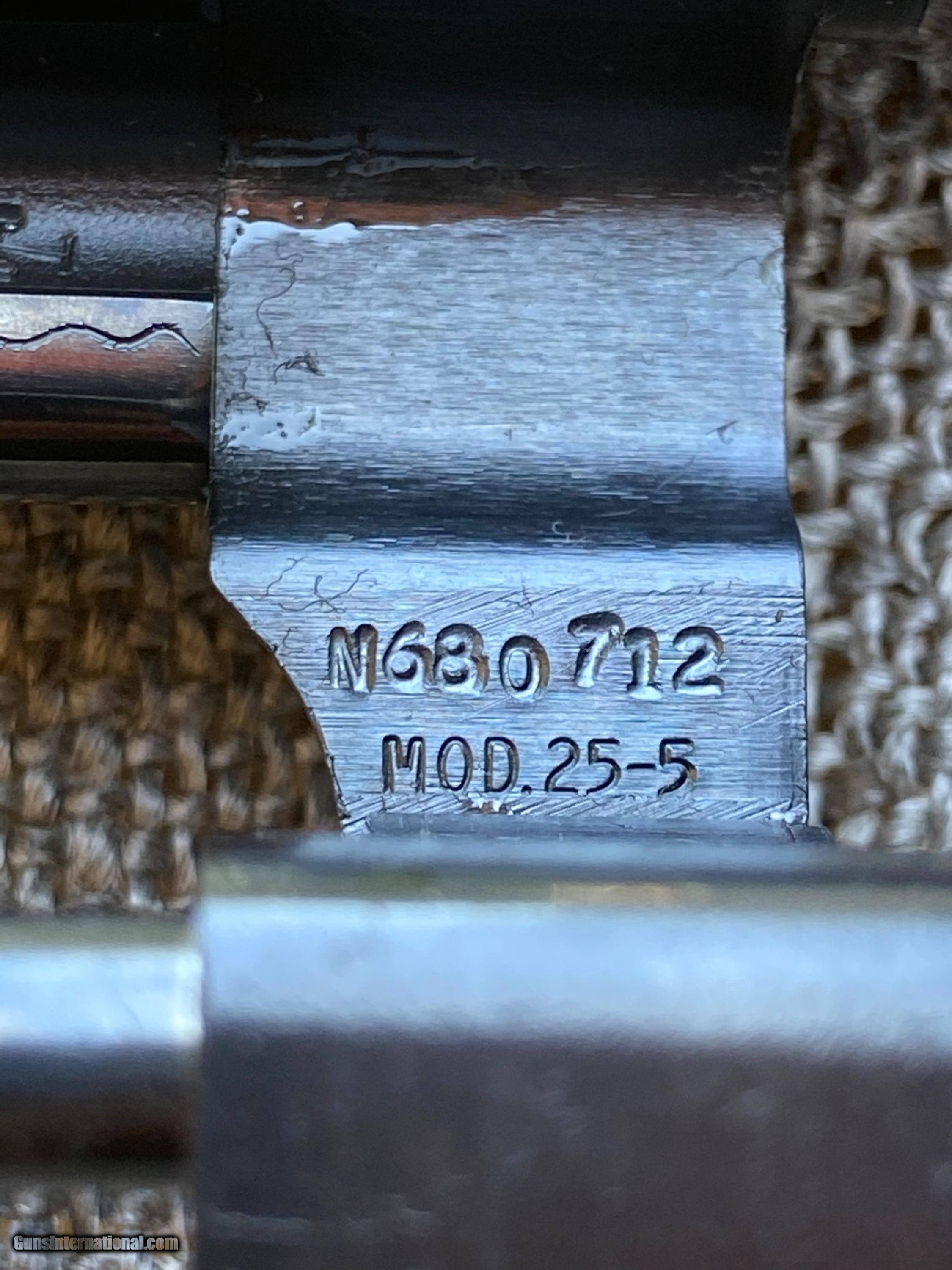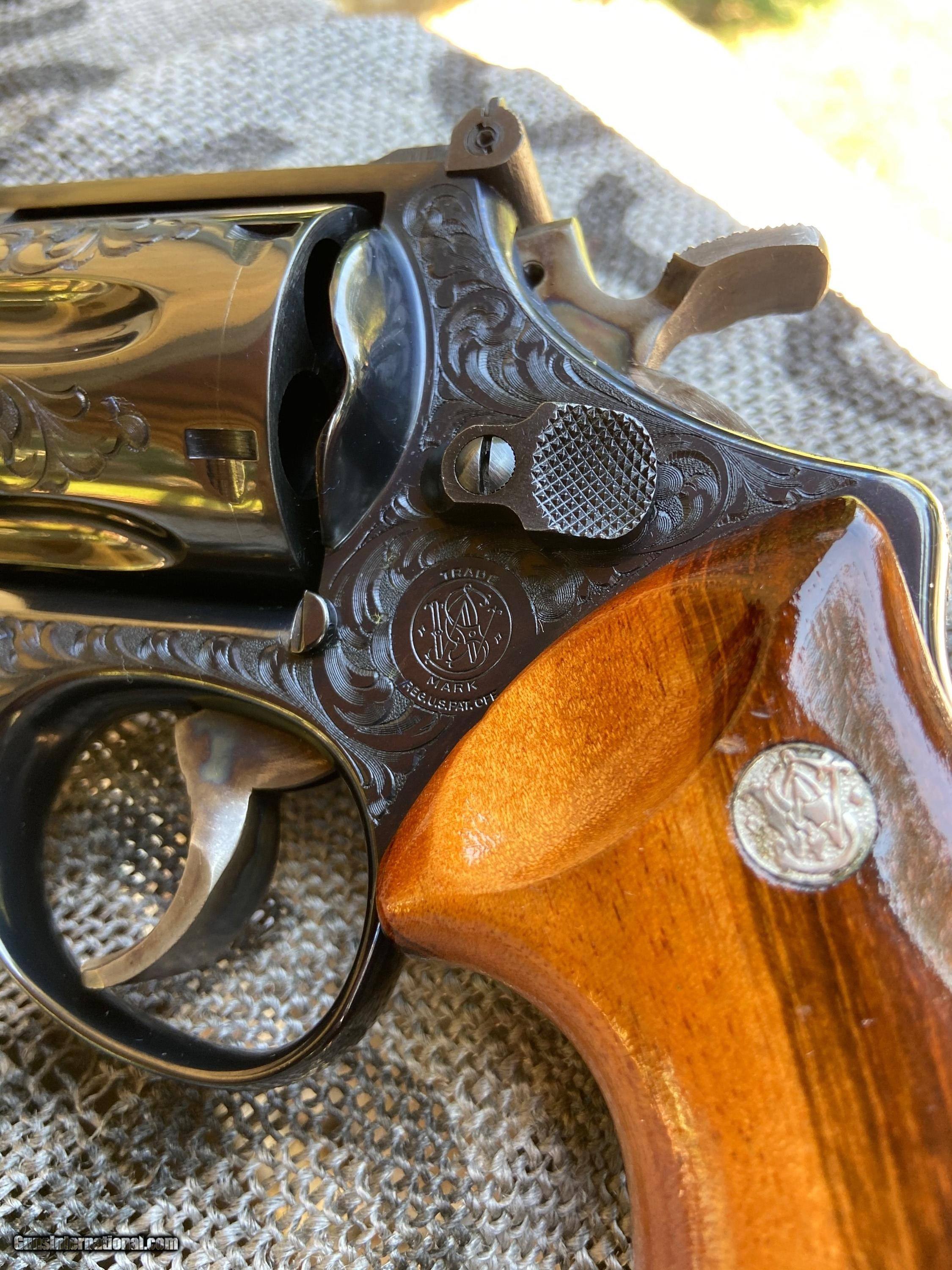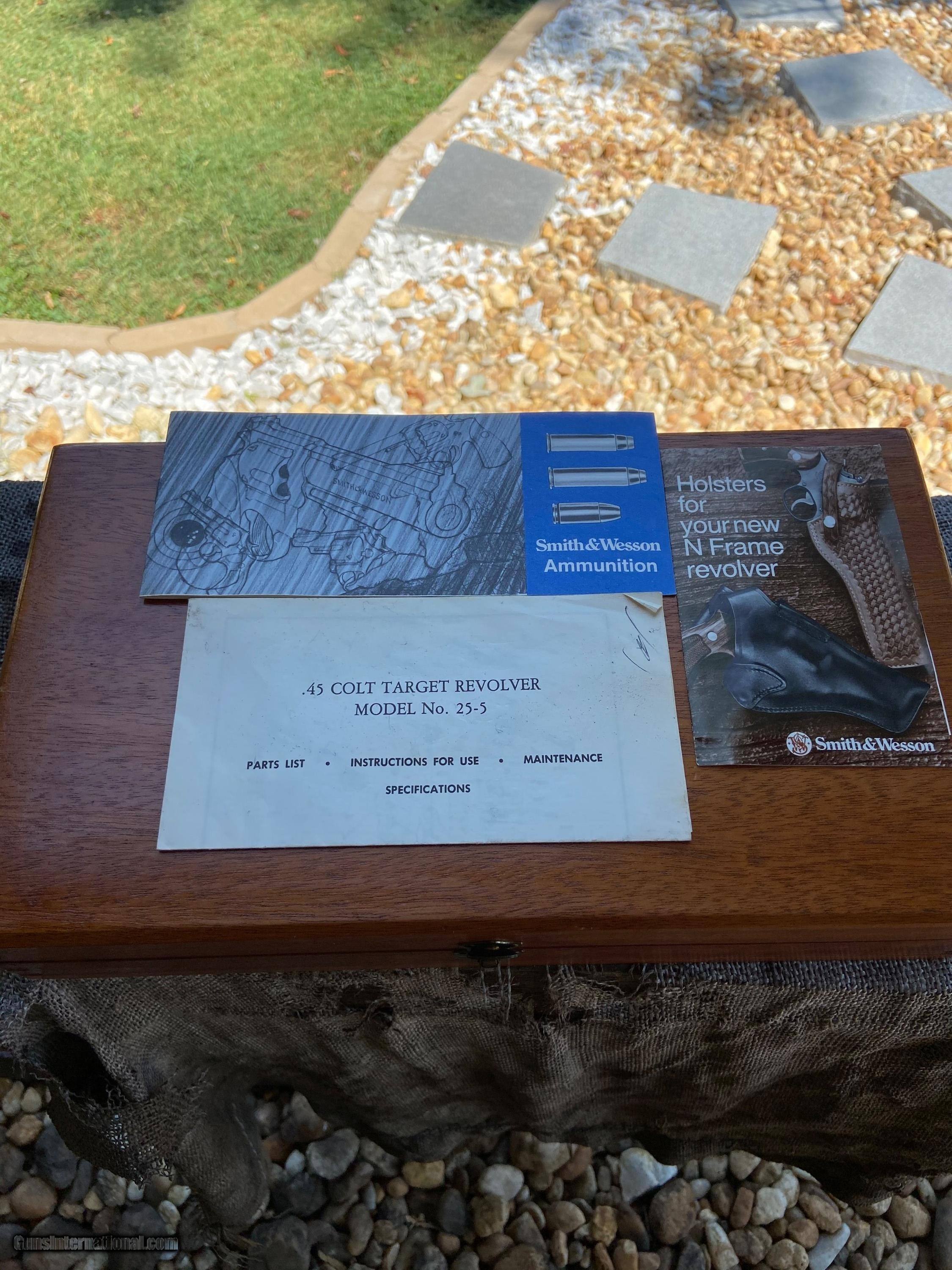Description: Up for sale is a Smith & Wesson 25-5 chambered in the popular .45 Long Colt.Class A factory engraved with beautiful smooth presentation grips.6" pinned barrel.Beautiful presentation case with tools & papers.Smith & Wesson Historian Roy Jinks letter confirming engraving & destination.99+% condition.Collector quality.No international sales.Thanks for looking. SOLD Handgun Caliber: .45 Colt Manufacturer: Smith & Wesson Model: 25-5 Serial Number: N680712 Barrel Length: 6” Condition: Excellent Metal Condition: Excellent Wood Condition: Excellent Bore Condition: Excellent |