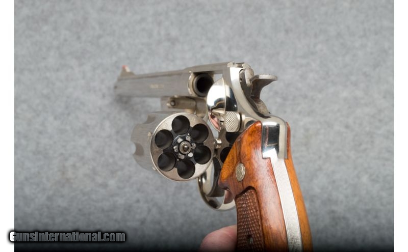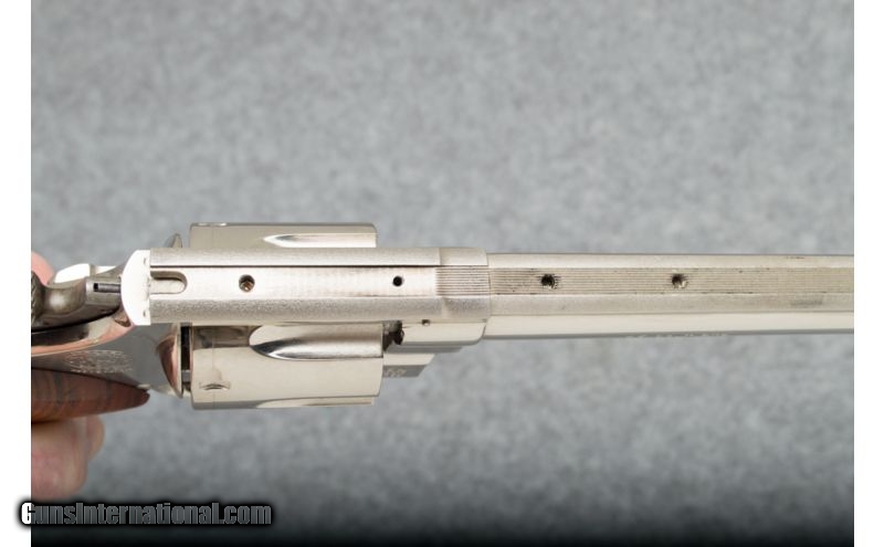 Description: SOLD Caliber Info: .45 Colt Metal Condition: Very good, overall; rib has been drilled & tapped Wood Condition: Good; a few handling marks Bore Condition: Clean and sharp Barrels: 8 3/8" - ported Triggers: Wide, grooved target style Stock: Checkered wood with S&W Medallion Weight: 48 oz. Sights: Missing rear sight; red ramp front Item Location: Sun Prairie, WI |