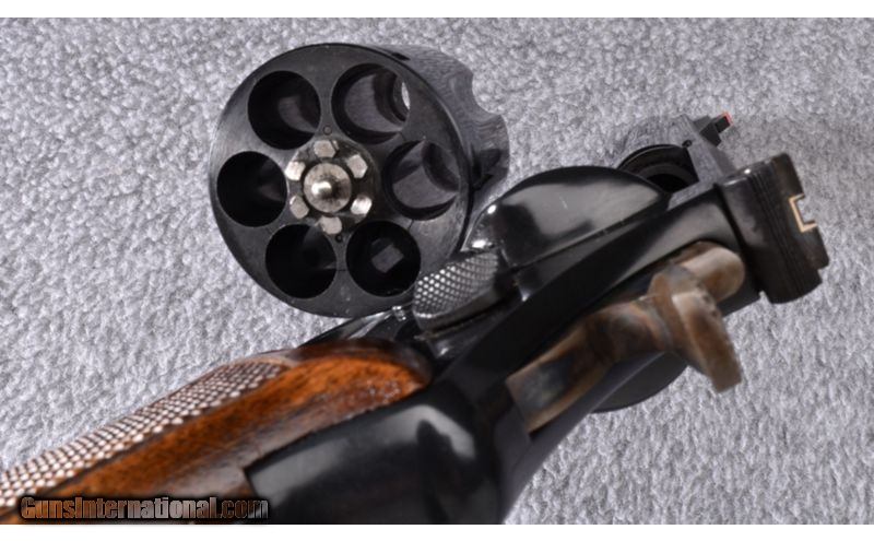 Description: This Model 25-5 remains in excellent condition showing only light use and handling marks. Light drag ring visible on cylinder. Grips are also in good condition and are not original. Original wood display box but no tools. .45 Long Colt SOLD Metal Condition: Excellent Wood Condition: Excellent Bore Condition: Excellent Barrels: 4" - 3/4 Lug Triggers: Wide Target Trigger - Wide Target Hammer Fore End: Checkered Walnut Grips Weight: .40 oz. Sights: Blade Front with Orange Insert - Adjustable White Outline Square Notch Rear Item Location: Wheeling |