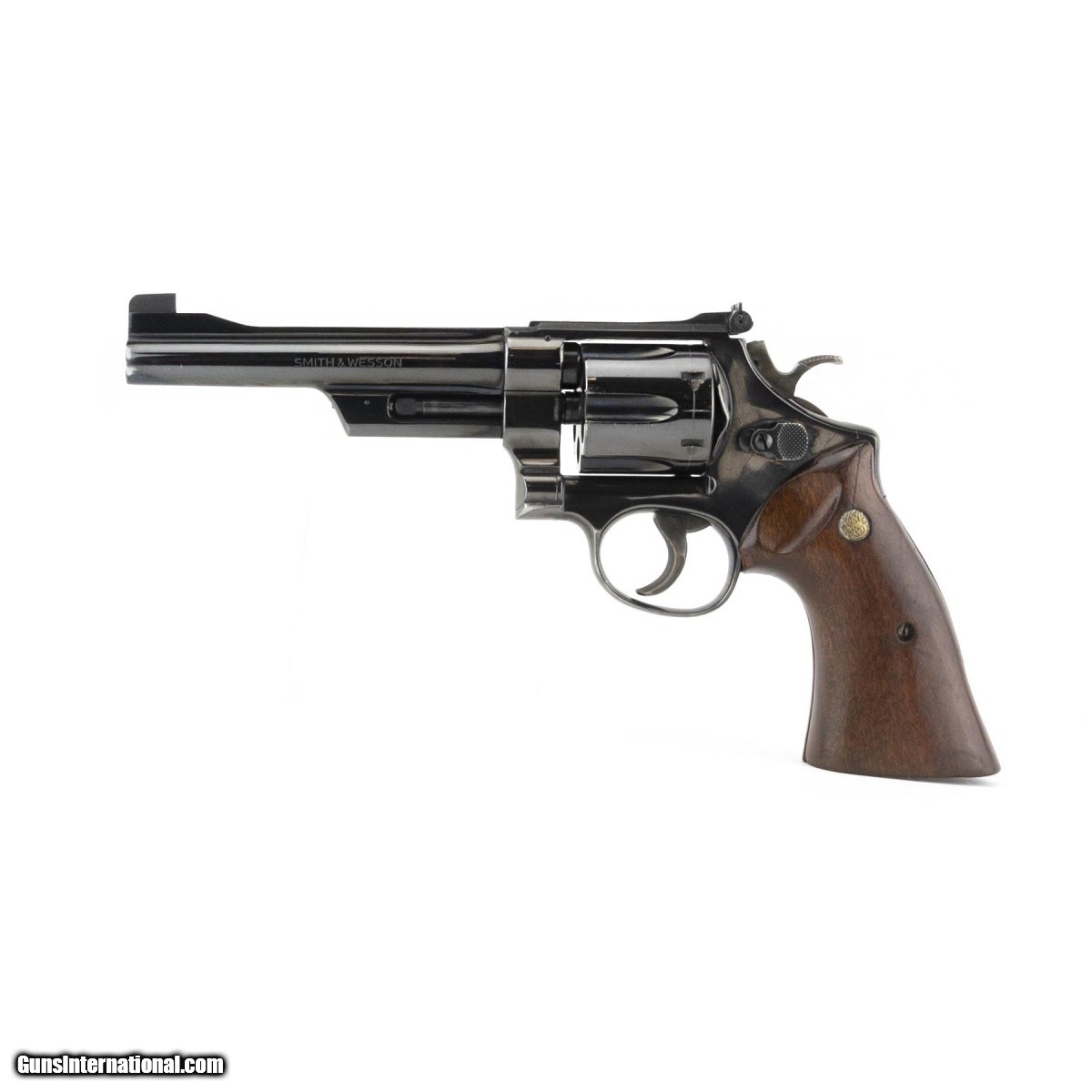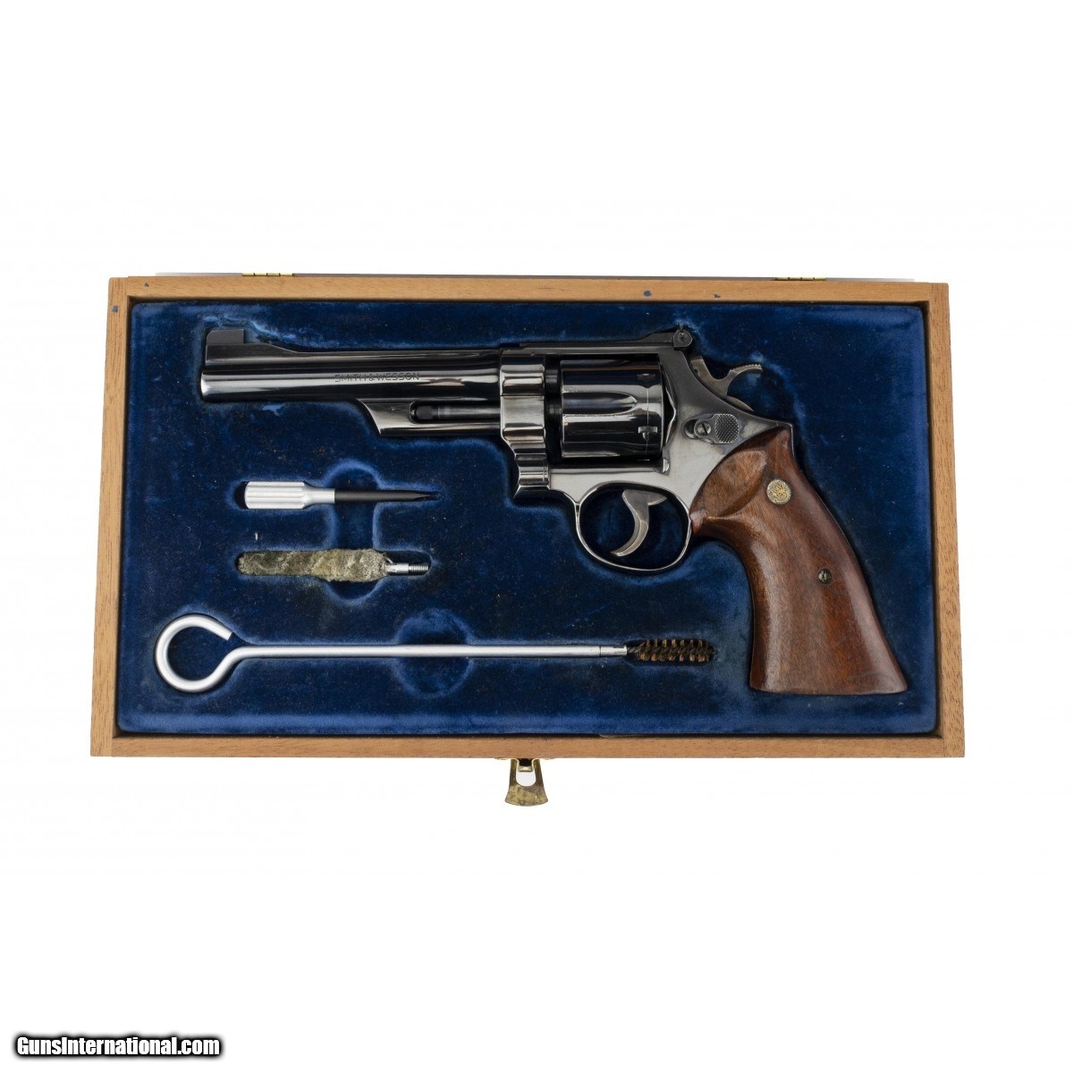 Description: " 6"" blue model with pinned barrel and recessed cylinder. 1970's vintage. Has about 95% blue with some muzzle and edge wear. Comes in a factory wood presentation case with tools. SOLD |