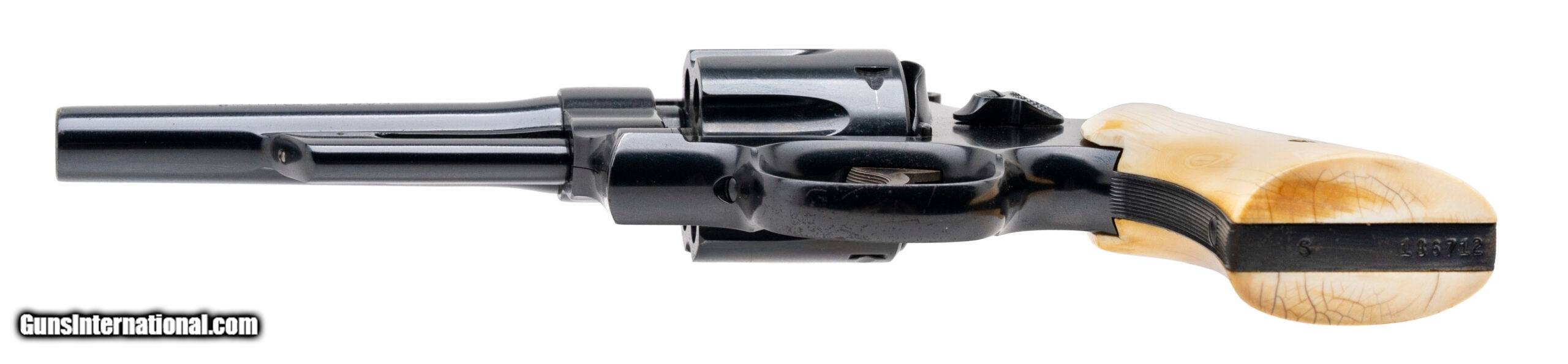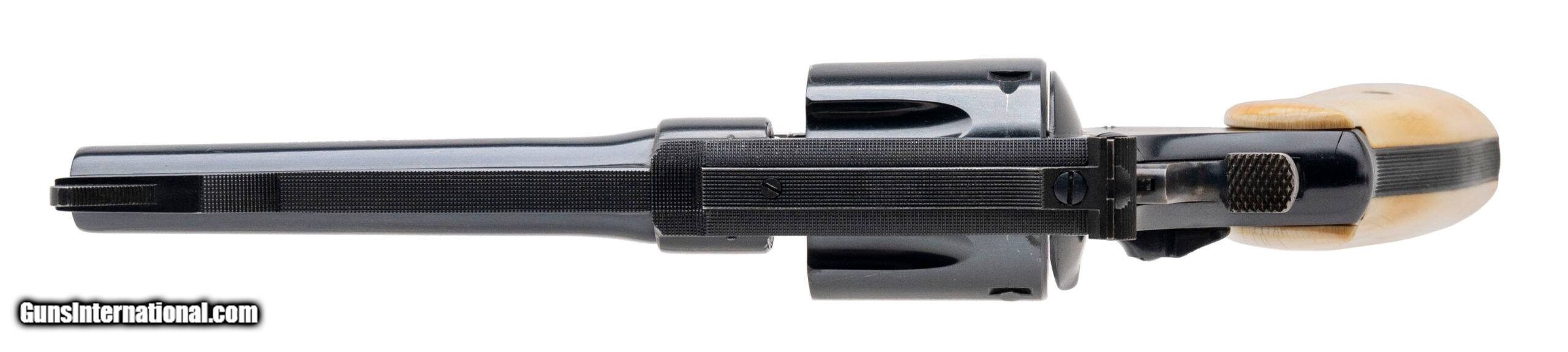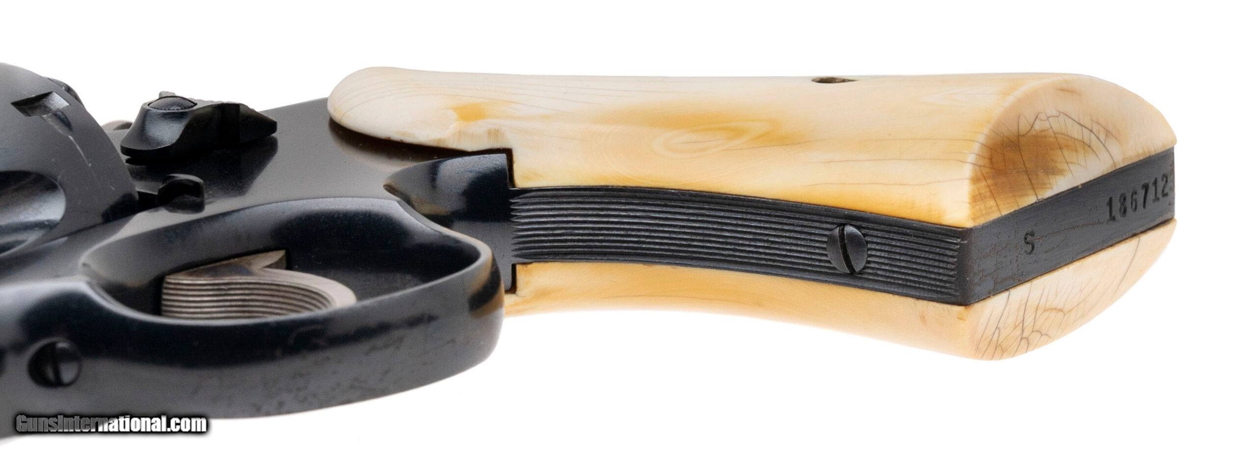 Description: "SN: S186712. Made circa late 1950's. .357 magnum with a 5"" pinned barrel. Bore is bright with strong rifling. Blued double action no dash S&W revolver with pinned barrel and recessed cylinder. Finish is in very good condition with a light blemish noted on the cylinder and is adorned with beautiful ivory stocks. Ivory grips are in excellent condition with a yellow patina. Overall very good condition. Price: $1,995.00 Contact Seller |