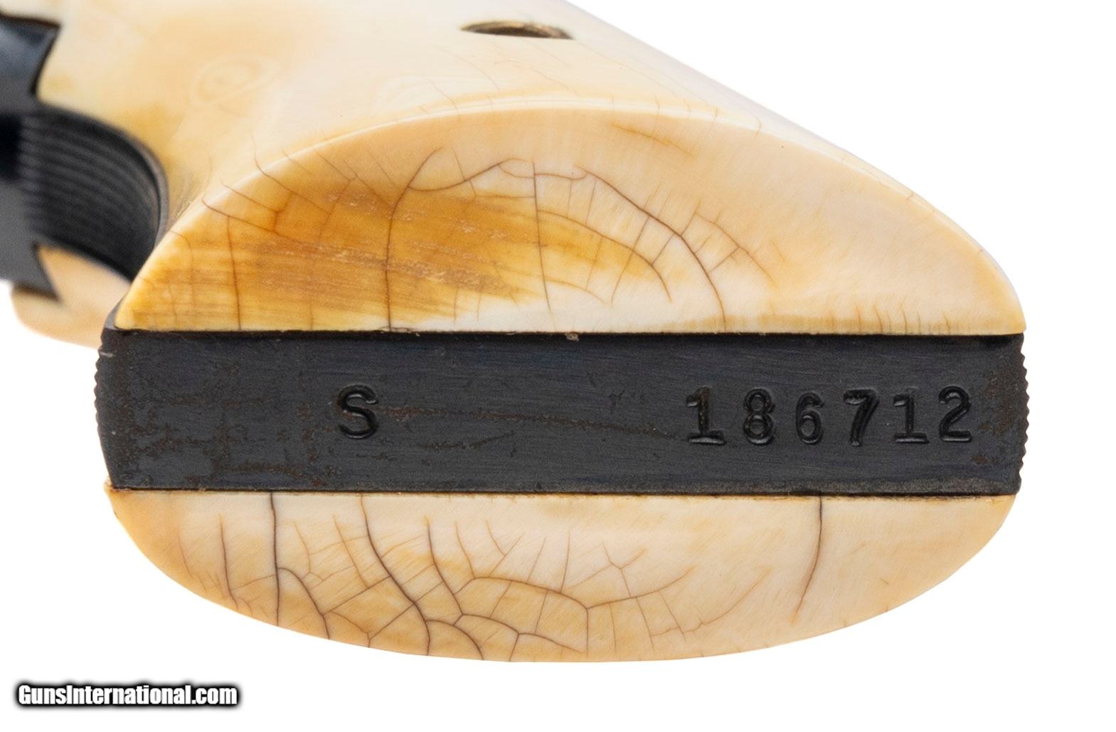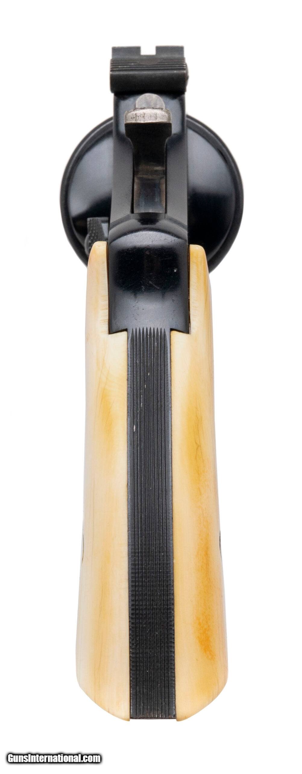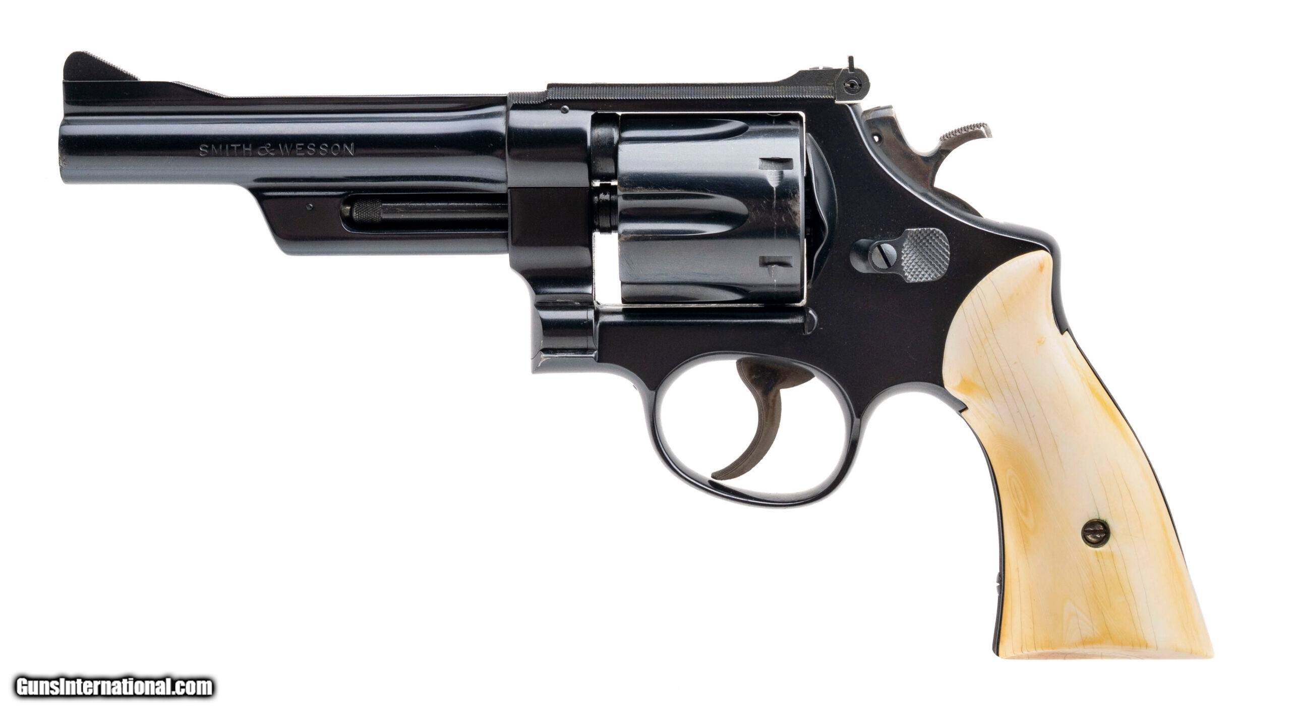 Description: "SN: S186712. Made circa late 1950's. .357 magnum with a 5"" pinned barrel. Bore is bright with strong rifling. Blued double action no dash S&W revolver with pinned barrel and recessed cylinder. Finish is in very good condition with a light blemish noted on the cylinder and is adorned with beautiful ivory stocks. Ivory grips are in excellent condition with a yellow patina. Overall very good condition. Price: $1,995.00 Contact Seller |