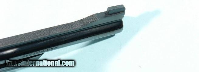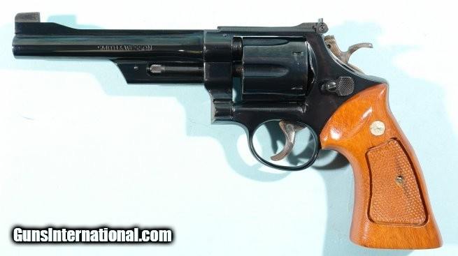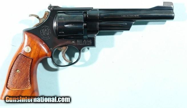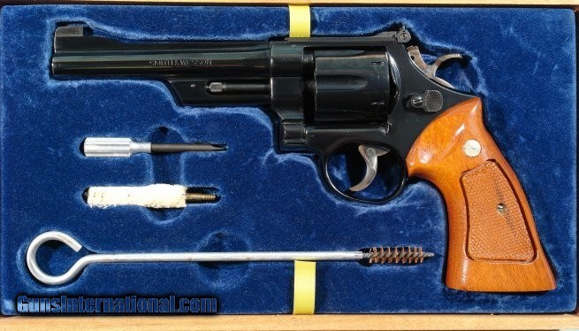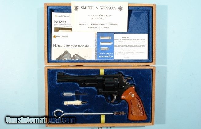 Description: 1976 CASED MINT SMITH & WESSON MODEL 27 2 OR 27-2 .357 MAGNUM 6" BLUE PINNED BARREL REVOLVER. Mint in original factory presentation case with cleaning rod, brush and swab, screw driver, original shipping paper, warranty card and correct manual/promo material. Like new condition to finish overall as well as factory grips. Screws unturned. Deep case colors on wide hammer and trigger. Factory sights with serrated top strap, sight rib and barrel rib. Front partridge correct as well. Prime example never been used nor carried with 100% finish brilliant. SOLD |