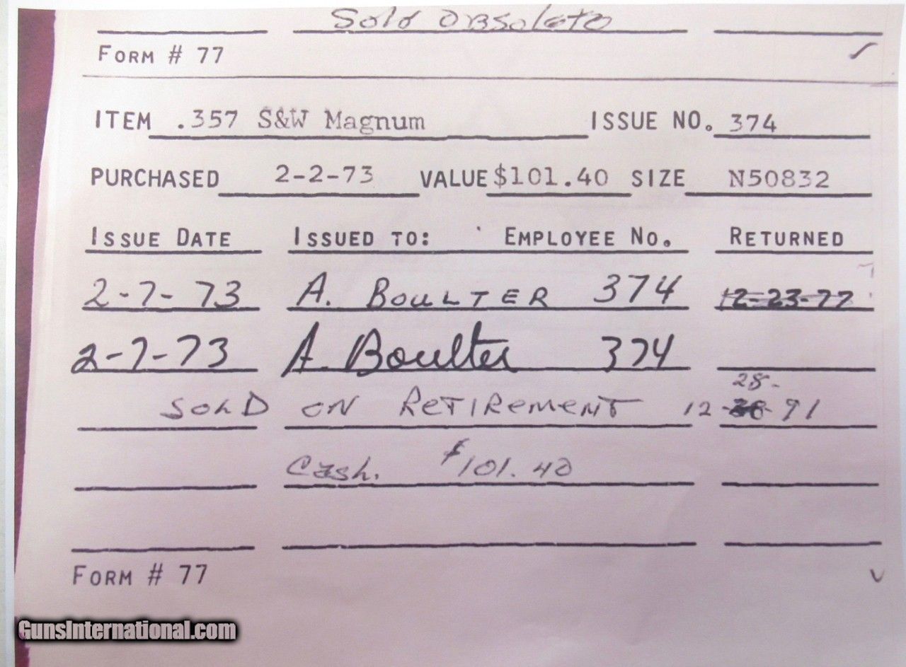 Description: SOLD TO STEVE IN ARIZONA...S&W Model 27-2 Revolver; Serial No. N50832; .357 Magnum Caliber; 3 ½” Barrel; Left Side of Receiver Marked “Austin P.D. 374”; Texas Shaped Retirement Plaque with A.P.D. Sergeant Badge Included; Revolver Issued to Sergeant A. William Boulter in 1973 and Sold to Officer Upon Retirement in 1991 (See Documentation); Nearly All Metal Finish Present; Nice Checkered Wood Grips; Perfect Action; Strong Shiny Bore; See All Photos for Condition; No Texts; Call (254)541-5765 or Email Only; PERSONAL PROPERTY of Harold Wieser; NOTICE: We Do Not Do Any Consignments - All Items Listed are Owned by Us - NO SALES to New Jersey or New York City - Antiques Only to Massachusetts and California; Price: $1,975 + $45 S&H Via USPS PRIORITY MAIL; Payment Address: Harold Wieser - 1466 U.S. Hwy 77 - Rosebud, TX 76570; SEND PAYMENTS VIA USPS PRIORITY MAIL; BEWARE of SCAMS!!! – DO NOT SEND MONEY or CORRESPONDENTS ELECTRONICALLY UNLESS YOU HAVE SPOKEN to HAROLD WIESER FIRST! 254-541-5765 SOLD Manufacturer: Smith & Wesson Model: 27-2 Serial Number: N50832 |
