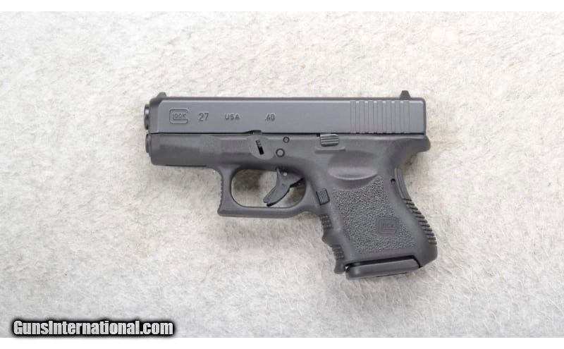 Description: This Glock Model 27 is a right hand semi-auto pistol in .40 S&W Cal. It has a 3.25 inch barrel with a rear serrated slide. A blade front sight and notch rear sight with white highlights. The grip is a textured black polymer. .40 S&W SOLD Chambers: 9 shot magazine. Metal Condition: Excellent. Bore Condition: Excellent. Barrels: 3.25 inch barrel with a rear serrated slide. Weight: 22 oz. Sights: Blade front. Notch rear. White highlights. Item Location: Richfield, WI |