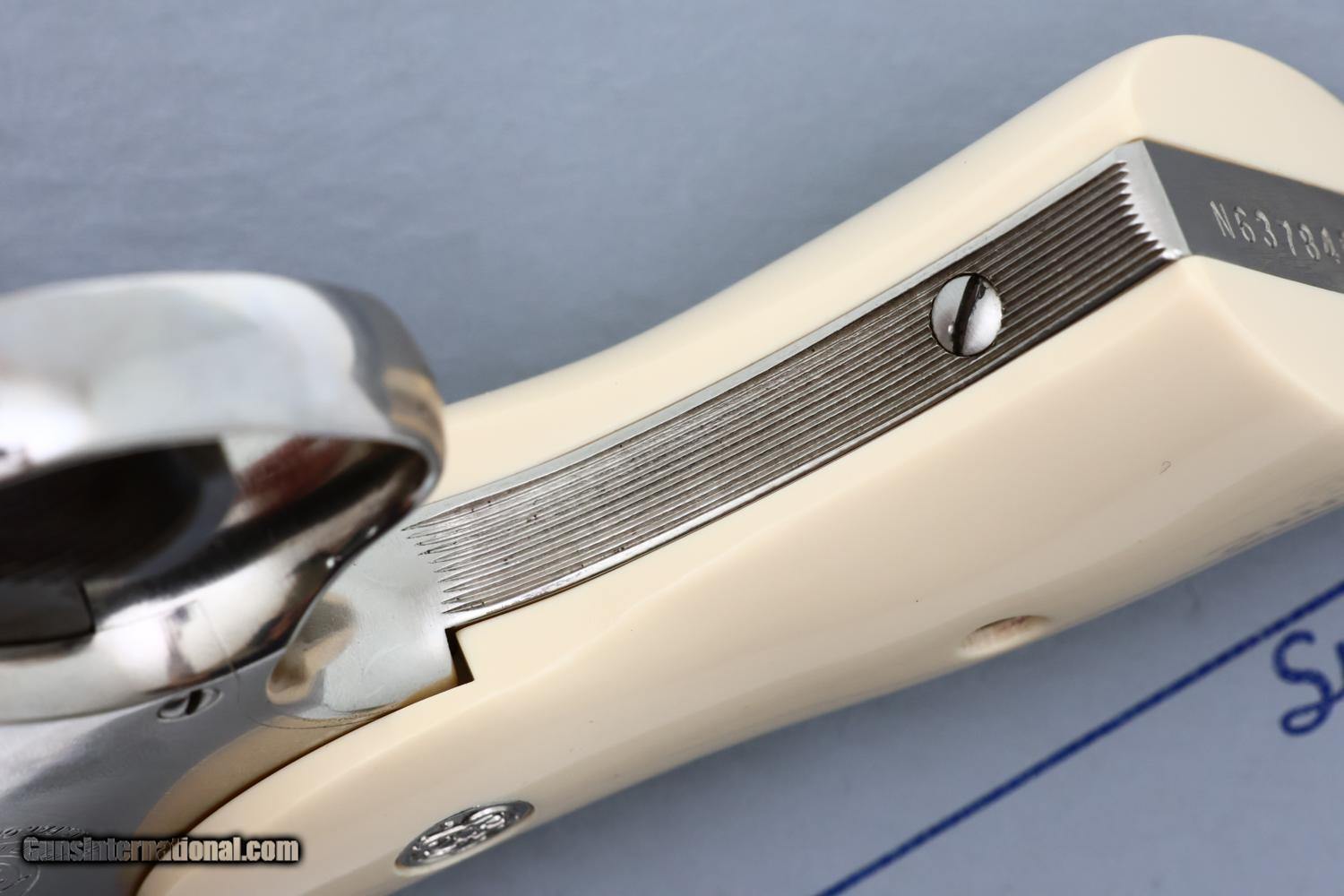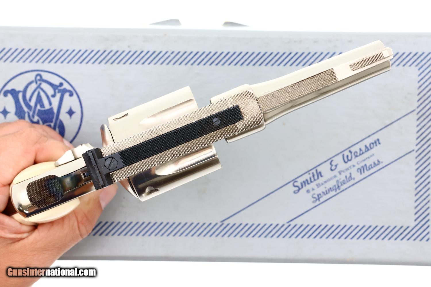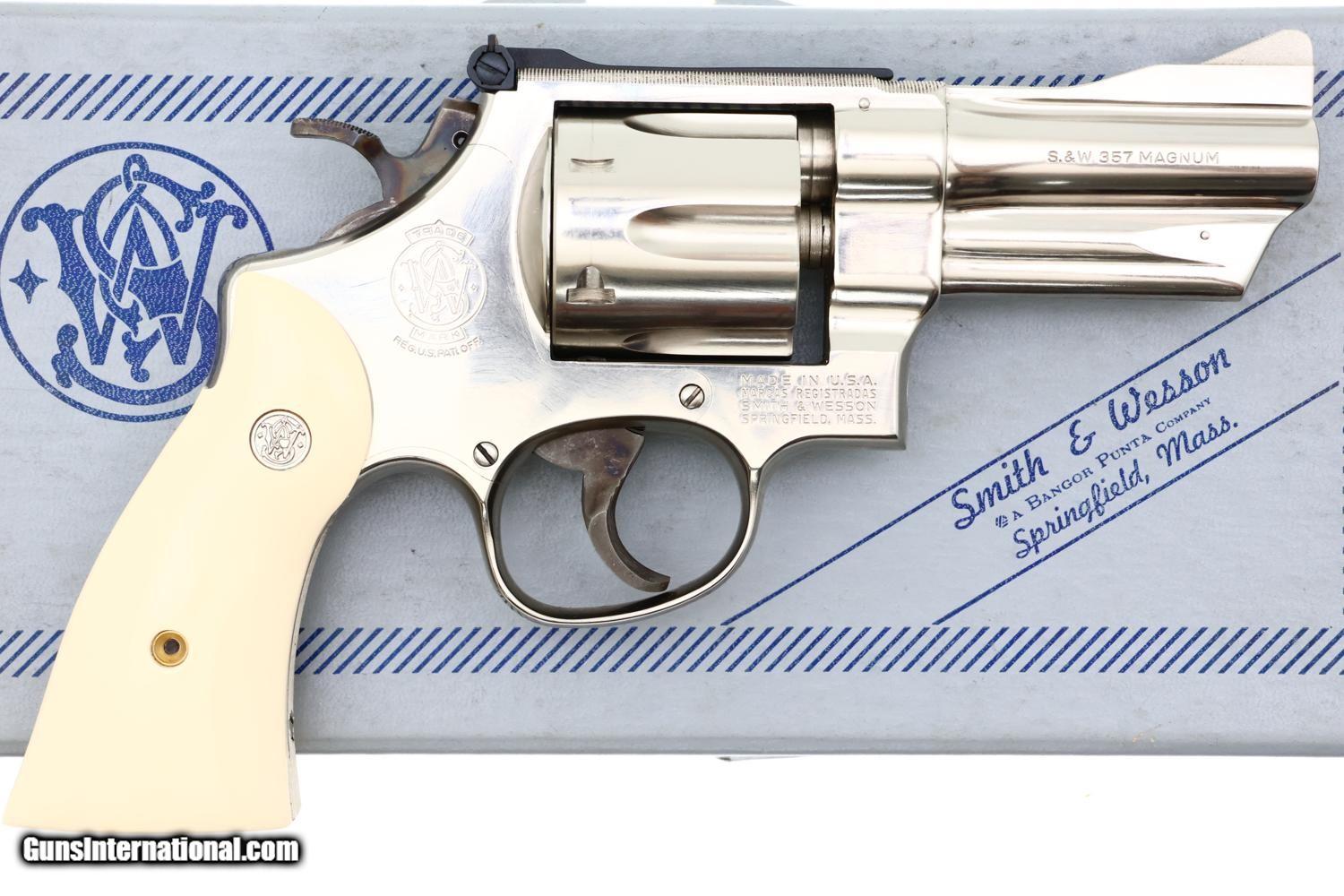 NEAR NEW Smith & Wesson Model 27-2 .357 Magnum revolver with 3.5" barrel in factory nickel finish, complete with original box, literature, accessories, and faux ivory S&W logoed grips.