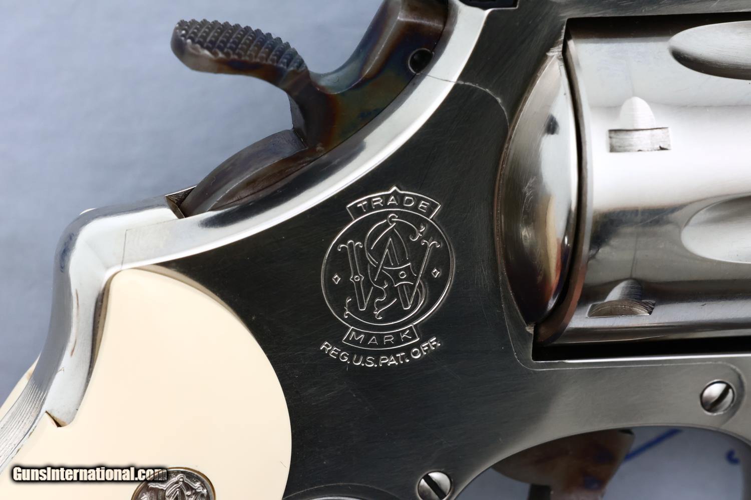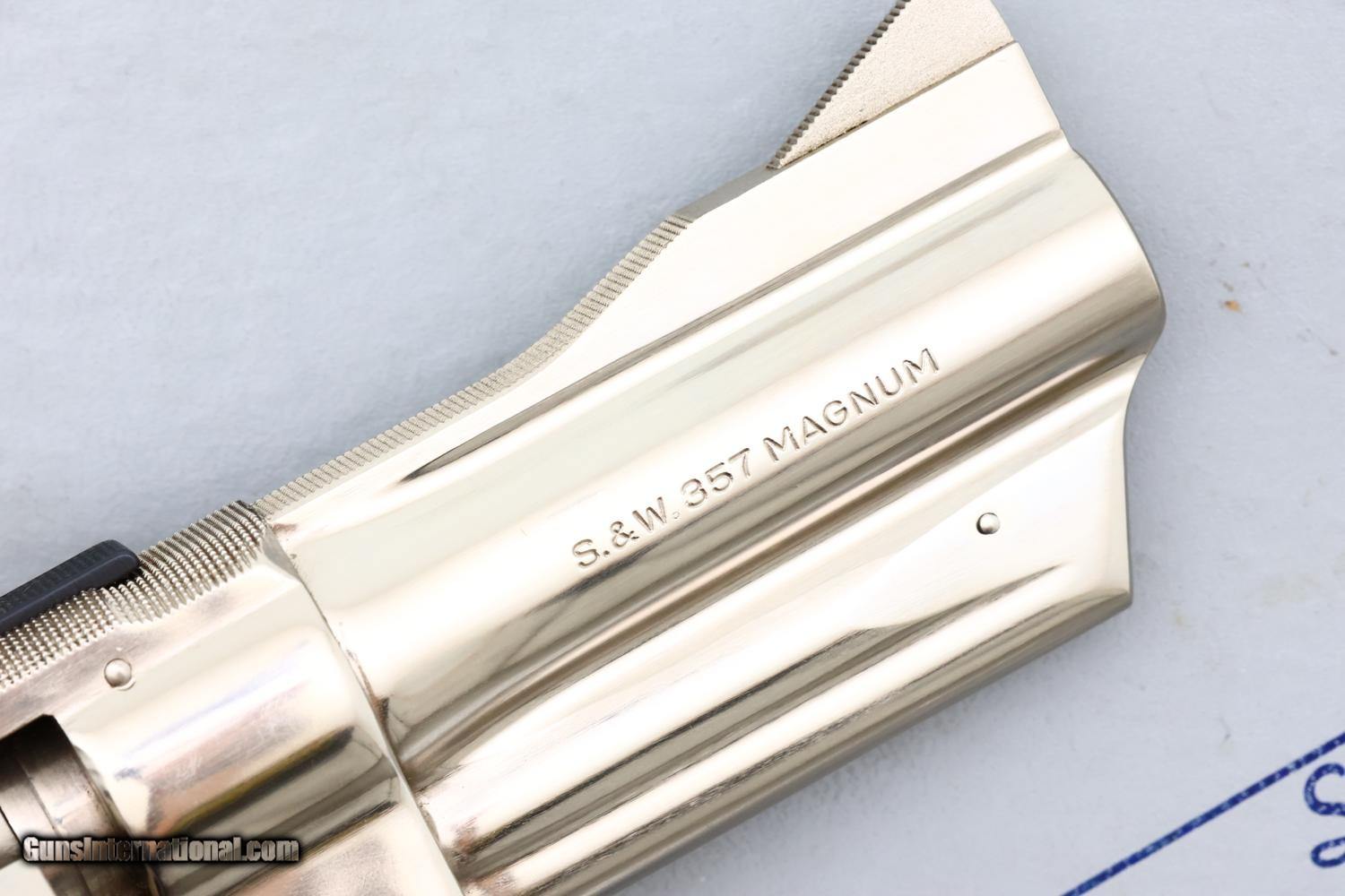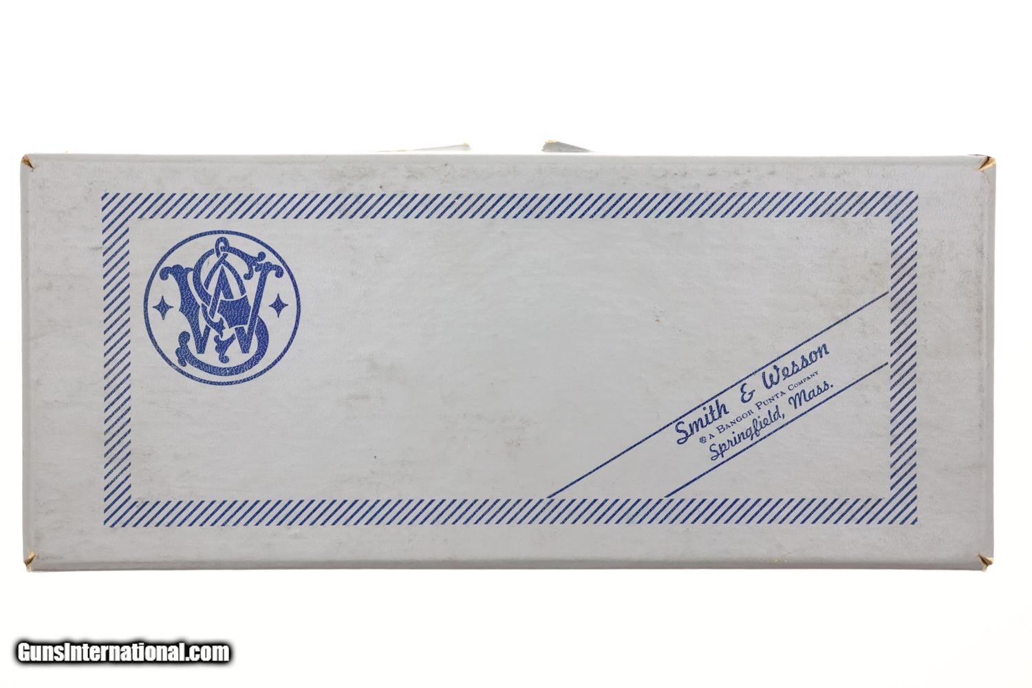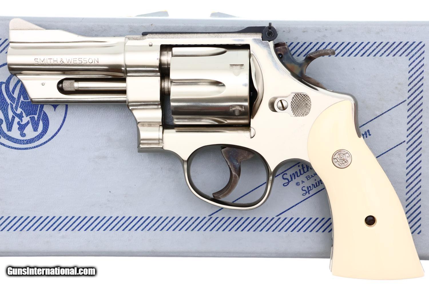NEAR NEW Smith & Wesson Model 27-2 .357 Magnum revolver with 3.5" barrel in factory nickel finish, complete with original box, literature, accessories, and faux ivory S&W logoed grips.