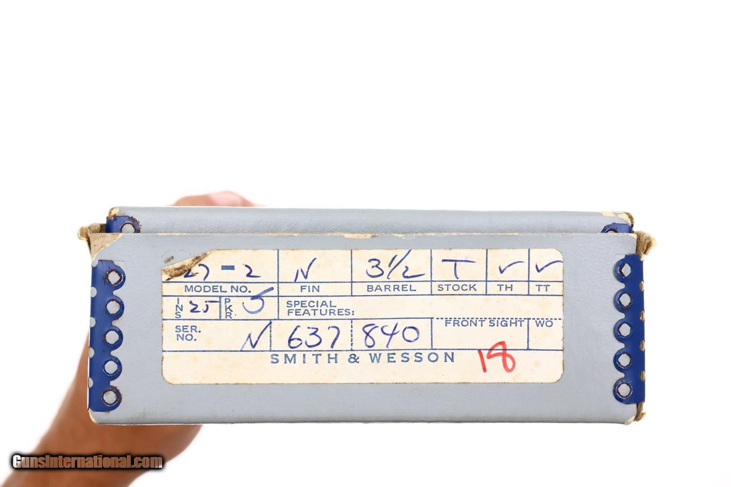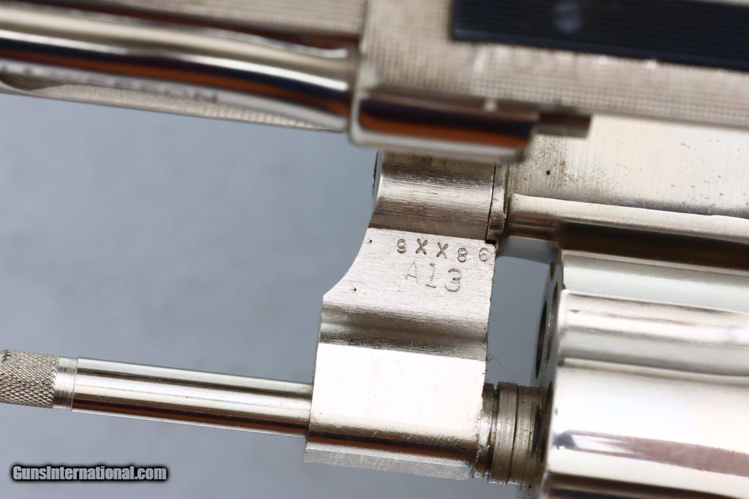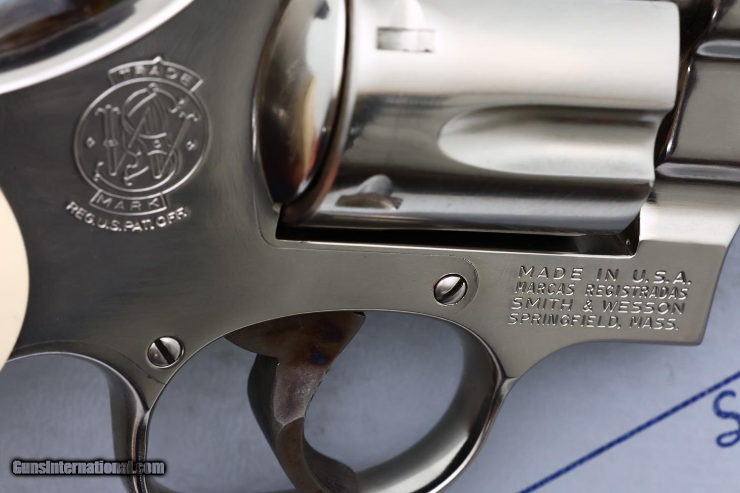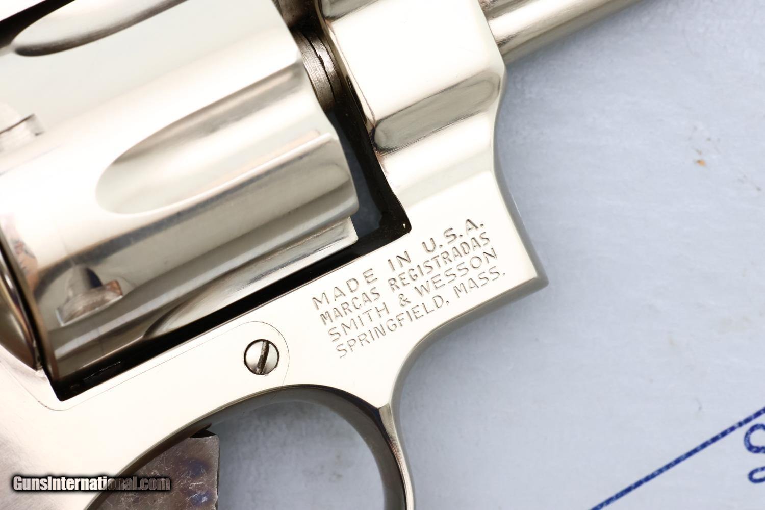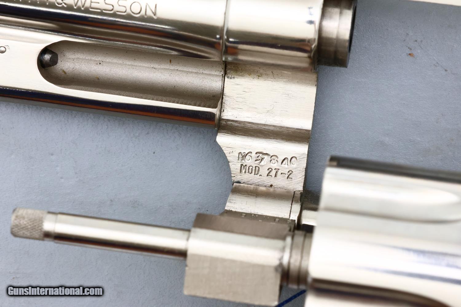 Standard configuration factory nickeled 6-Shot S&W M27-2 revolver (cal. .357 Magnum) with 3.5 inch barrel having serrated ramp front sight, fully adjustable rear sight, and 3 screw N frame fitted with target style hammer and trigger. Left side of the barrel marked “SMITH & WESSON” while right side of barrel is marked “S. & W. 357 MAGNUM”. Sideplate with S&W logo. Right side of frame marked with the usual S&W address and “MADE IN USA”. Full serial number and model inside the crane with serial number repeated on butt. Shown with the faux ivory S&W grips; the original Goncalo Alves target grips with football cutout included. Complete in original silver and blue S&W shipping box with end label referencing make, caliber, and finish. Accessories include factory literature and cleaning implements.