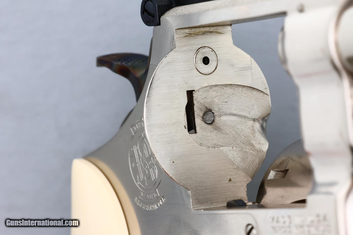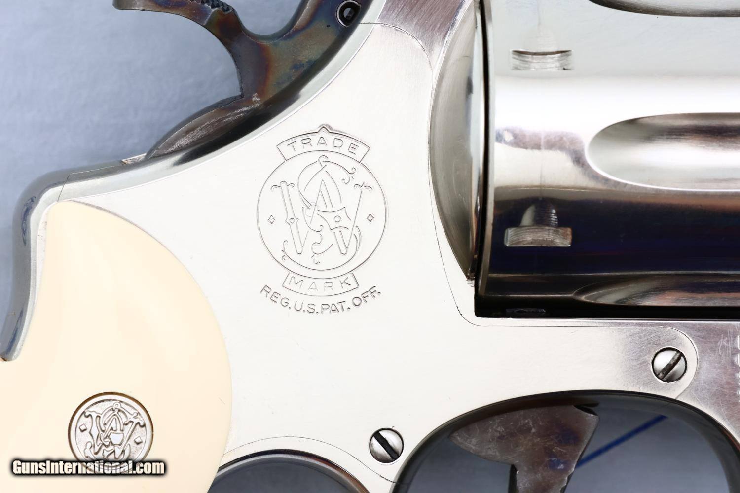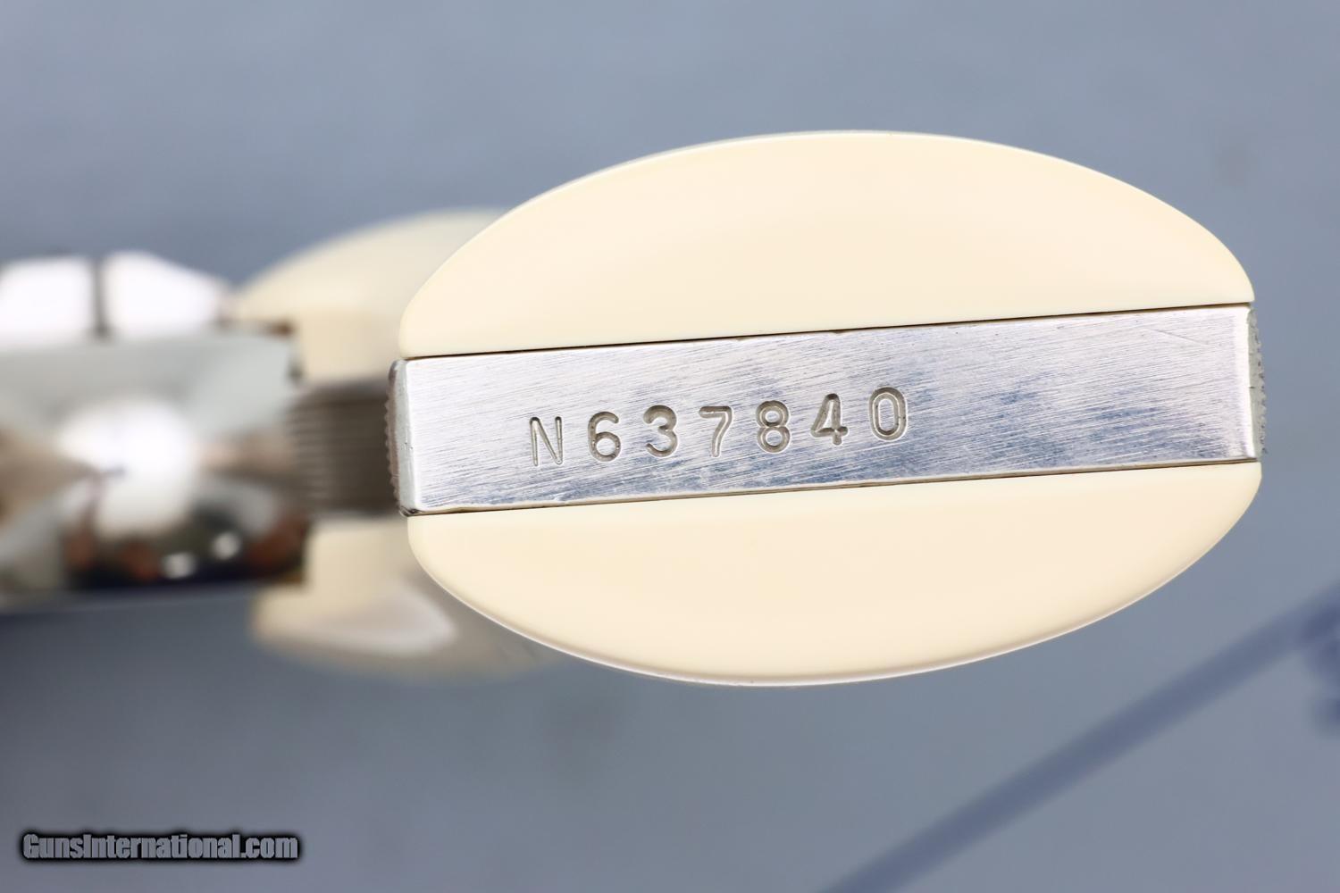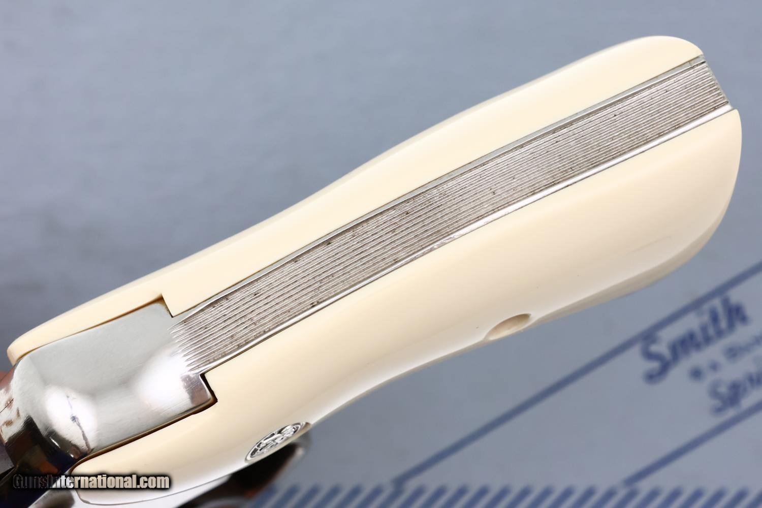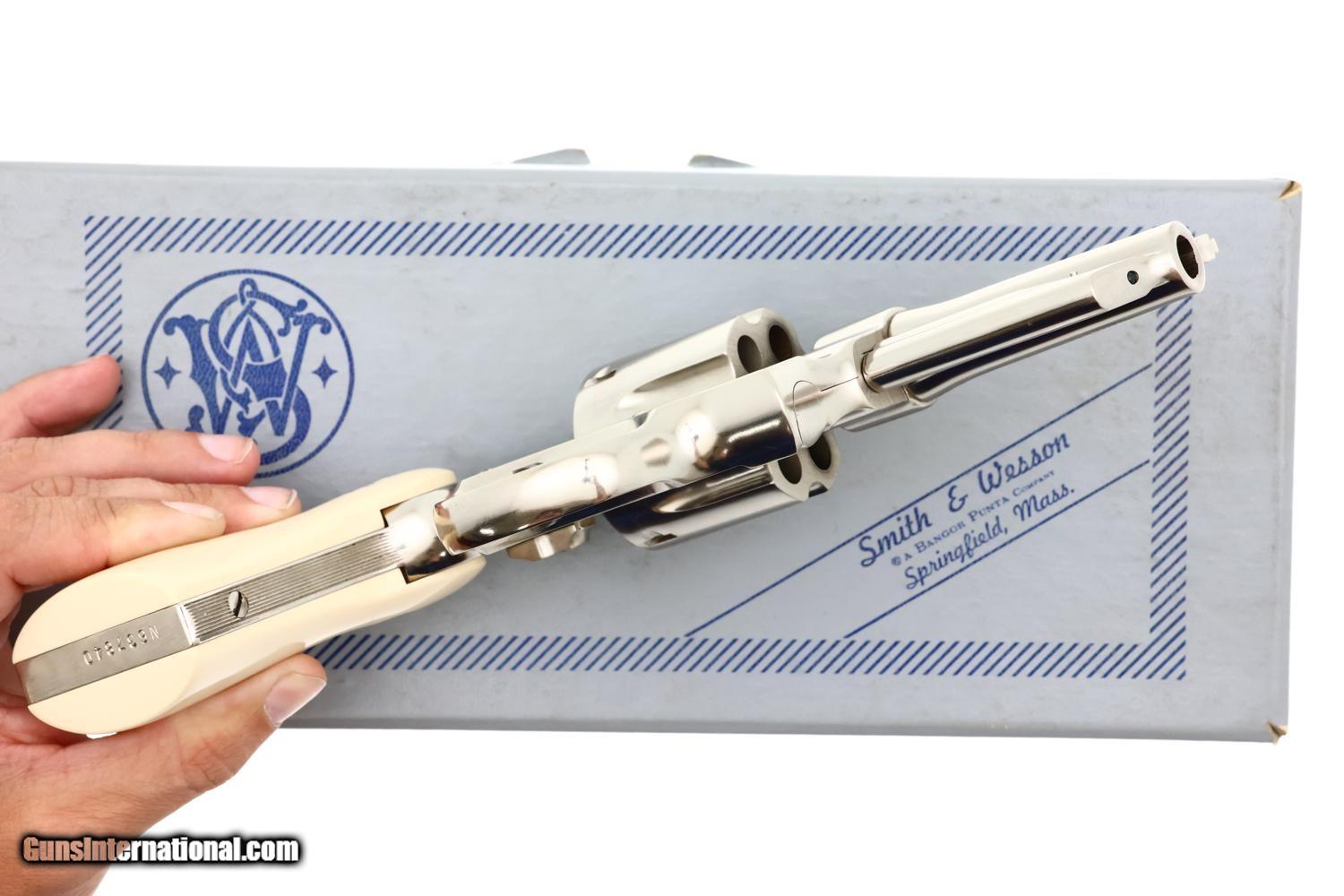 Revolver is nearly new with very faint cylinder ring just barely breaking the finish. Minimal marring on front strap tensioning screw. Comparable condition faux ivory grips, original Goncalo Alves grips, box and accessories. A great looking N-frame S&W revolver in the scarce factory nickle finish in its original shipping box!