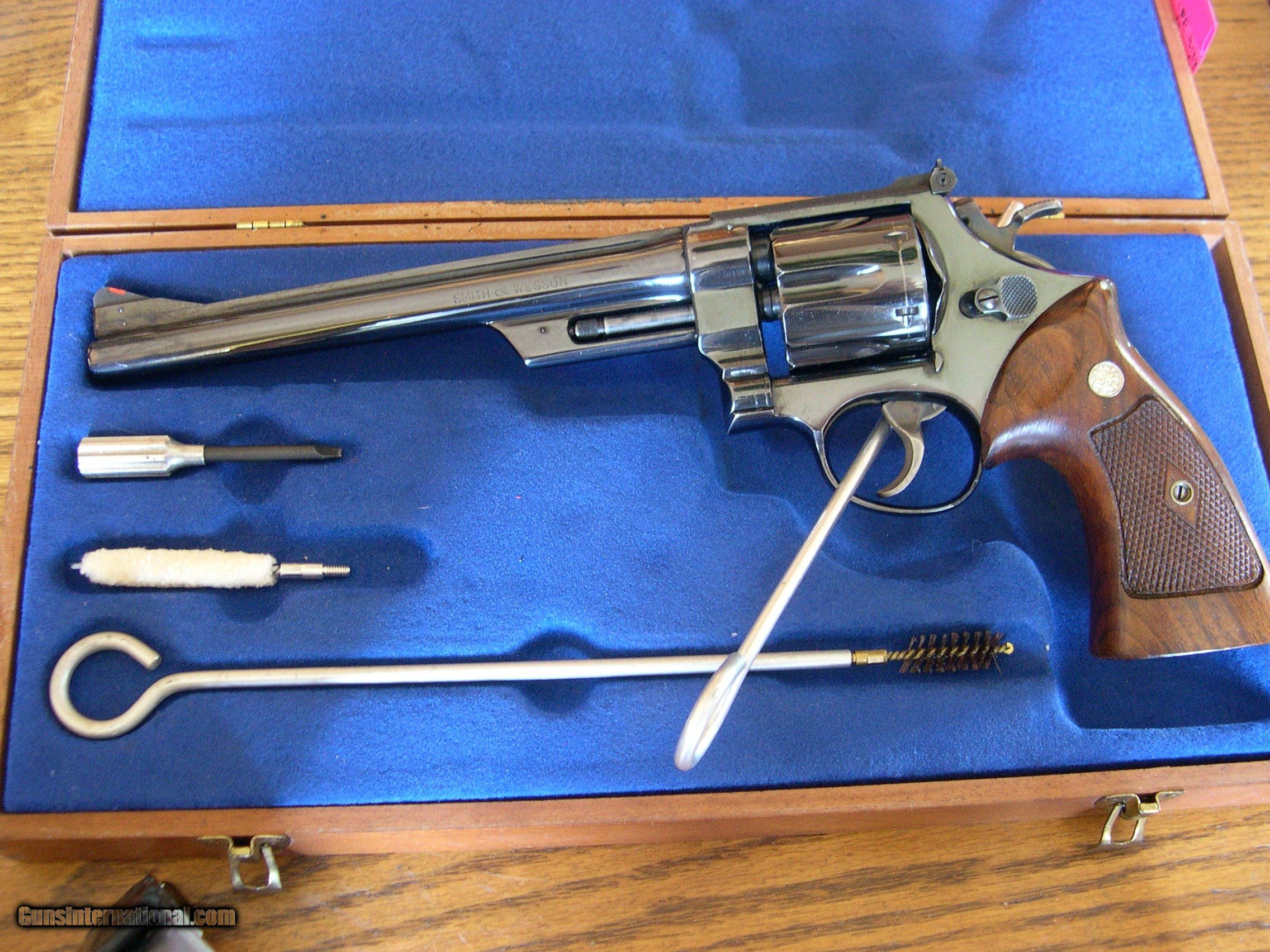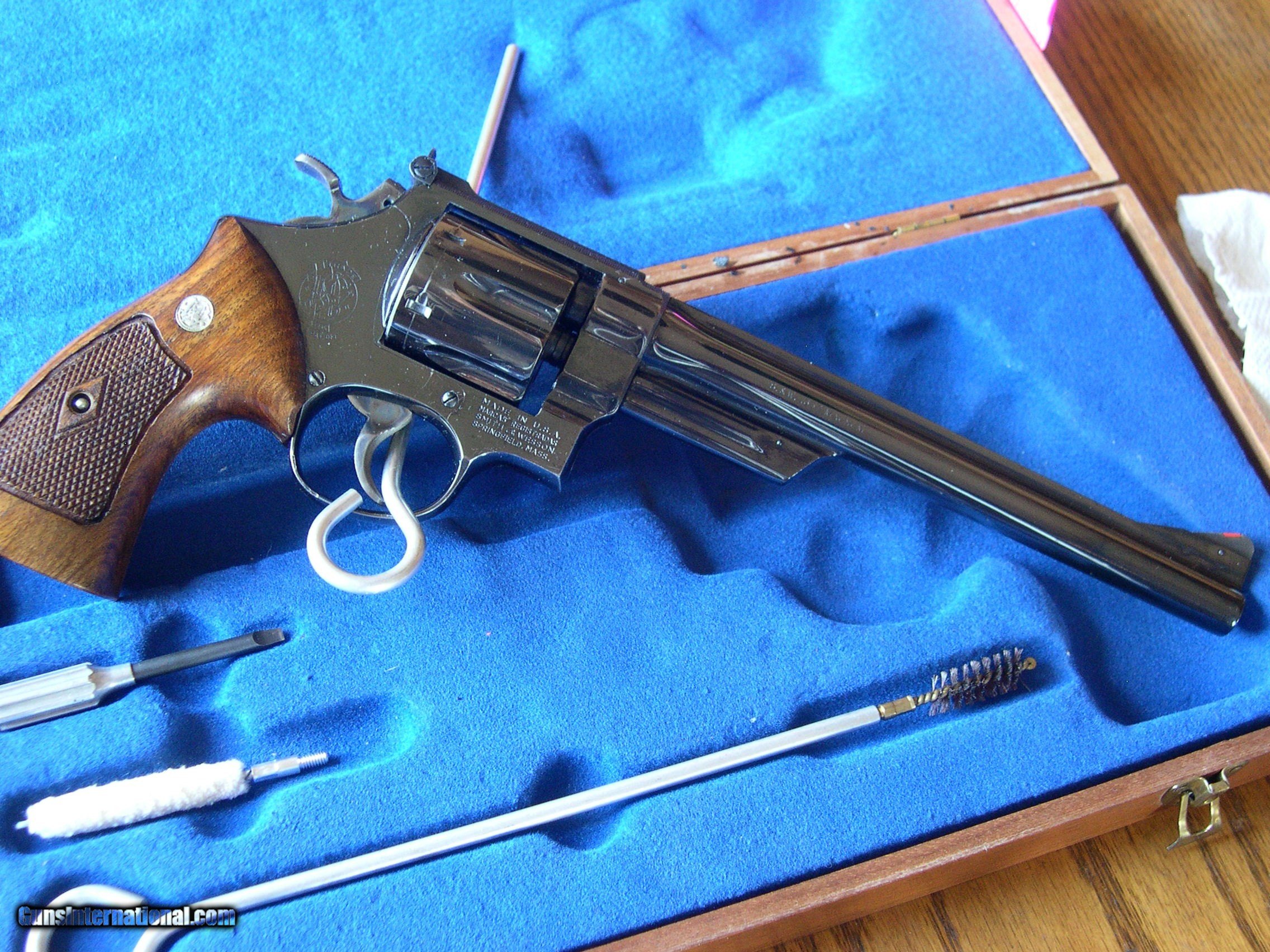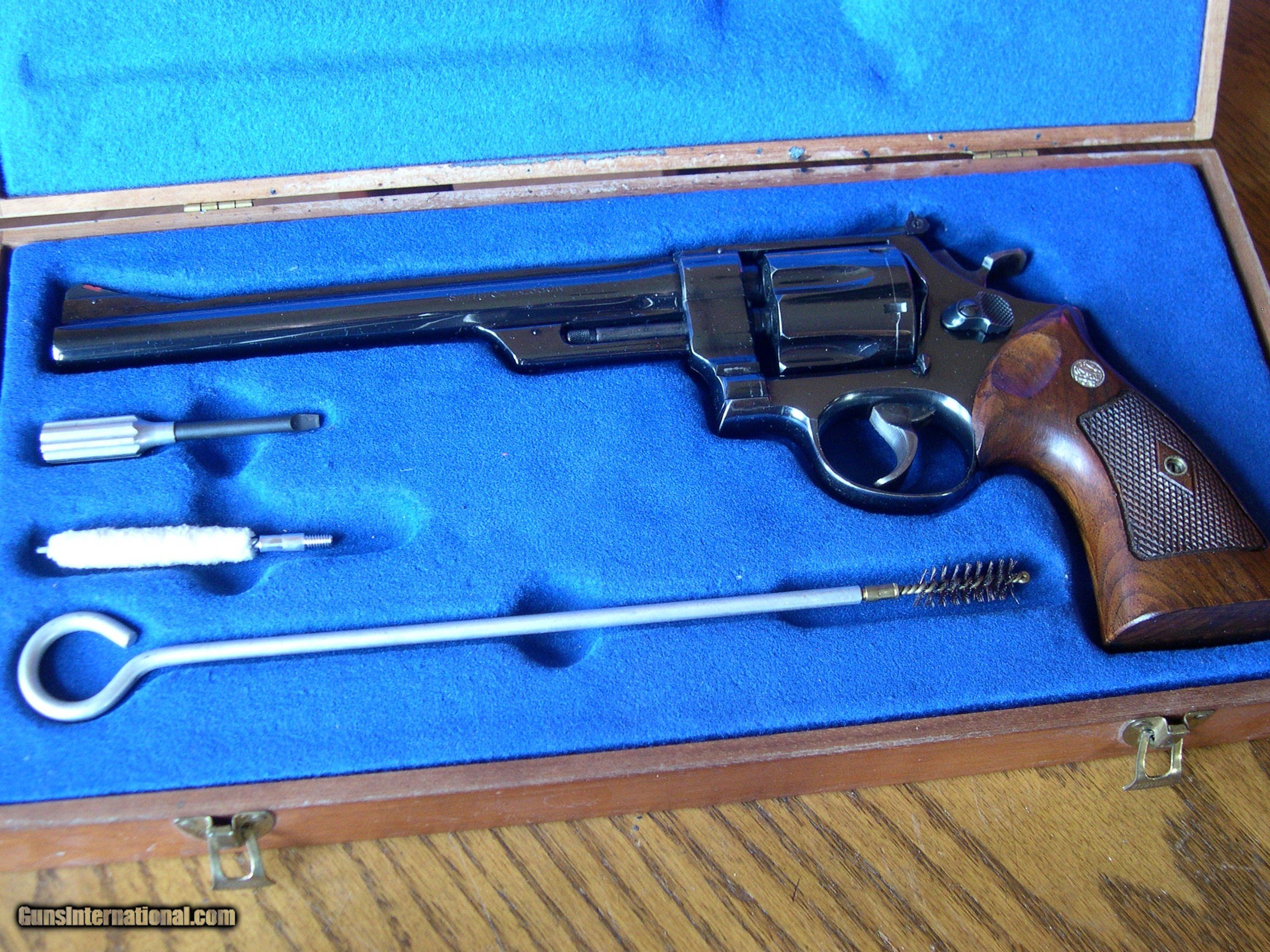 Description: This one with Diamond checkered grips , 83/8" Bbl, made in 62, S number, mint original condition , in original Presentation case, perfect high polish Blue, and grips !! Looks test fired only, Not a mark on this gun, real collectable !! comes with all tools, and nice case. SOLD |