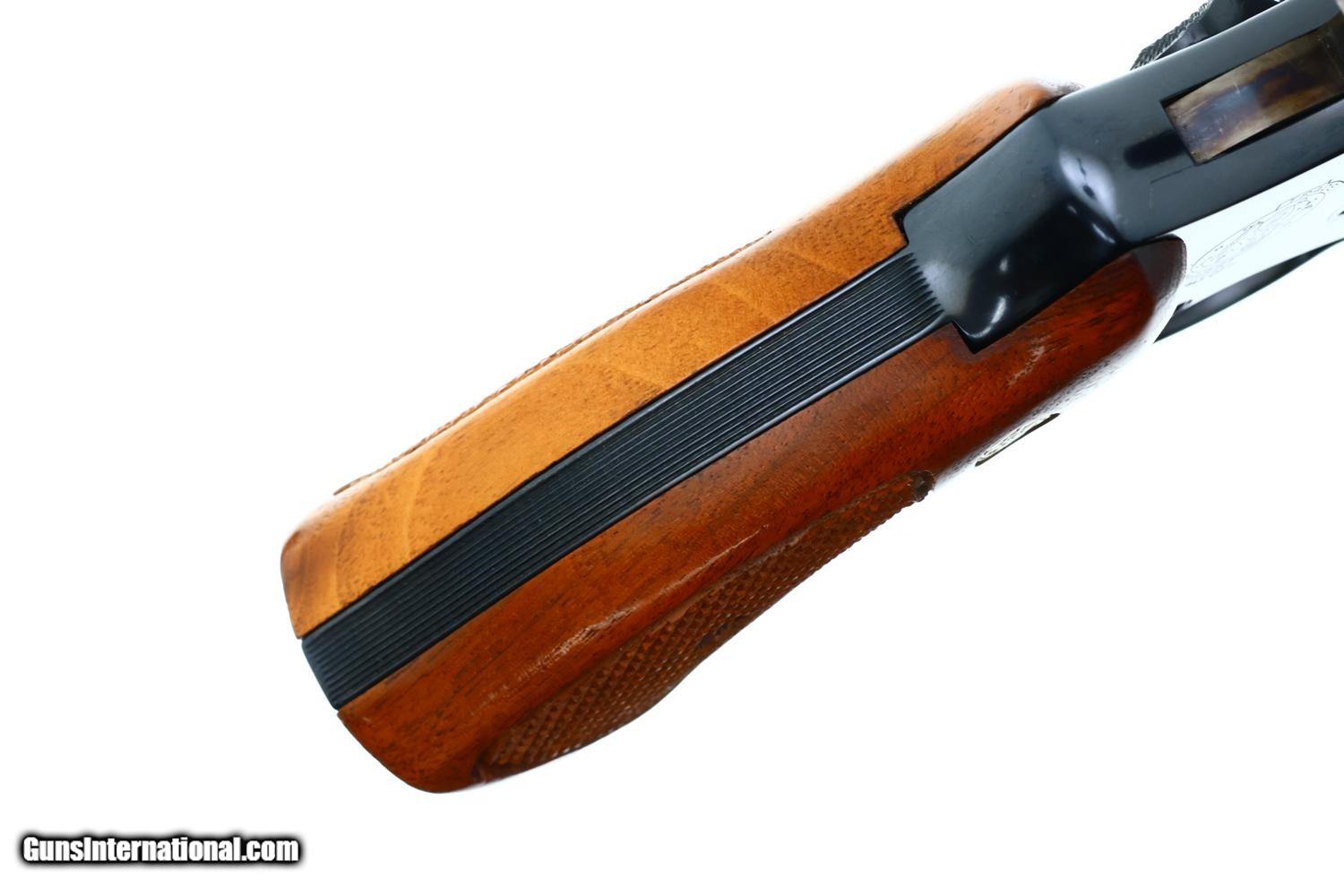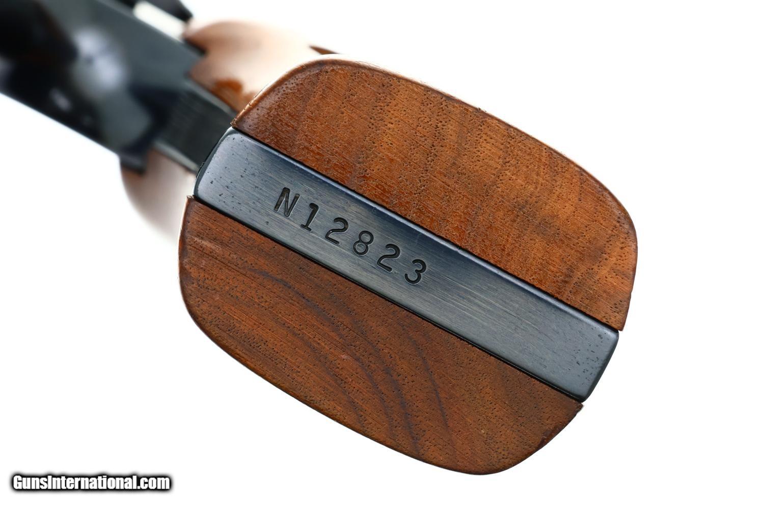Description: Synopsis: Exceptional S&W Model 27-2 .357 Magnum revolver with the scarce/desirable 3.5-inch barrel, adjustable sights, in exceptional condition, renowned for its popularity among FBI agents from the 1940s to the 1970s, complete with its original box with paperwork and cleaning swab. Description: Standard configuration S&W Model 27-2 .357 Magnum revolver manufactured between 1969-1972, SN: N12823, with 3½-inch barrel with fixed front sight and fully adjustable rear sight. The inner frame is marked "N12823" with "MOD 27-2", the crane marked "48363". Left side of the barrel is marked "SMITH & WESSON" while the right side is marked "S.&W. 357 MAGNUM". Sideplate with the circular S&W trademark along with the 4-line address: "MADE IN U.S.A.", registration reference, "SMITH & WESSON", and "SPRINGFIELD, MASS." Fitted with checkered wooden grips with S&W medallions, the grip frame serialed "N12823". Trigger and hammer are color case hardened. Complete with original blue cardboard shipping box, matching end label, instruction leaflet/warranty card, and cleaning swab. The 3½-inch barrel length was extremely popular with FBI agents from the 1940s through the 1970s. Condition: Beautiful 99+ percent bright original salt blue, the cylinder ring barely breaking through the blue, no case head imprints on the recoil shield. Vivid case colors on small parts. Comparable condition grips with no discernible handling marks. Mirror bright bore. VG+ box with scuffs and shelf wear. Manufacturer: S&W Model: 27-2 Serial Number: N12823 Caliber Info: 0.357 Condition: EXC Price: $3,995.00 Contact Seller |