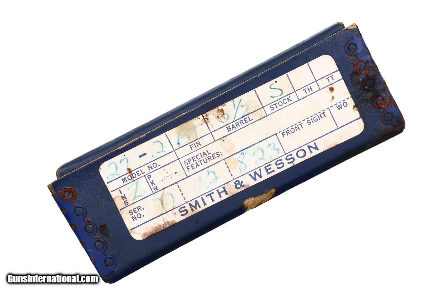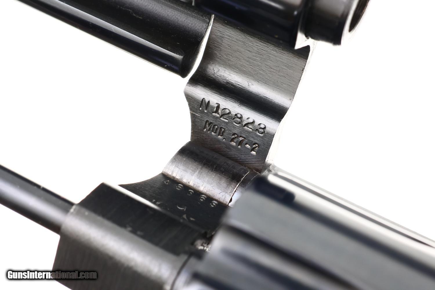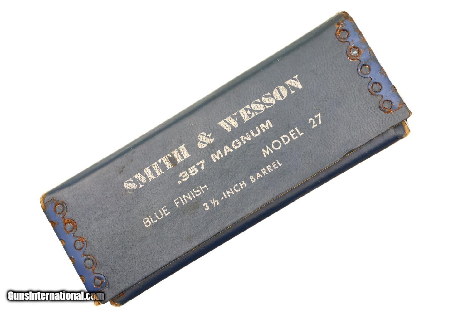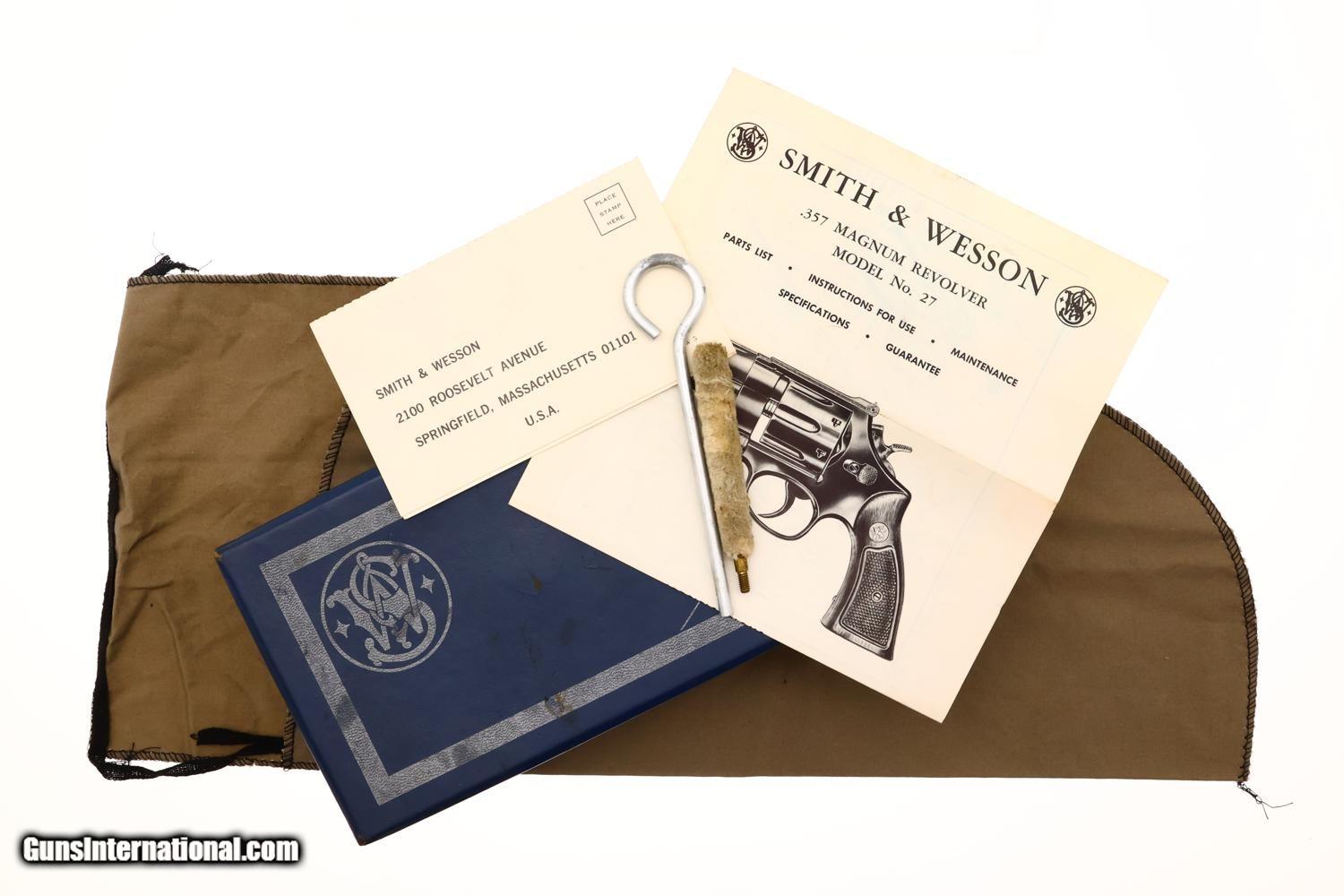 Standard configuration S&W Model 27-2 .357 Magnum revolver manufactured between 1969-1972, SN: N12823, with 3½-inch barrel with fixed front sight and fully adjustable rear sight. The inner frame is marked "N12823" with "MOD 27-2", the crane marked "48363". Left side of the barrel is marked "SMITH & WESSON" while the right side is marked "S.&W. 357 MAGNUM". Sideplate with the circular S&W trademark along with the 4-line address: "MADE IN U.S.A.", registration reference, "SMITH & WESSON", and "SPRINGFIELD, MASS." Fitted with checkered wooden grips with S&W medallions, the grip frame serialed "N12823". Trigger and hammer are color case hardened. Complete with original blue cardboard shipping box, matching end label, instruction leaflet/warranty card, and cleaning swab. The 3½-inch barrel length was extremely popular with FBI agents from the 1940s through the 1970s.