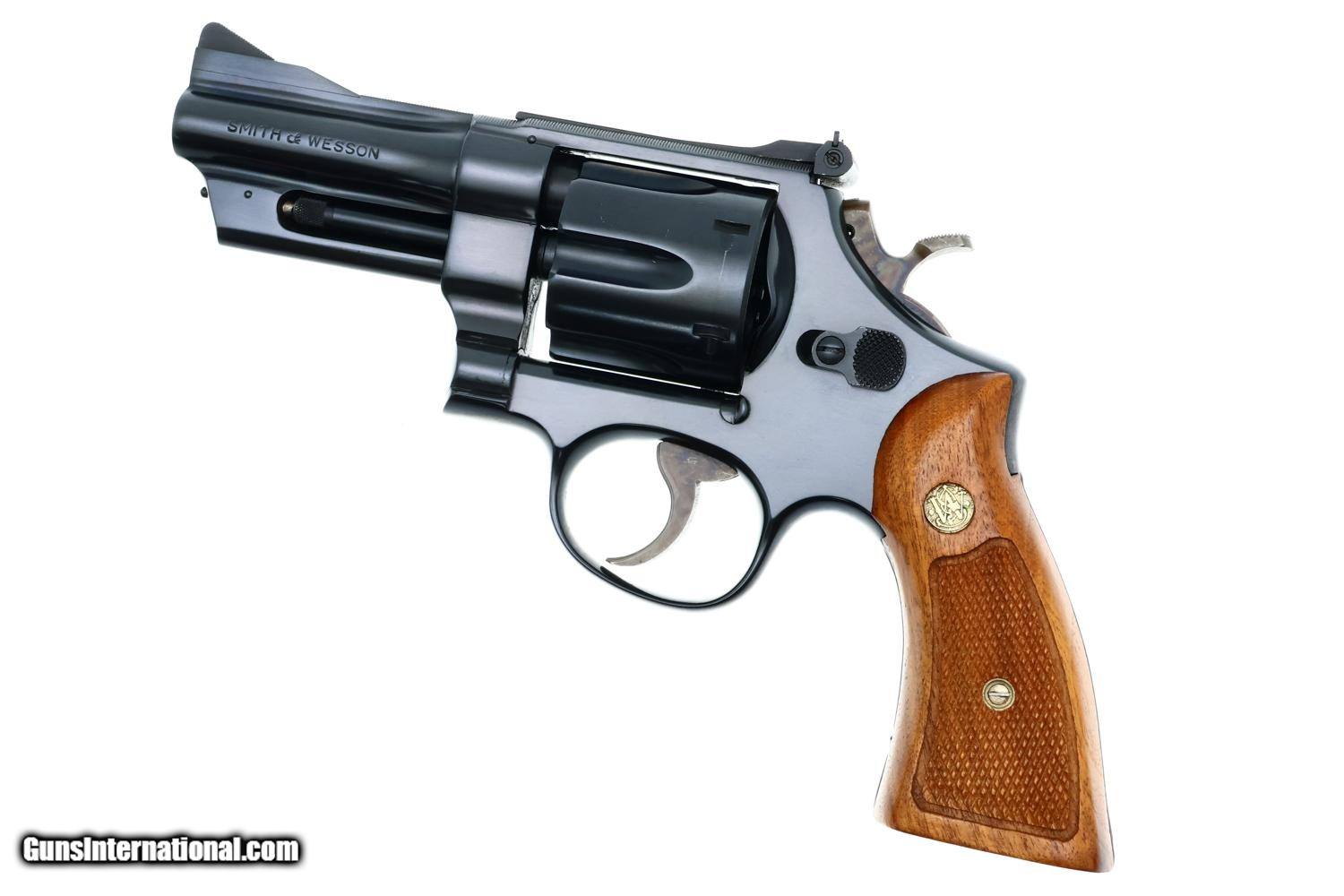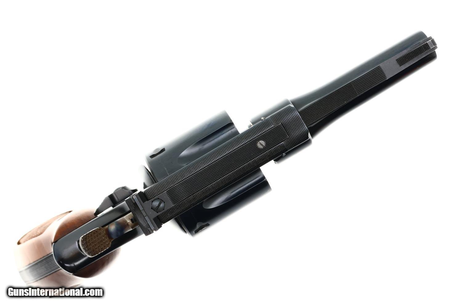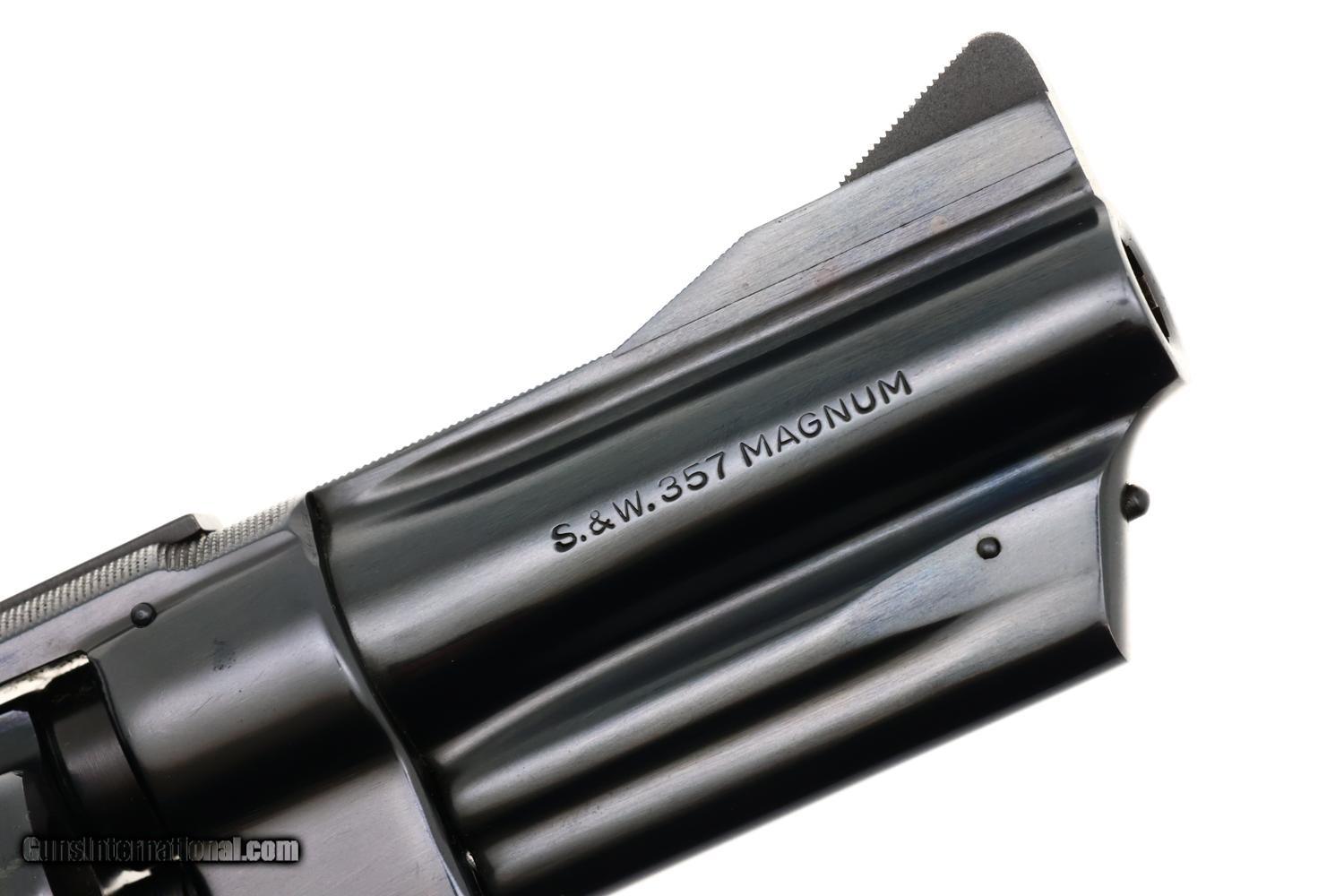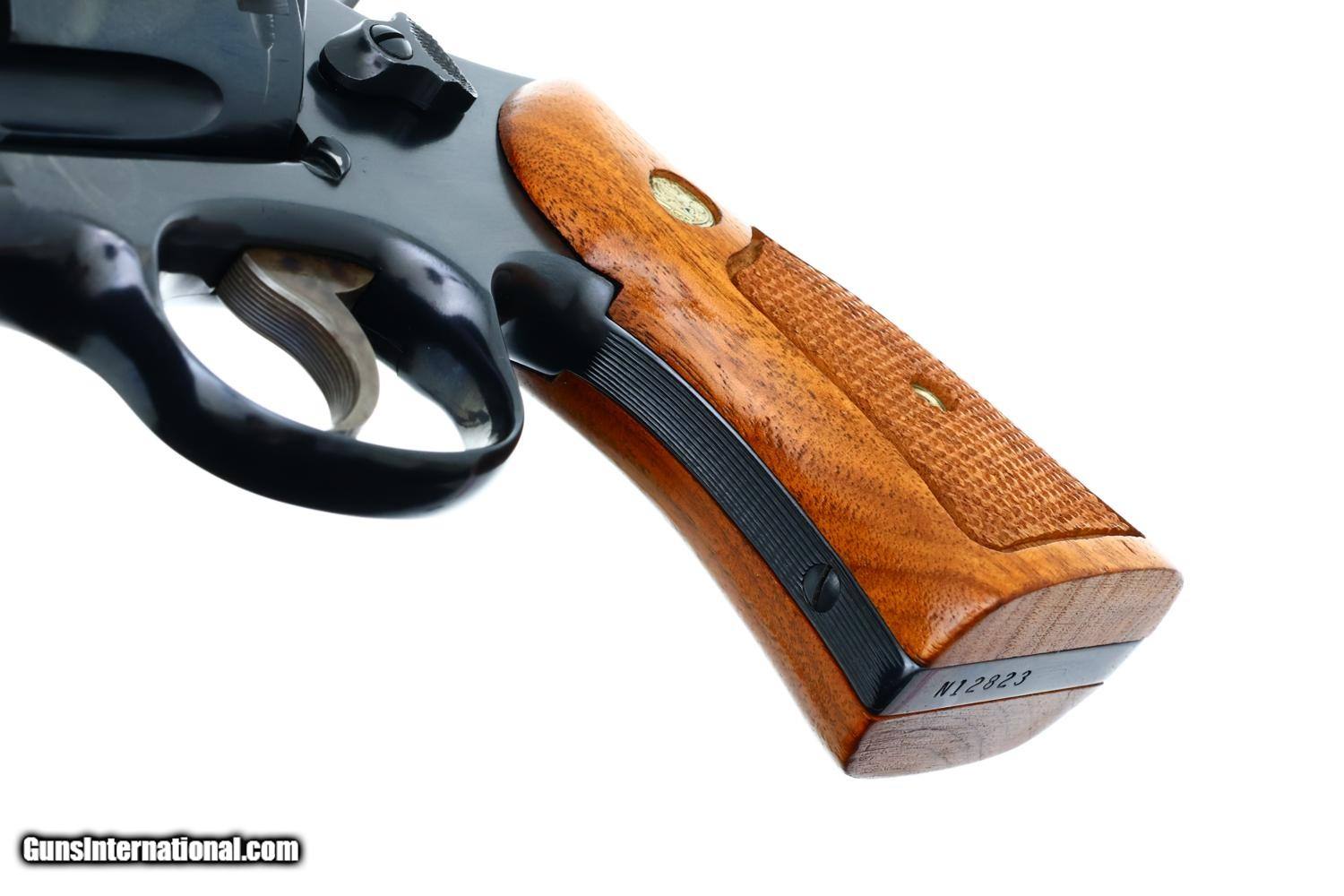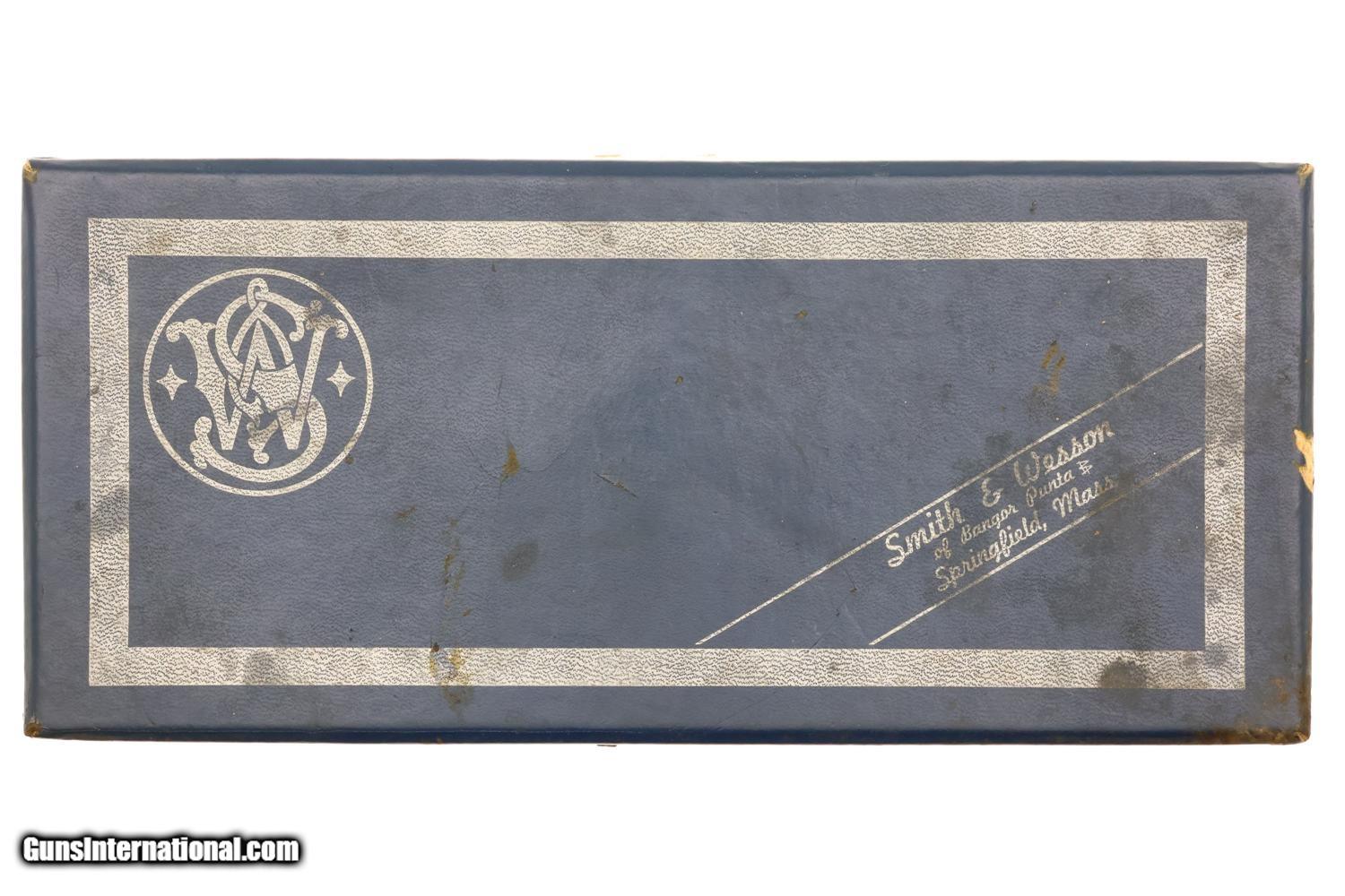 Standard configuration S&W Model 27-2 .357 Magnum revolver manufactured between 1969-1972, SN: N12823, with 3½-inch barrel with fixed front sight and fully adjustable rear sight. The inner frame is marked "N12823" with "MOD 27-2", the crane marked "48363". Left side of the barrel is marked "SMITH & WESSON" while the right side is marked "S.&W. 357 MAGNUM". Sideplate with the circular S&W trademark along with the 4-line address: "MADE IN U.S.A.", registration reference, "SMITH & WESSON", and "SPRINGFIELD, MASS." Fitted with checkered wooden grips with S&W medallions, the grip frame serialed "N12823". Trigger and hammer are color case hardened. Complete with original blue cardboard shipping box, matching end label, instruction leaflet/warranty card, and cleaning swab. The 3½-inch barrel length was extremely popular with FBI agents from the 1940s through the 1970s.