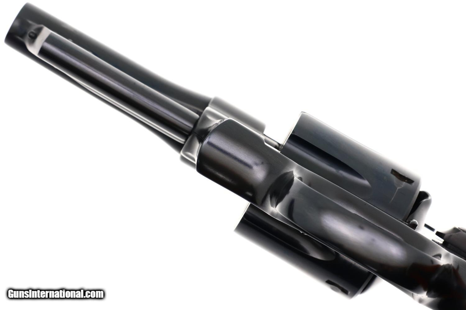 Beautiful 99+ percent bright original salt blue, the cylinder ring barely breaking through the blue, no case head imprints on the recoil shield. Vivid case colors on small parts. Comparable condition grips with no discernible handling marks. Mirror bright bore. VG+ box with scuffs and shelf wear.