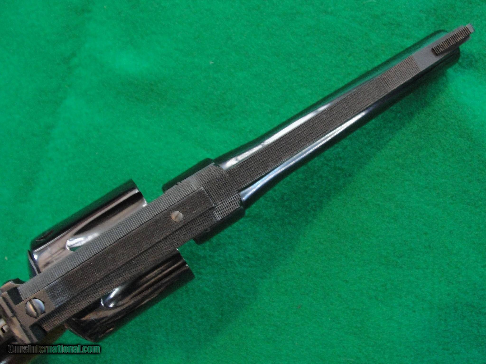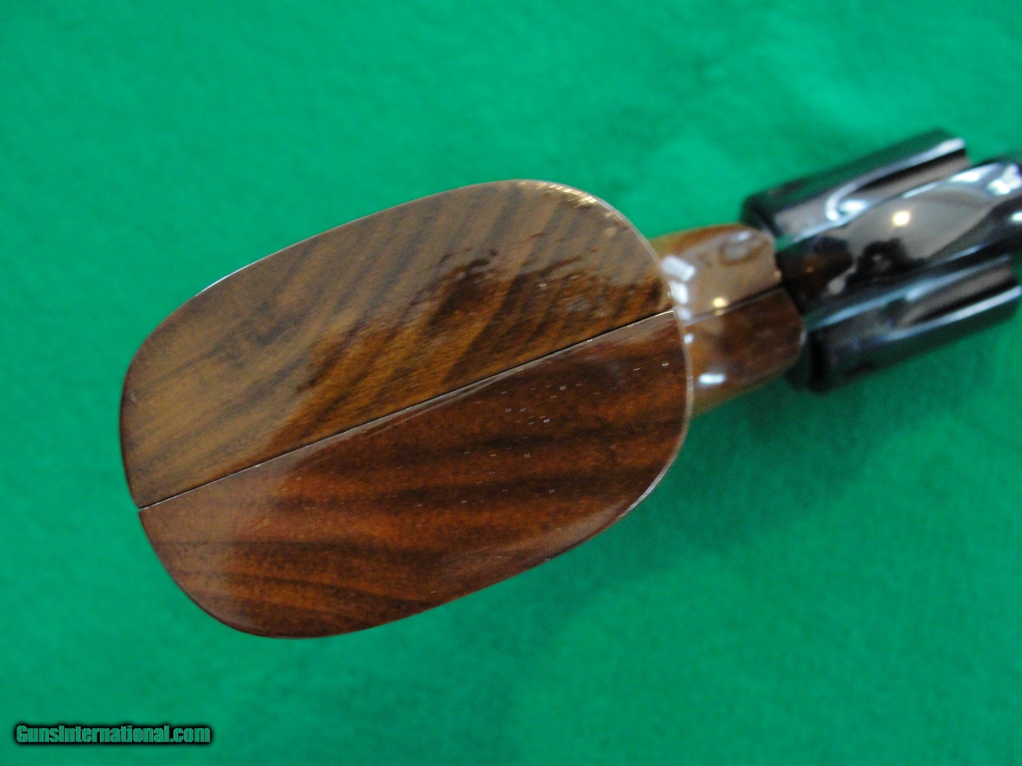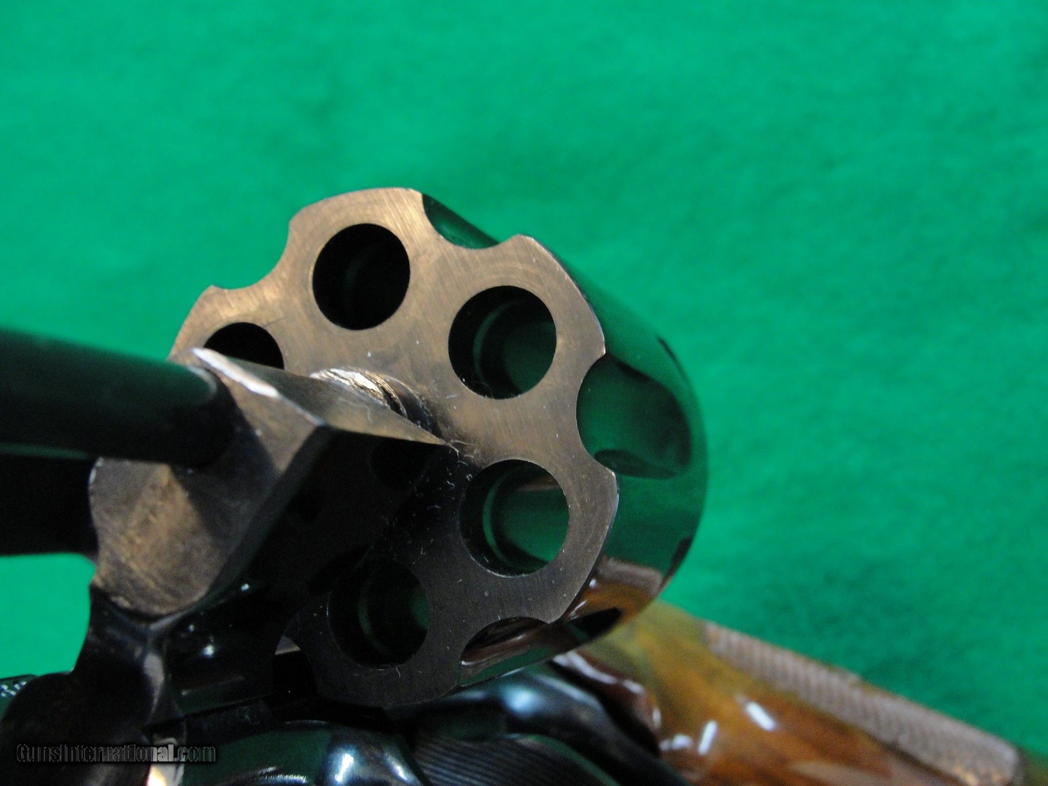 Description: High level of condition, Collector-Quality package. We can hardly find any evidence this has been fired, possibly only factory test-fired. Only the slightest, faintest start of a turn ring on the cylinder, balance of blueing appears flawless. 5" barrel, superb bore and chambers. Proper coke bottle grips appear flawless as well. Box, papers and cleaning/screwdriver kit are also in refreshingly crisp and nice shape. Made in 1968. Let the pictures do the talking, email or call for more info. CA sales OK! SOLD |