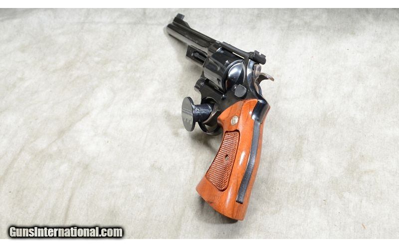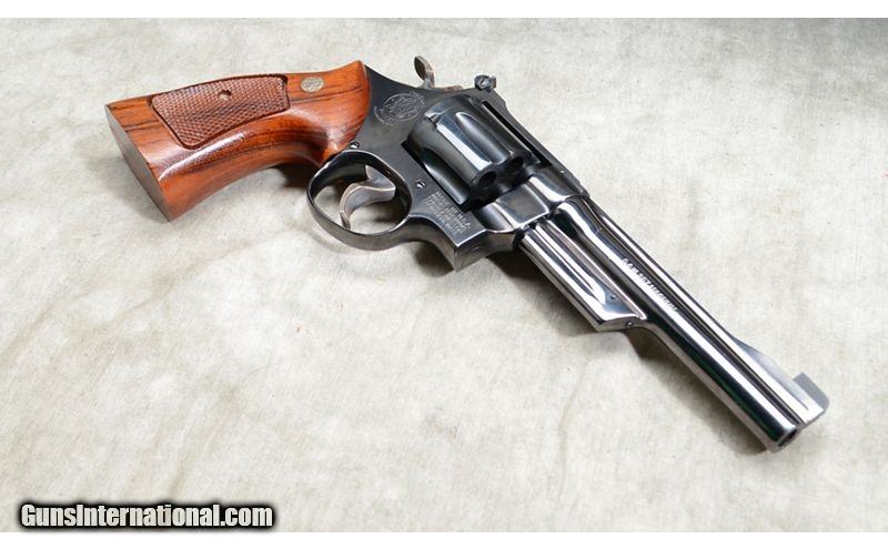 Description: Nice revolver with high polish blue, target sights, and S&W grips. The trigger and the hammer are grooved/knurled and extra wide target style. Comes with wooden case and maintenance kit. .357 Mag SOLD Chambers: 6 Metal Condition: Excellent. Wood Condition: Excellent. Bore Condition: Shiny and bright. Barrels: 6_inch Triggers: Factory single and double action trigger. Butt Pad: Checkered hardwood with nice grain. Weight: 47 oz. Sights: Post and adjustable notch open sights. Item Location: Rogers |