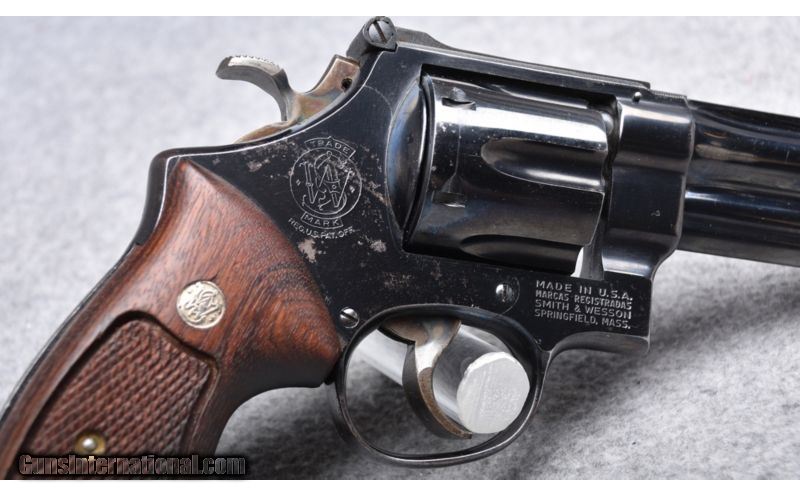 Description: This is a Smith & Wesson model 27-2 blue steel, 6 shot .357 magnum caliber revolver, with walnut checkered target grips. It has a 6 inch barrell, with target sights. The rear sight is adjustable for windage and elevation. The pistol also has a target trigger and a target hammer.The metal finish is excellent, with minor marks and wear from use. The walnut grips are excellent, with a 1 inch long X1/8 inch deep chip, out of the left panel. The bore is bright, with strong rifling and no pits. Also included is a wood, fitted presentation case, with a cleaning rod, swab, and screw driver. The velvet lining is torn. SOLD Caliber Info: .357 magnum Metal Condition: Excellent with minor handling marks, blemishes Wood Condition: Excellent with minor handling marks, and a 1 inch x 1/8 inch chip out of the left panel. Bore Condition: Bright Bore, Strong Rifling Barrels: 6 inch Weight: 46 ounces Sights: Target Extras: Fitted wooden case, with cleaning rod, swab, and screw driver Item Location: Reno, NV |