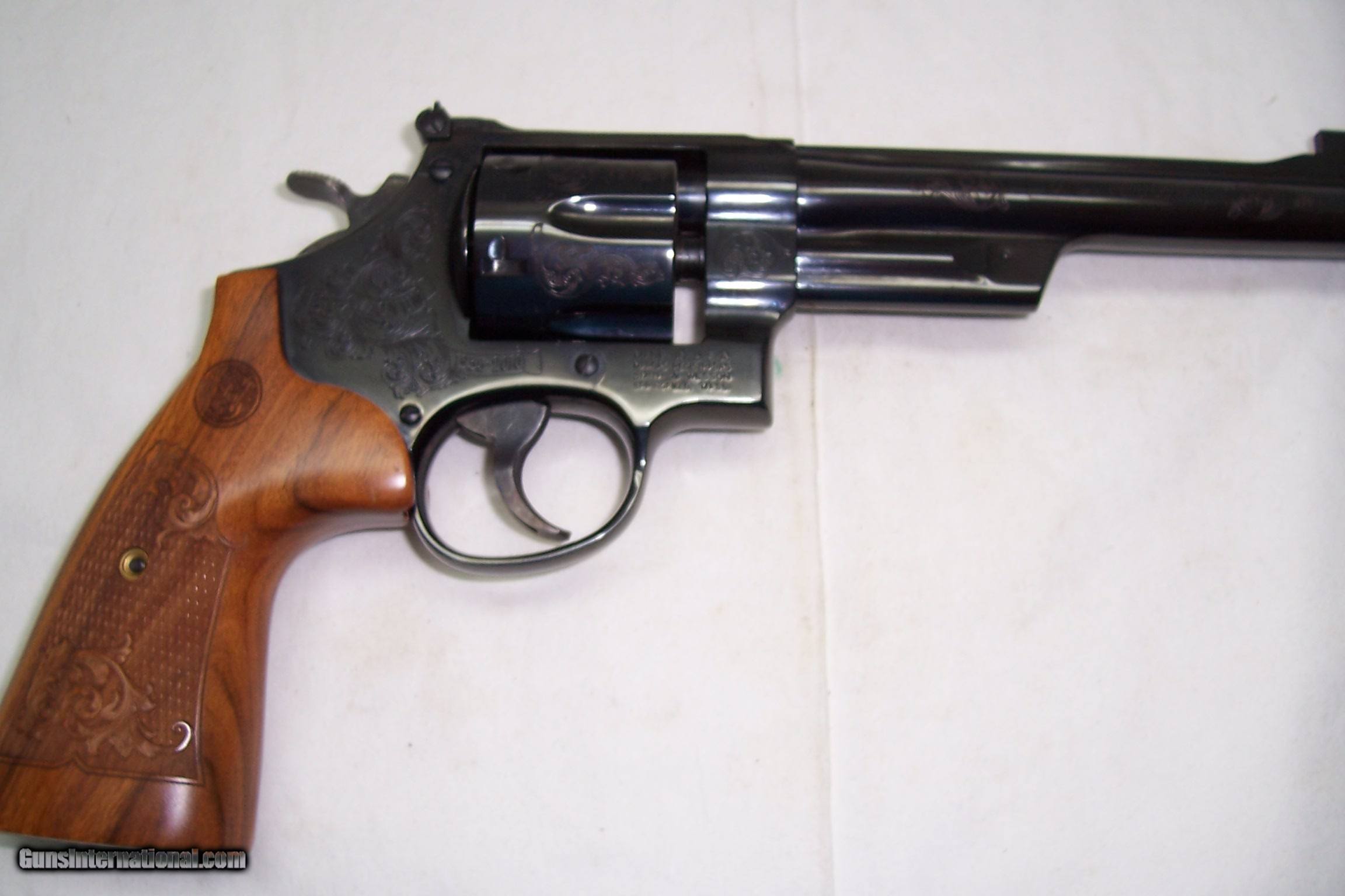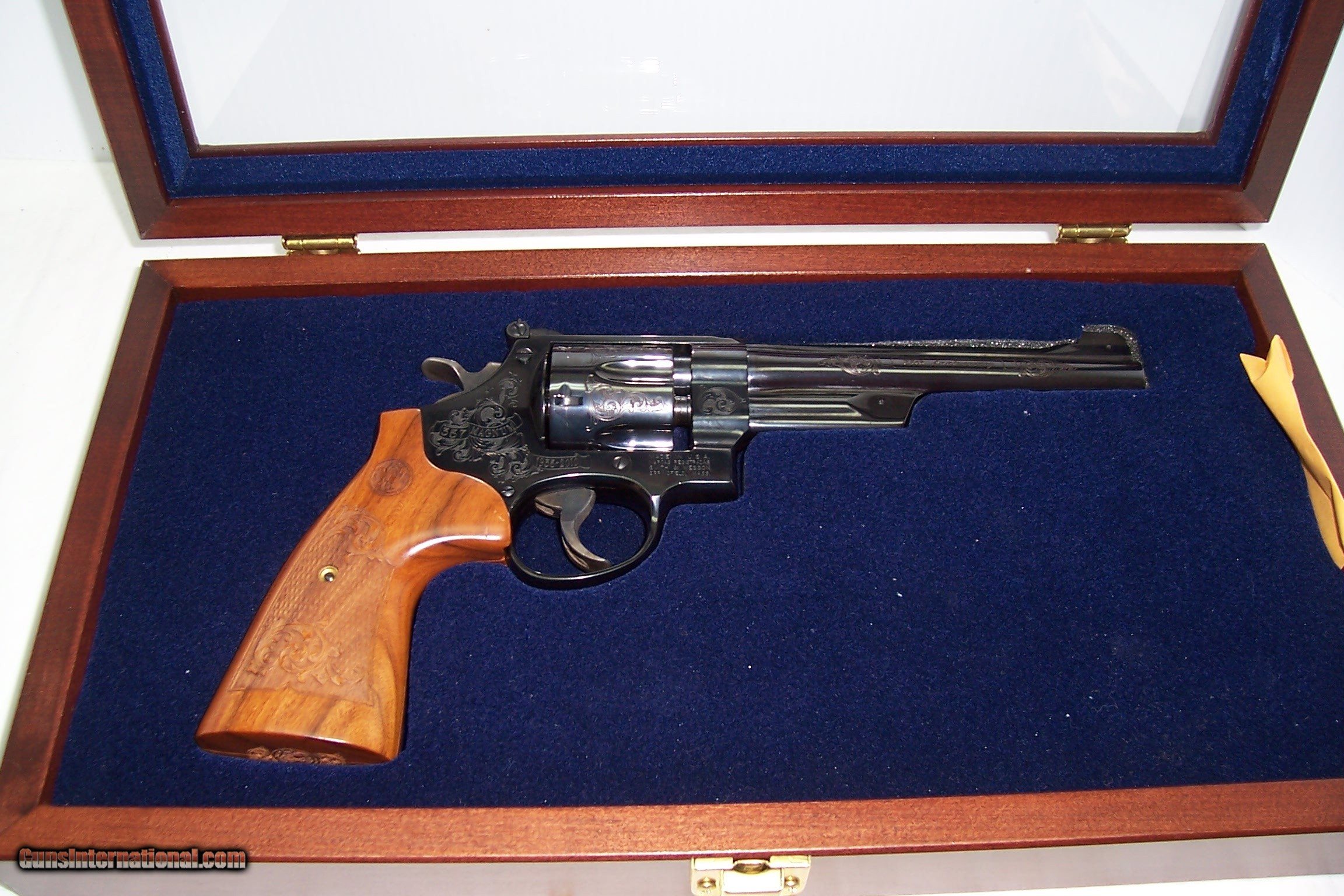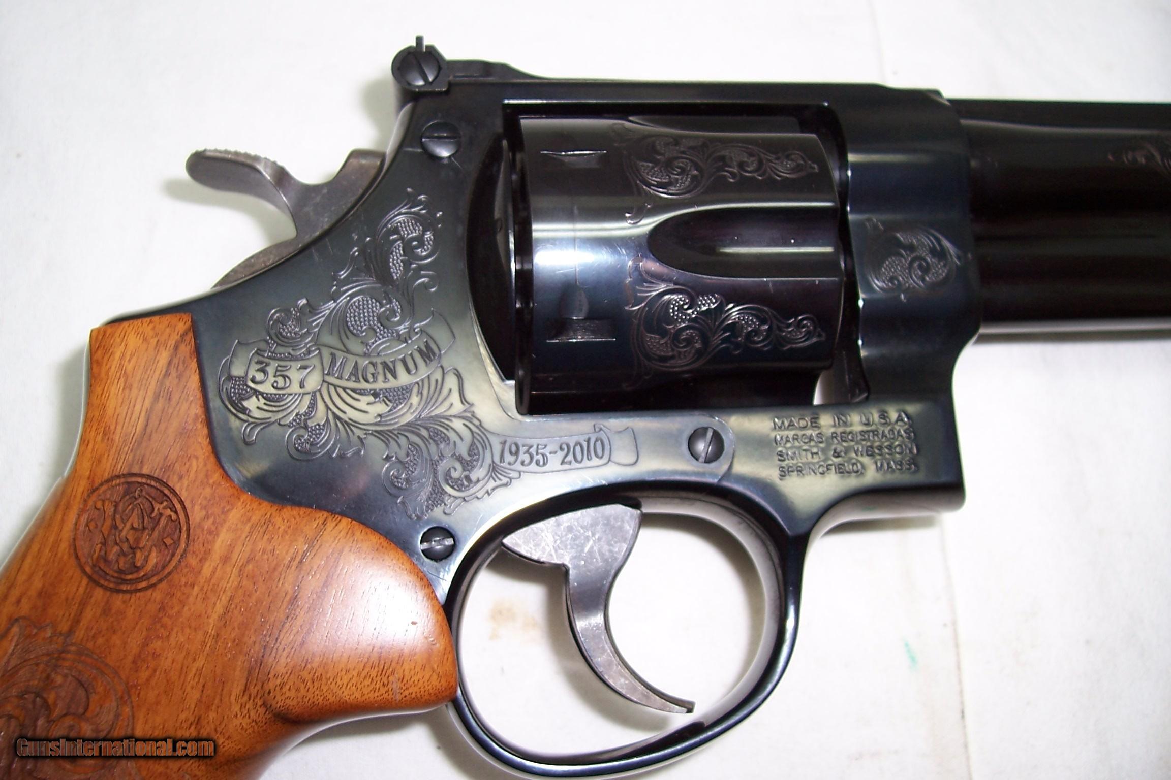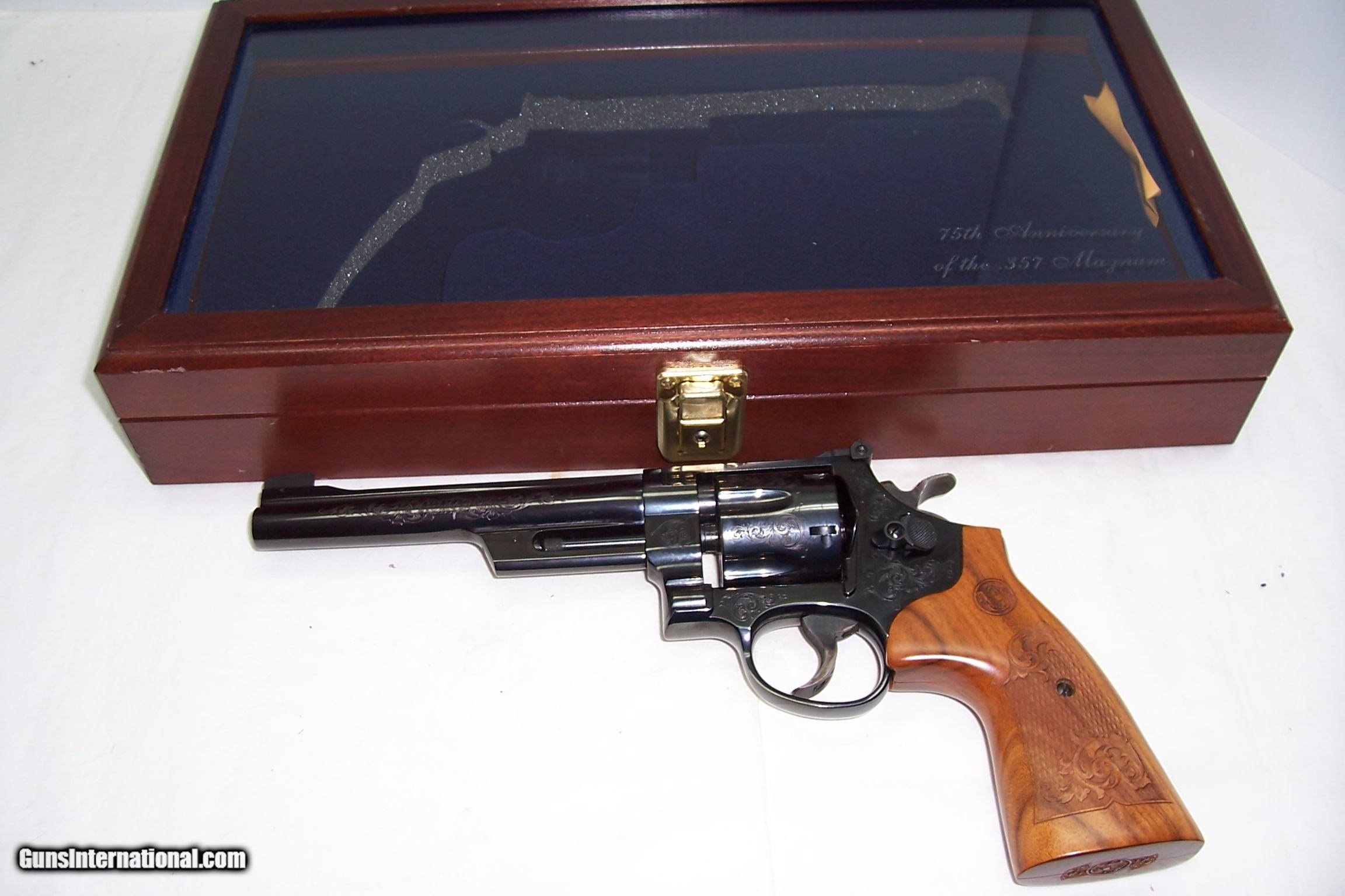 Description: A presentation 75th Anniversary of 357 Magnum, engraved Mod 27-9, box with papers and the glass Anniversary Case. All unfired and original. A real collectable, serial number SFYo296. Call or email any questions. SOLD Manufacturer: Smith & Wesson Model: 27-9 Serial Number: SFY0296 Caliber Info: 357 Condition: NIB Engraving: Factory |