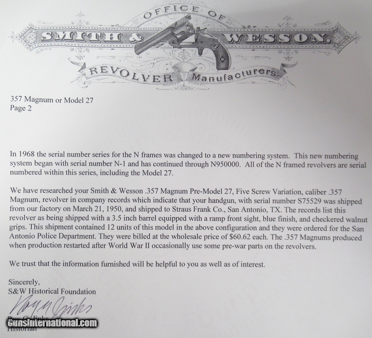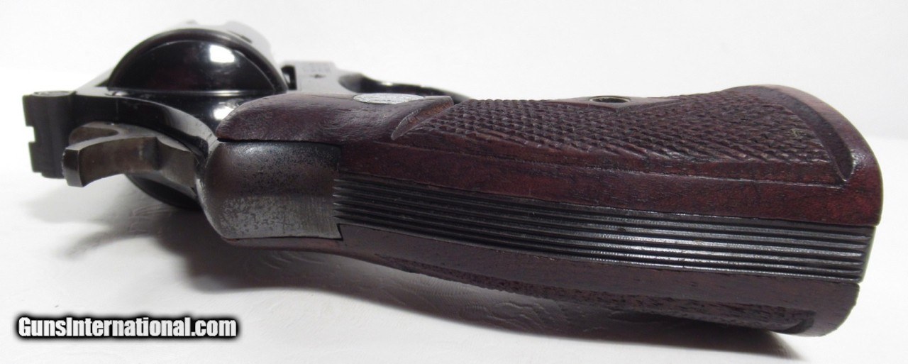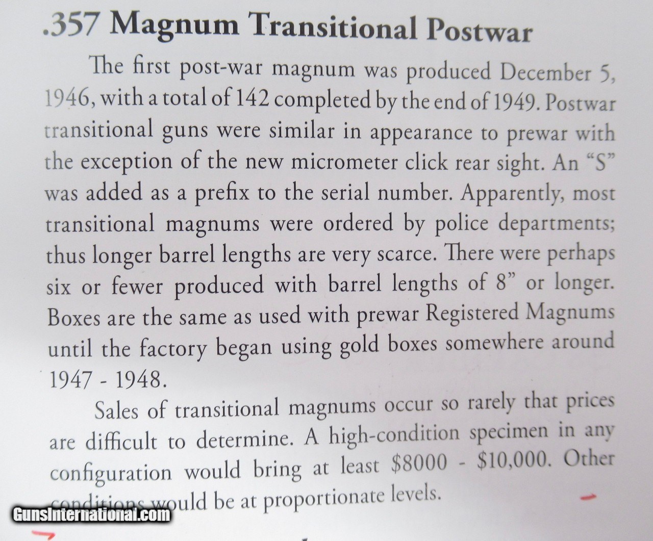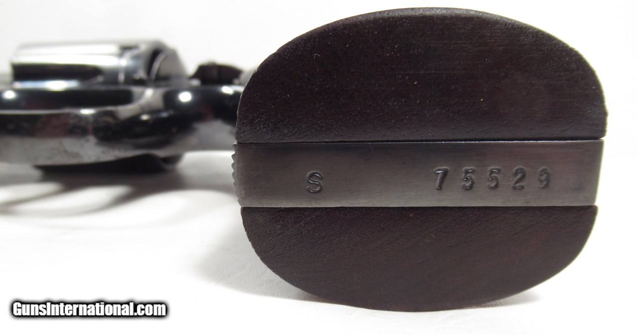 Description: Very Rare Smith & Wesson 357 Magnum Transitional Post War Model; Serial No. S75529; Some Pre-War Registered Magnum Parts (Frame, Barrel, Hammer, and Grips); Some Post-War Parts; This Very Rare Revolver with a 3 ½” Barrel was One of 12 Revolvers Shipped to Straus Frank Co., San Antonio, Texas for the San Antonio Police Dept. on March 21, 1950; Lots of Photos were Sent to Roy Jinks of this Revolver and He Said All Looked Original to Him and you never know what you got with a Transitional Model; I also called Retired San Antonio Police Chief Bill Gibson and he related he has Never Heard of One of These Revolvers; Very Good Condition, Especially for a Police Gun with nearly All of the Original Blue Still Present; Nice Grips with Late Pre-War Insert with Patent Dates (See “Standard Catalogue of Smith & Wesson” page 22); This is One of Only 142 Transitional Models Produced and Most were Ordered by Police Depts. (See “Standard Catalogue of Smith & Wesson” page 135) ; All Numbers Match; Perfect Action and Bore; PERSONAL PROPERTY of Harold Wieser; Price: $8,750 + $30 S&H; Price includes insured shipping; return policy: three days inspection from the date the item is received; full refund of shipping both ways ONLY IF THE ITEM IS MISREPRESENTED. SOLD Manufacturer: Smith & Wesson Model: 357 Serial Number: S75529 |