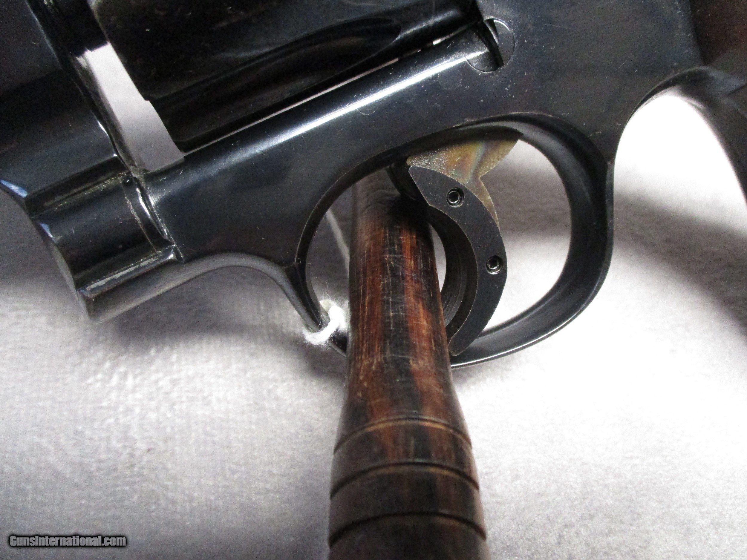 Description: The .357 Magnum was S&W’s answer to the .38 Super chambered in the famous Colt 1911A1. While revolvers were a national standard for use by police departments, many officers were finding that their .38 S&W and 38 Specials could not penetrate car bodies which was becoming a problem given the then escalating frequency of encounters between the police and gangsters and other outlaws. At the time of its introduction in 1929, the .38 Super was the only commercially available handgun cartridge that could reliably penetrate car doors (due to its muzzle velocity being higher than 1000 ft/s). S&W’s initial response to this was the .38/44 revolver and cartridge (38 Special on a N frame). As the .38/44 round is identical to the 38 Special, but chambered for a higher pressure, this created the problem wherein one could inadvertently use the .38/44 in a small frame 38 Special with potentially dangerous results. By the early 1930s, realizing that their revolver sales were in jeopardy, S&W introduced the .357 Magnum in 1935 in the .357 Registered Magnum Revolver (N frame). The .357 Magnum used a 0.125-inch longer case to prevent the round from being fired in a revolver chambered for the .38 Special. As such, any .357 Magnum revolver will also shoot the .38 Special. The .357 Registered Magnum was essentially a custom ordered gun and most are unique, with the purchaser specifying sights, finish, grips, and barrel lengths of their choosing starting at 3.5” and going up by 1/4” increments up to 8-3/4”. The .357 Registered Magnum was followed by the .357 Non-registered Magnum variant which standardized barrel lengths to 3.5”, 5”, 6”, 6-1/2”, and 8-3/8”. Production ceased during World War II, returning to production in 1948 as the .357 Magnum Revolver. In 1957, model numbers were assigned to all S&W revolvers and the .357 Magnum became the Model 27. Overall, both the revolver and the cartridge it introduced became legendary in both police, military, and civilian circles. George S. Patton, the famous WWII general, carried a 3.5” barreled .357 Registered Magnum alongside one of his Colt Peacemakers (in .45 Colt) during that War. The 27 is still in production as part of the S&W Classic Series. The .357 Magnum is available in numerous revolvers, lever-action rifles, and even some semi-auto pistols. This revolver is a 27-2 variation. This was the last variant to feature the famous S&W pinned barrel. The serial number, according to the Standard Catalog of Smith & Wesson, 4th Edition, indicates this gun was manufactured between 1966 and 1967. Naturally, it is used, but it retains the majority of its original finish. There are light powder burns on the front of the cylinder. There is light finish wear at the muzzle and on the frontal edges of the frame. The cylinder, barrel, and frame have mostly low levels of rust present in certain locations, which is shown in the pictures. The trigger and hammer retain most of their case hardened finish. The grips are in excellent shape with only minor handling wear. The bore is in mint condition and appears as though it left the factory yesterday. The action is consistent and smooth. Another, desirable aspect of this beautiful firearm is that, unlike later S&W models, this one has no trigger lock. This is a desirable feature of the older S&W revolvers and the expression “pre-lock” is a common denotation of this feature. This revolver would make a good addition to any collection. SOLD Handgun Caliber: .38 Special, .357 Magnum Manufacturer: Smith & Wesson Model: Model 27-2 Serial Number: S268369 Bore: Rifled Chambers: 6 Ejectors: Manual, simultaneous 6-round ejection Condition: Good Metal Condition: Light rust spots in a few locations, some finish wear Wood Condition: Light Wear to wood Bore Condition: Excellent - no rust or pitting Barrel Type: Round Action: Double/Single Action Triggers: .265 inch (6.73mm) serrated widened to 0.50 inch (12.7mm) with trigger shoe Stock: Magna grips with diamond center and S&W medallions Finish: Blued Sights: 1/10” Patridge front sight, Micrometer-click rear sight, Sight Radius 7.94” (201.61 mm) Manufacture Date: 1966 - 1967 |