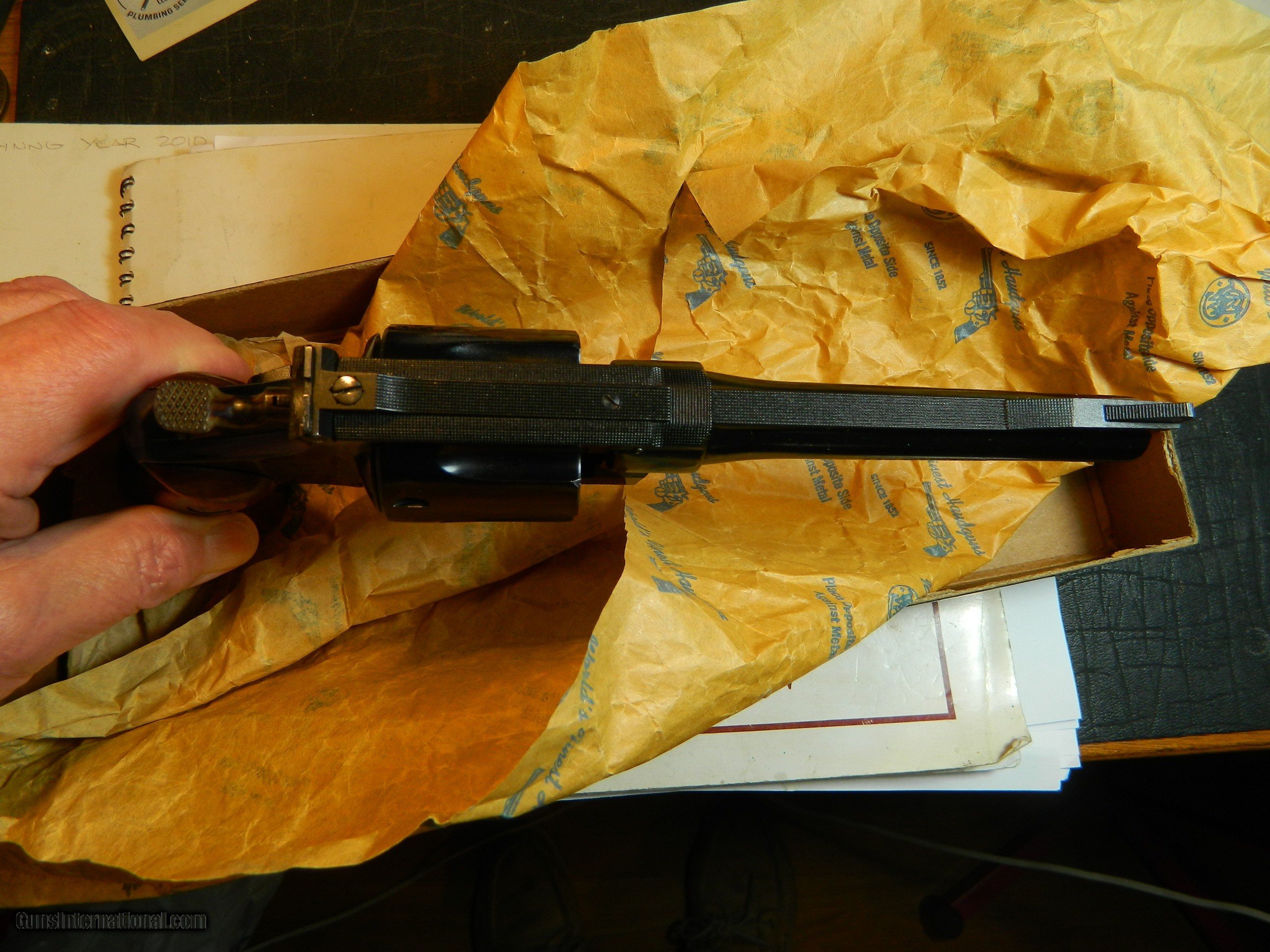 Description: SOLD>>>We have in on consignment, a AS NEW,99% model 27-2 5 inch bbl which appears UNFIRED !! I could list this as new old stock but honesty prevails!!! So I have to list as used.. This gun was made in 1972 according to information gained on the computer. it has box, paper work,but no model sheet. this does have a unique bound booklet of the information sheet ,just like the factory supplies.[see pic]. it also has the original rust paper, and the brown tissue paper it was shipped in. this is nothing but QUALITY of years gone by, period. This would be a center piece of any collection. may have a tiny storage mark , but is absoluely a 99+ % gun. if you wish more pictures, please ask. pictures show that there is NO marks on the recoil shield, showing it has been fired. serious inquiries only, please. This is an outstanding model 27... Thanx for looking and have a nice day. These blue 5" early guns are DRYING UP!!!!! Not many for sale...........in the extremely popular 5" version. NOTE all of my invertory are wiped down with a rust inhibitor....so if finish seems a tad blury, this is why. And yes the grips are numbered to the gun..this gun has been in his collection for decades, and he never fired it!! . Owner reduced price for last time. all guns are going back to owners due to our moving, august 31. SOLD |