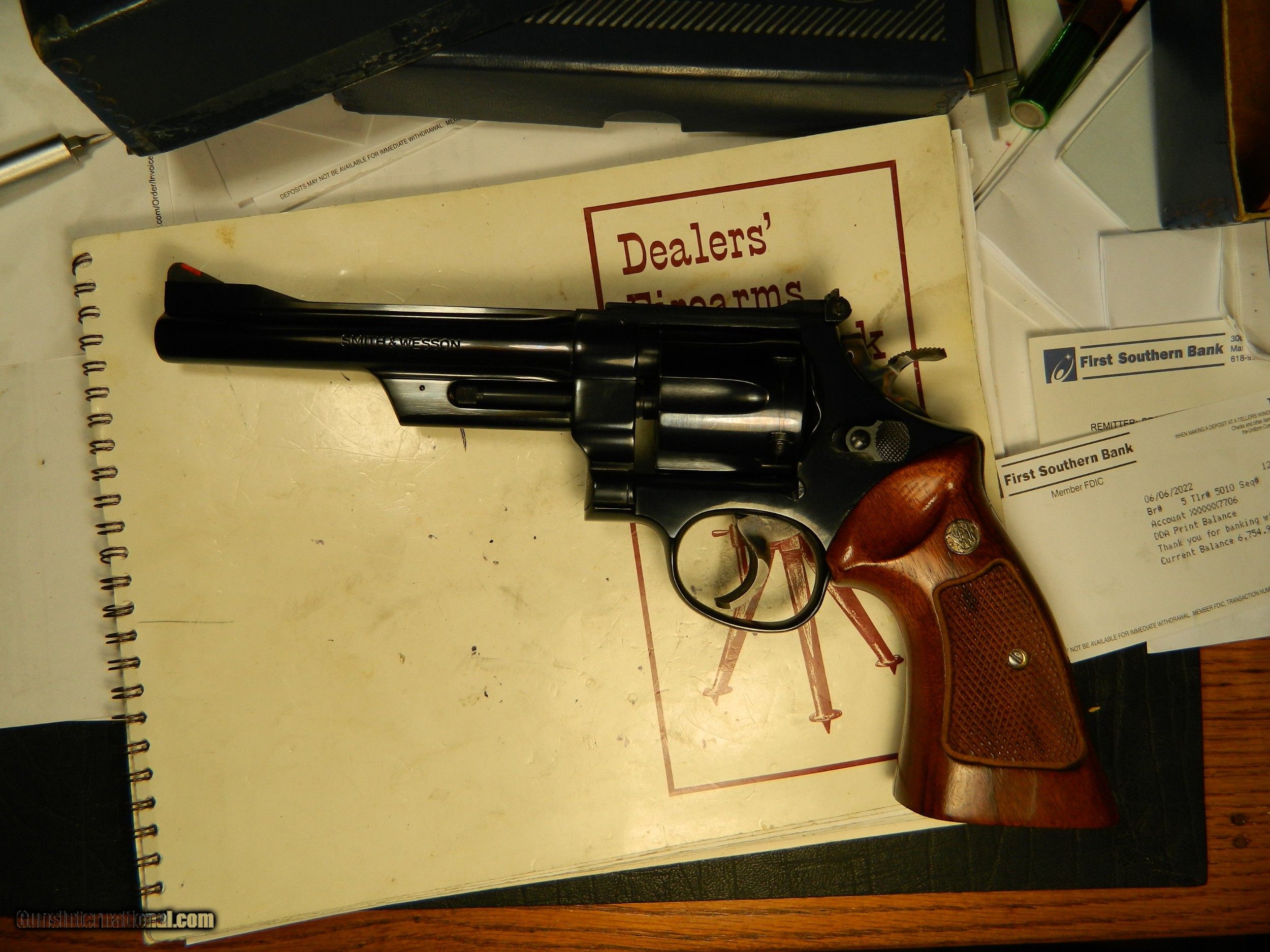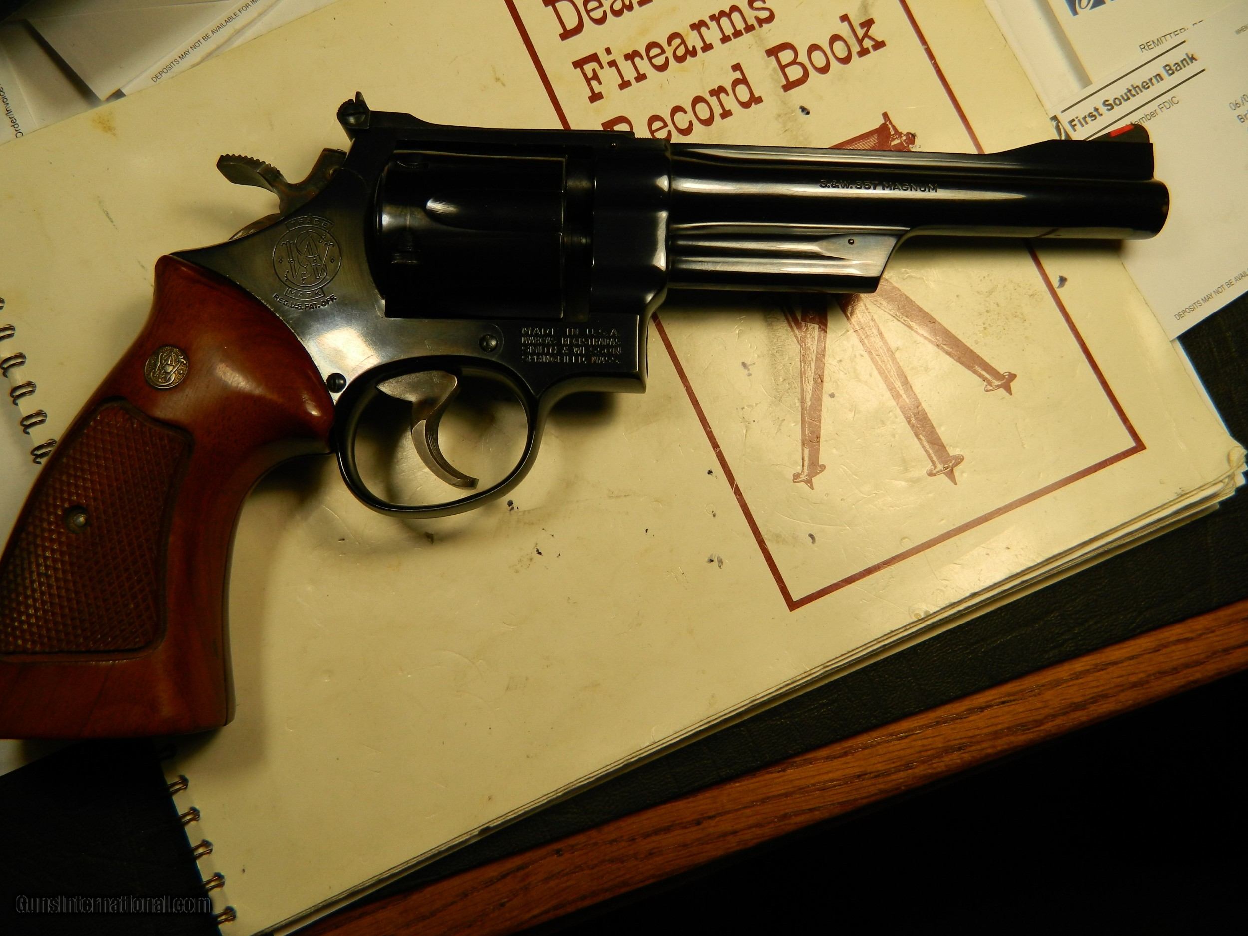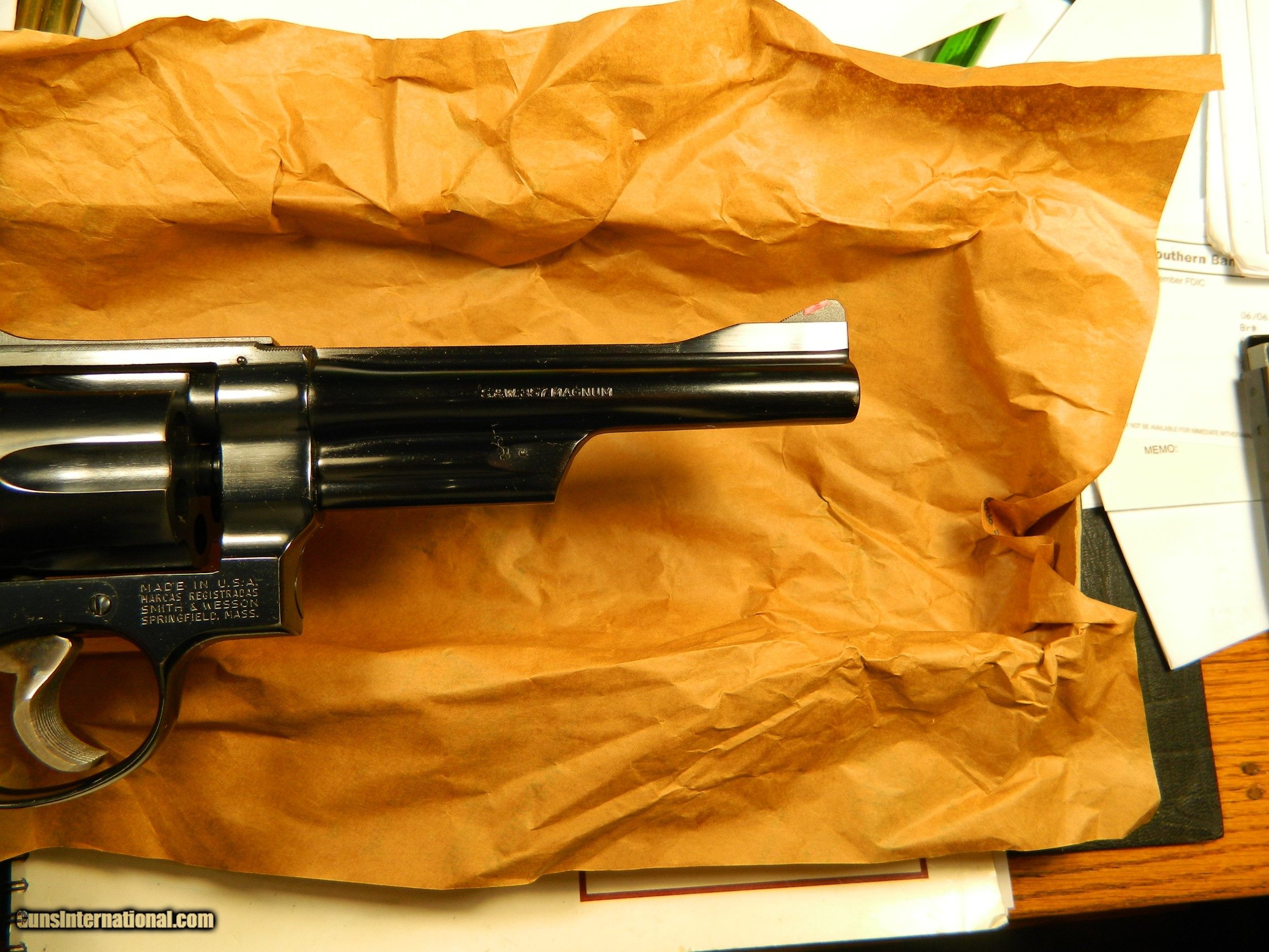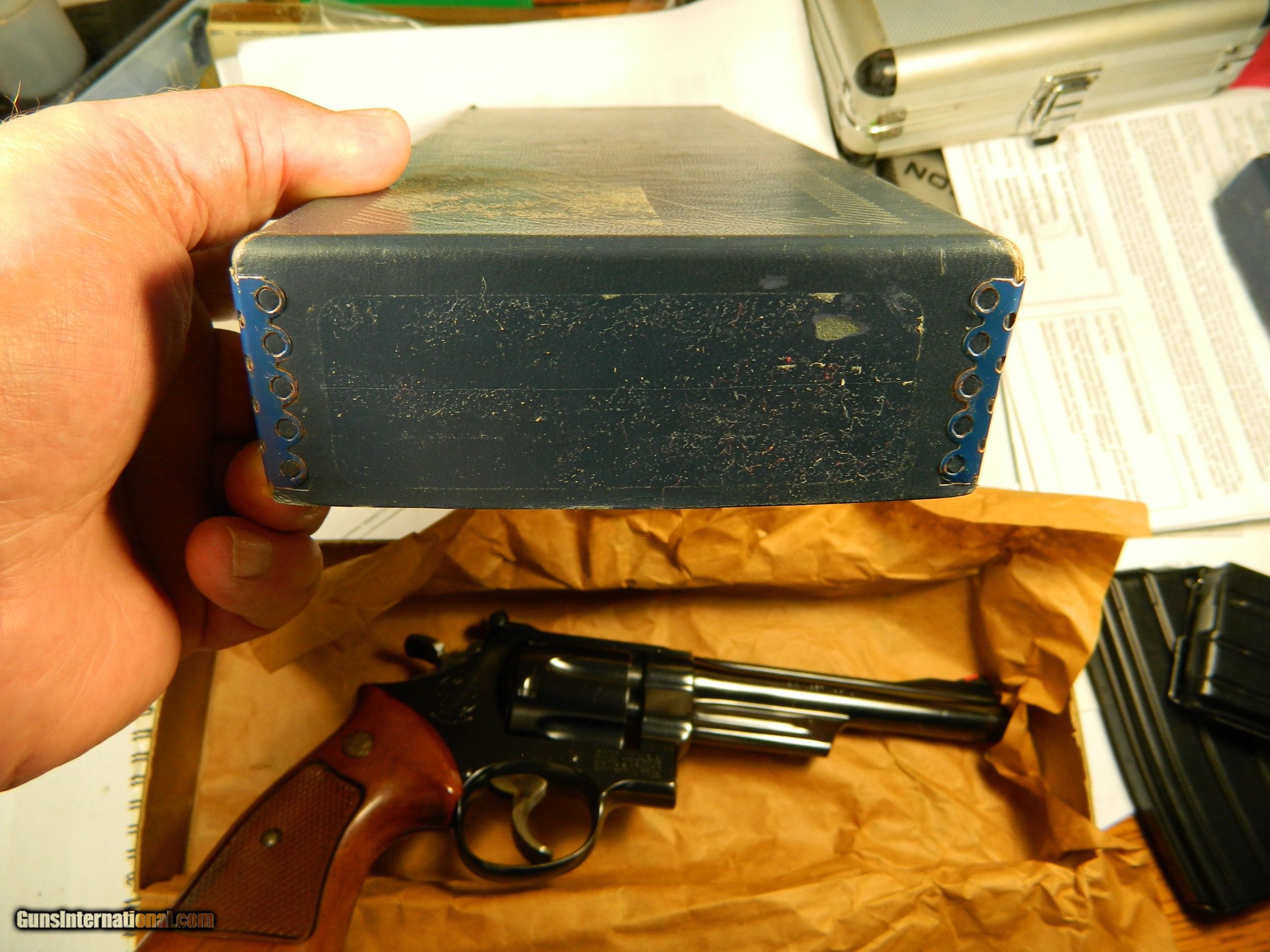 Description: SOLD NO LONGER AVAILABLE....We have in on consignment a 99% all ORIGINAL Smith Wesson model 27. This gun was ordered with a Red Ramp front sight and white outline rear sight. This is a RARITY, as most all of the model 27's were with the partridge front sight. look at picture of front sight which will show this was factory done. Gun also has the three T's..... target hammer ,trigger and target stocks !!!! A tiny spot of edge wear on the right side of the muzzle. Gun shows test firing only, looking at recoil shield and the ejector rod. This gun was made in 1980, so a Wonderful 40 year old Smith, when they had Quality, not the sh-t made today!! this is Collector Quality... has factory box, with rust paper, but no other paperwork. if you need more picters, Please ask. I have added 4 more pictures of gun wiped down. I use a 'rig rag' to keep the guns rust free.with customers handling them, it's too easy to get light rust forming, so any spots are grease or remnants of on gun. This is collection worthy for sure!! SOLD |