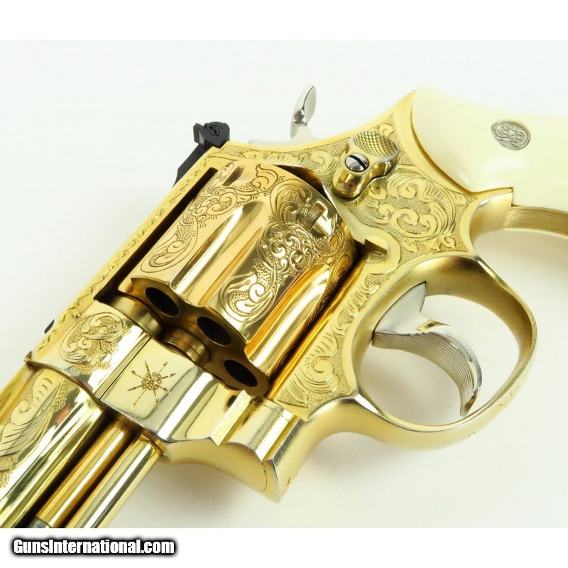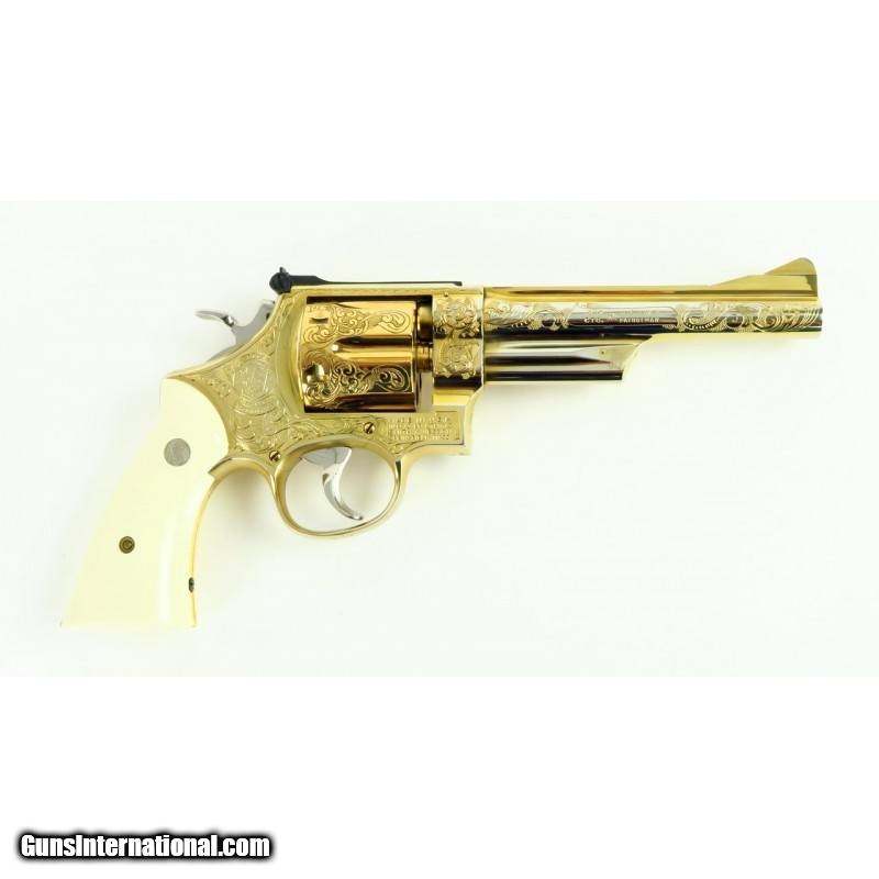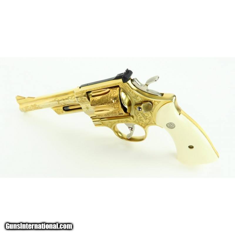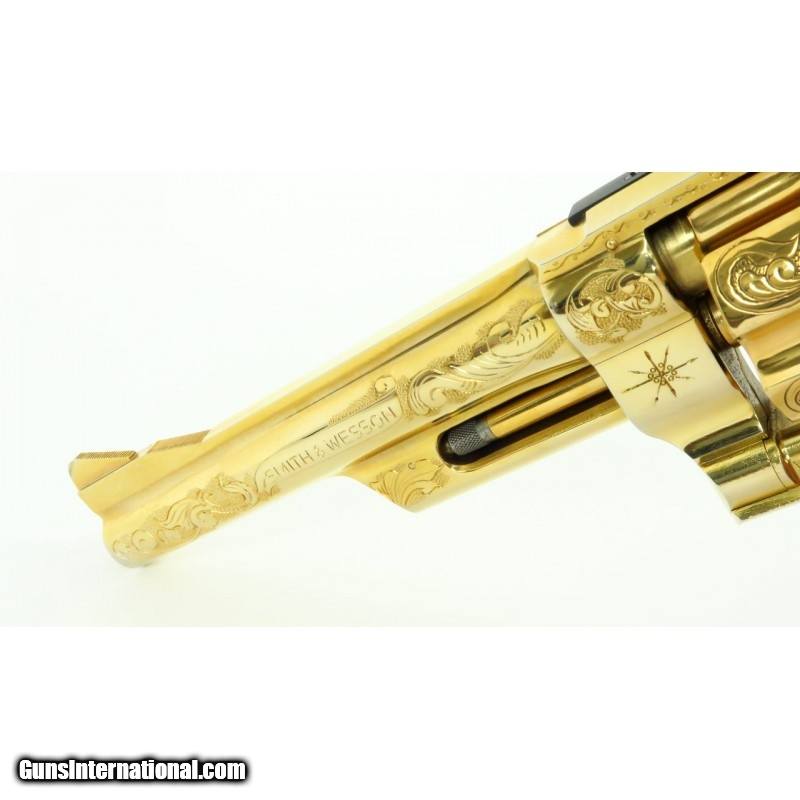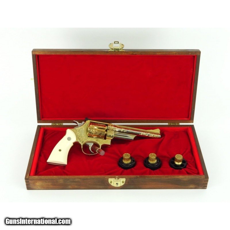 Description: "Smith & Wesson 28-2 .357 Magnum caliber revolver. Custom engraved and gold plated Highway Patrolman. Has fancy scroll in about 75% coverage. Excellent condition with wooden presentation case, includes 3 engraved and gold plated speed loaders. A beautiful set. SOLD |