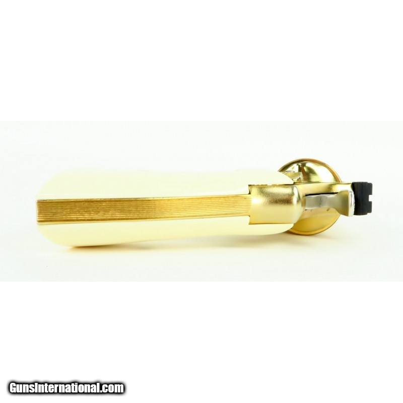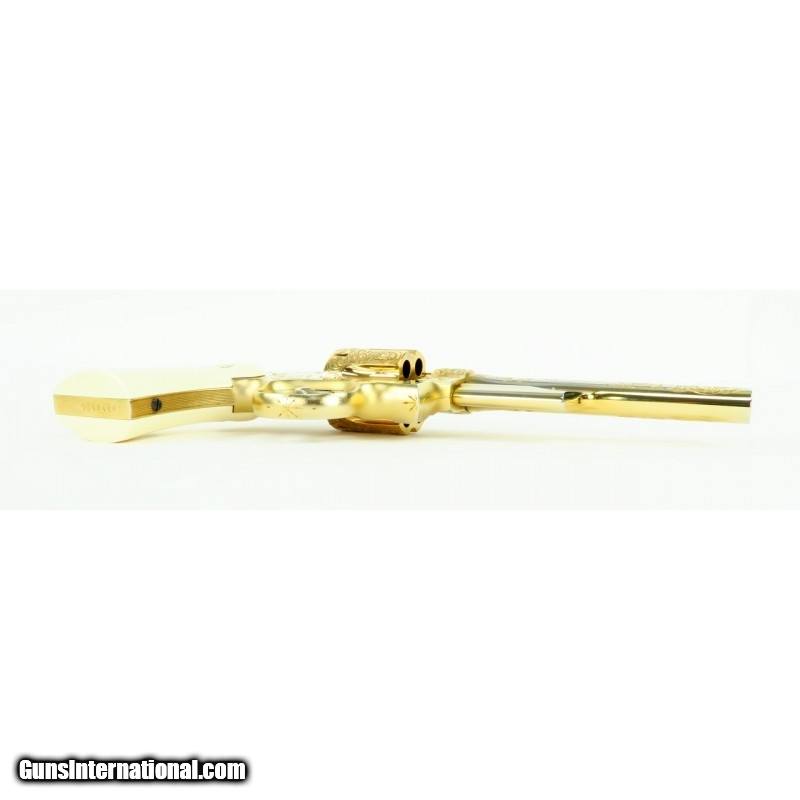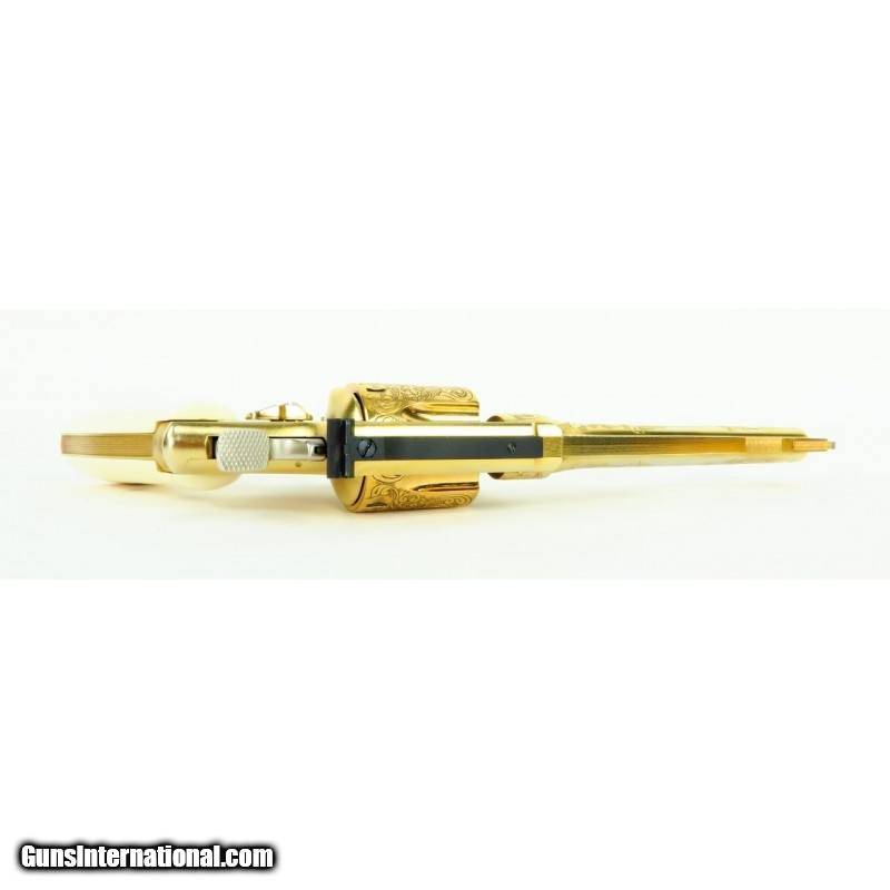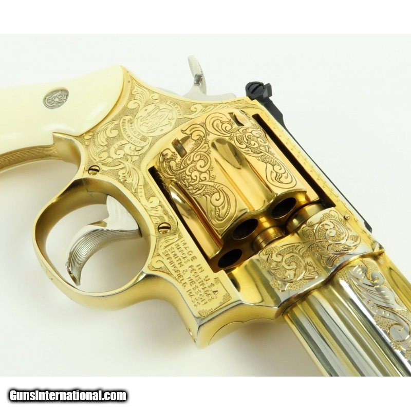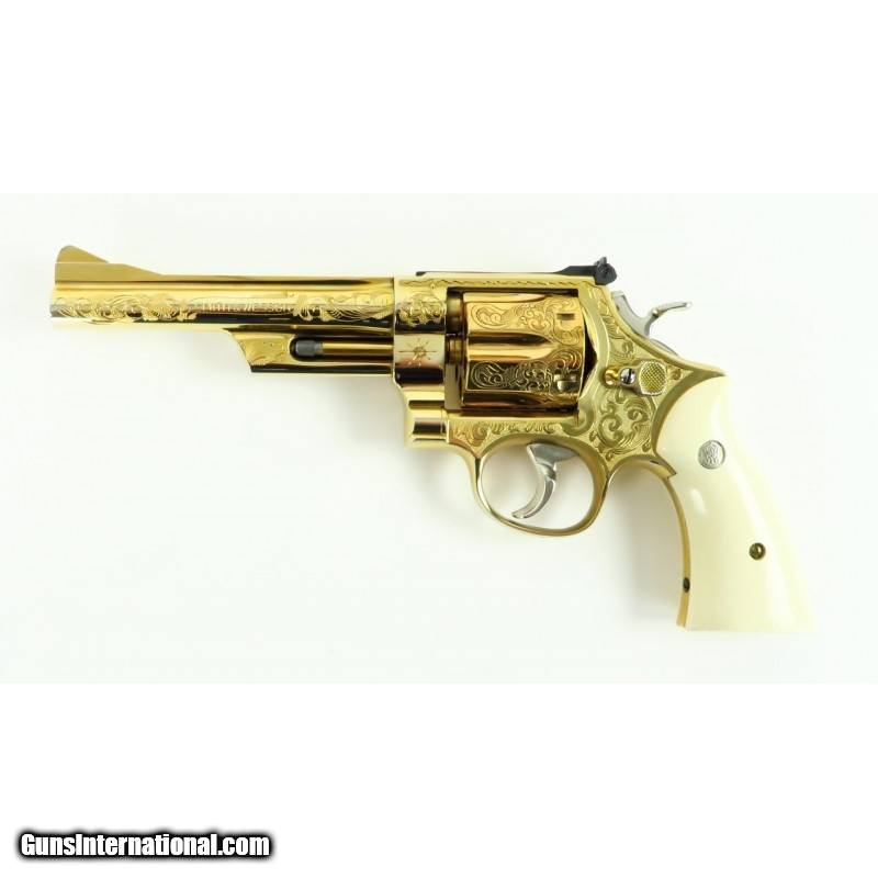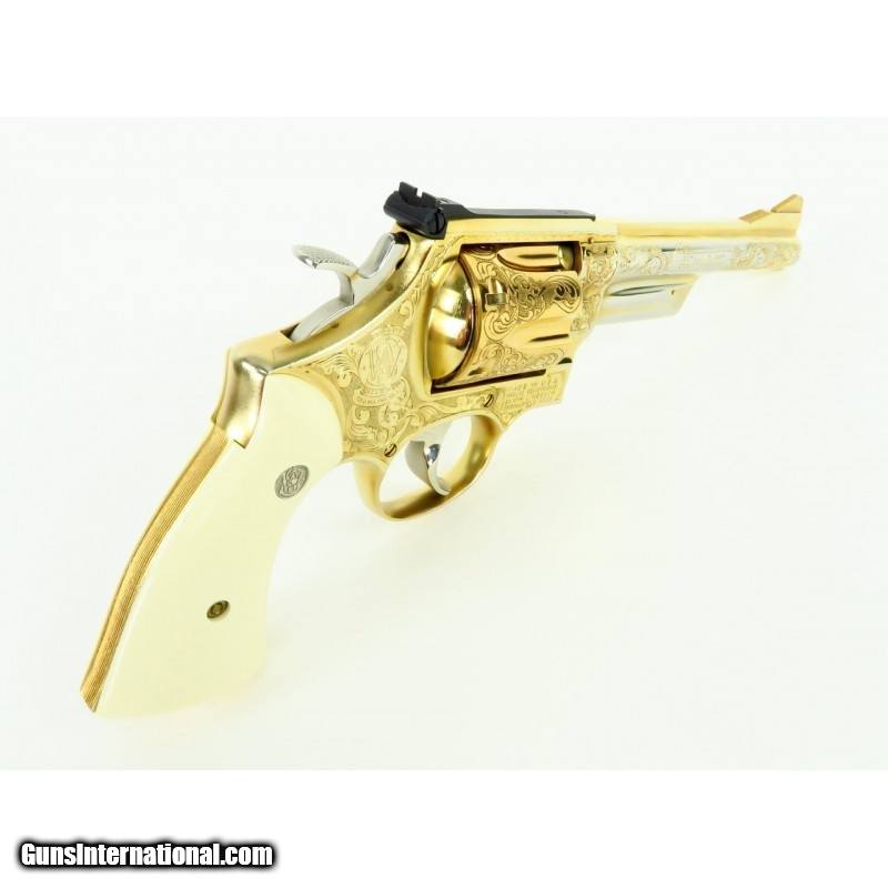 Description: "Smith & Wesson 28-2 .357 Magnum caliber revolver. Custom engraved and gold plated Highway Patrolman. Has fancy scroll in about 75% coverage. Excellent condition with wooden presentation case, includes 3 engraved and gold plated speed loaders. A beautiful set. SOLD |