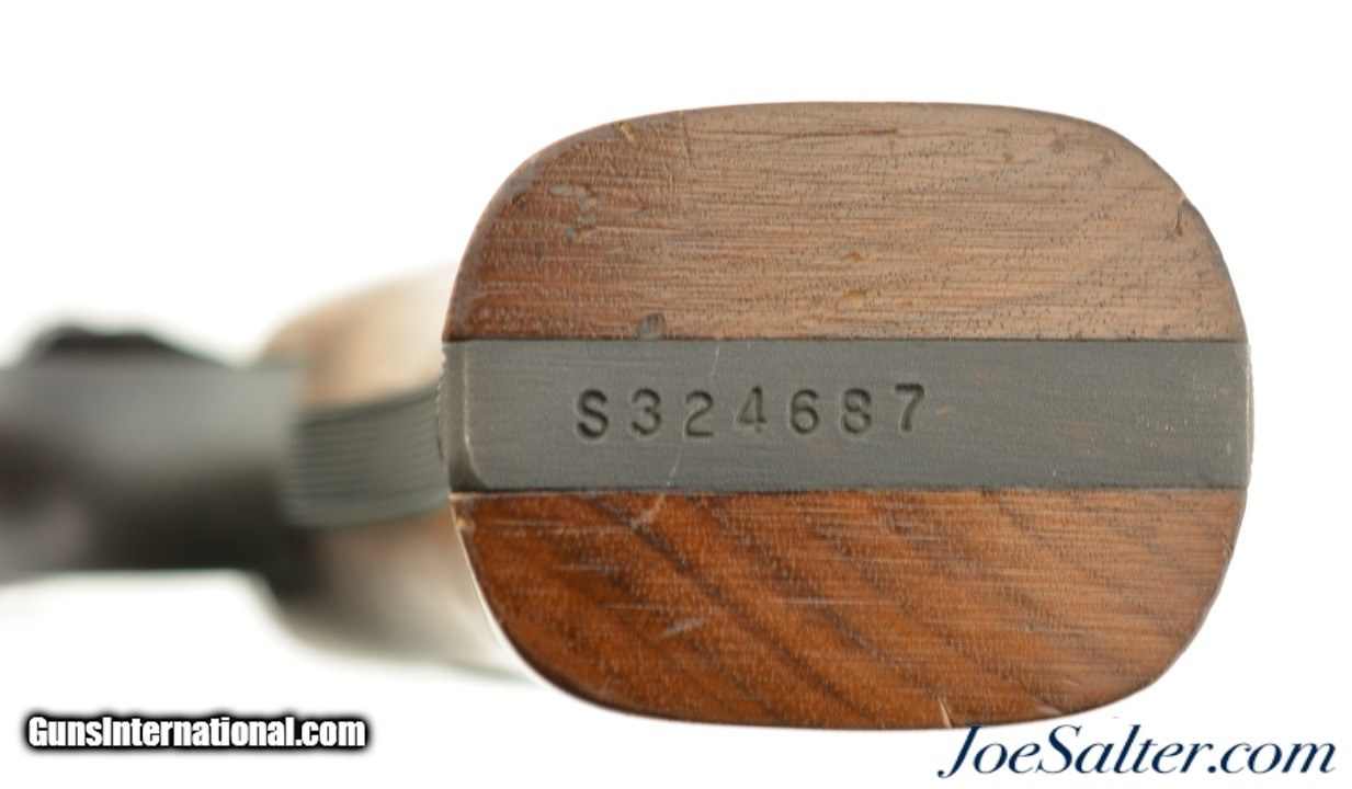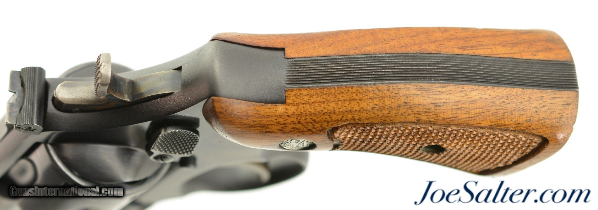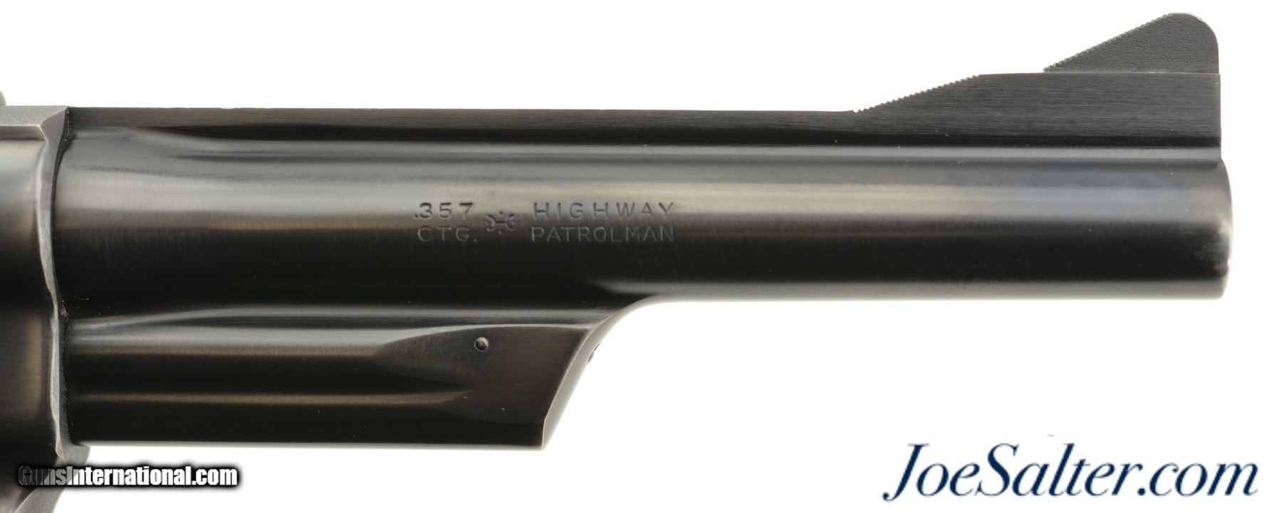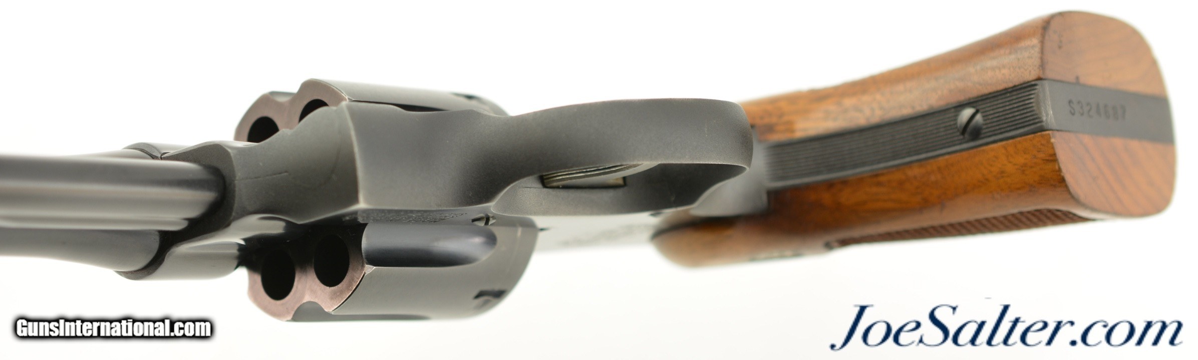 Description: Serial #S324687, .357 Magnum, 6 inch pinned round ribbed barrel with a bright excellent bore. This is the Highway Patrolman Model 28-2 double action manufactured by Smith & Wesson circa 1968. The large N frame revolver features a non-serrated rib an a 1/8" Baughman Quick Draw front sight and click-adjustable micrometer rear sight marked on the barrel ".357/CTG HIGHWAY/PATROLMAN". In excellent condition the barrel, frame and cylinder retain virtually all, 97-98% of the original blue finish with on a slight drag line on the cylinder. The semi-target hammer and serrated trigger show vibrant case-hardened colors. The Magna style walnut grips with S&W medallion rate excellent with some minor use blemishes on the bottom. Mechanically it functions properly with a tight lock up and a very smooth double action trigger pull. A very high condition example of the classic late 1960's S&W revolver. FFL or C&R SOLD Curio/Relic: Yes |