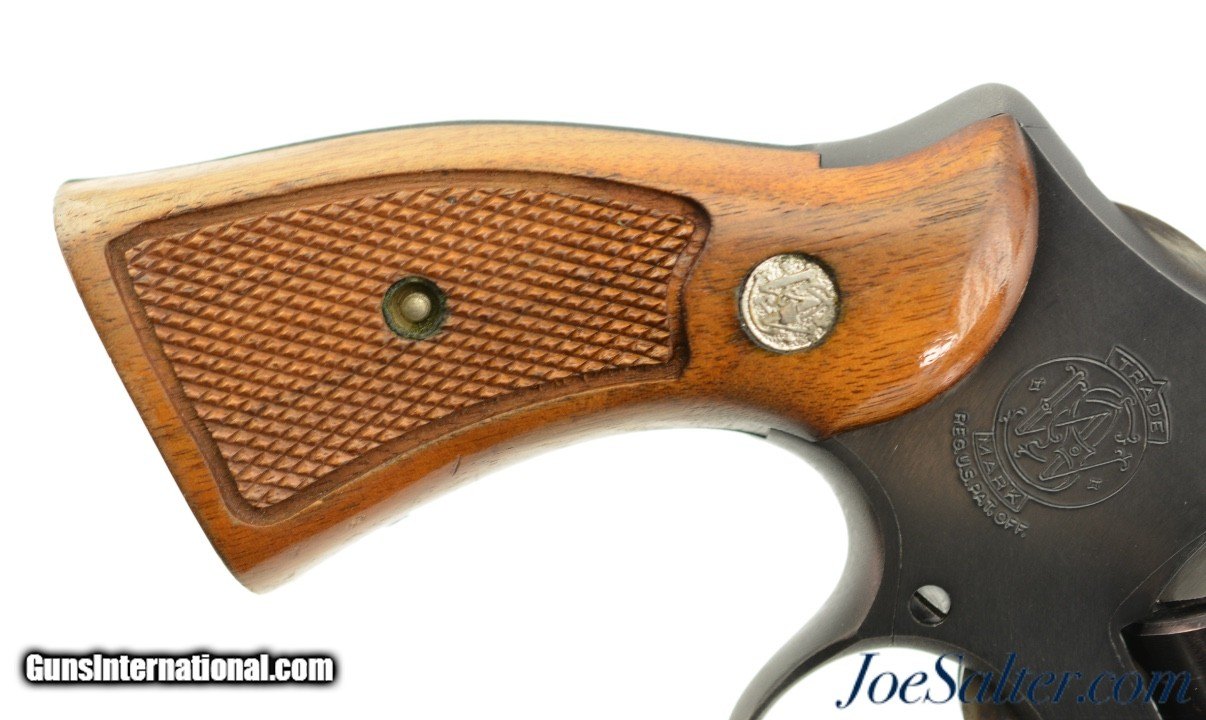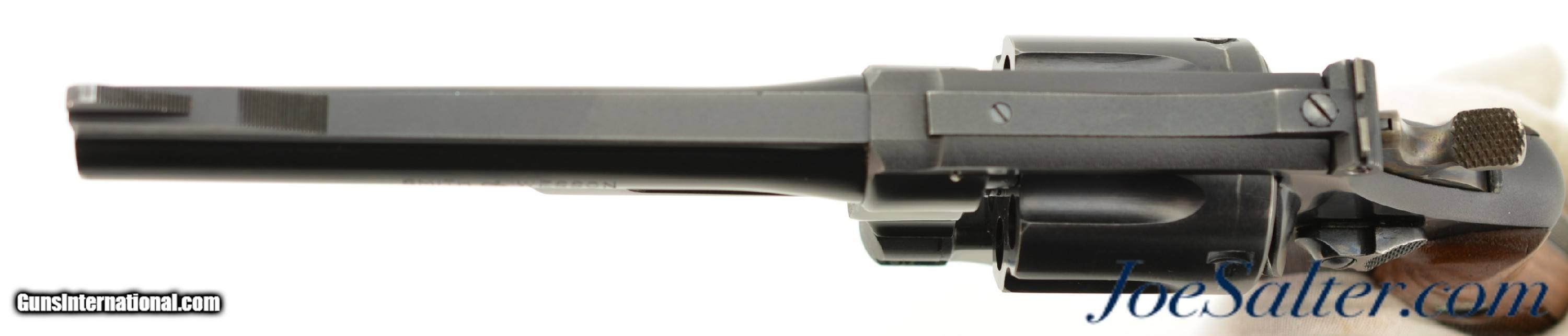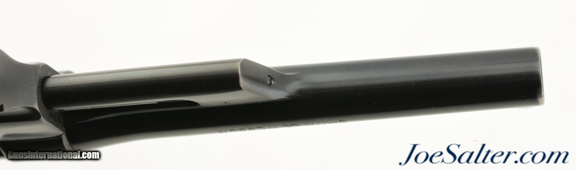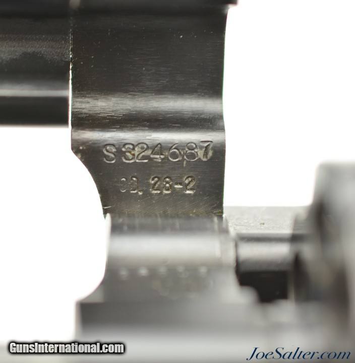 Description: Serial #S324687, .357 Magnum, 6 inch pinned round ribbed barrel with a bright excellent bore. This is the Highway Patrolman Model 28-2 double action manufactured by Smith & Wesson circa 1968. The large N frame revolver features a non-serrated rib an a 1/8" Baughman Quick Draw front sight and click-adjustable micrometer rear sight marked on the barrel ".357/CTG HIGHWAY/PATROLMAN". In excellent condition the barrel, frame and cylinder retain virtually all, 97-98% of the original blue finish with on a slight drag line on the cylinder. The semi-target hammer and serrated trigger show vibrant case-hardened colors. The Magna style walnut grips with S&W medallion rate excellent with some minor use blemishes on the bottom. Mechanically it functions properly with a tight lock up and a very smooth double action trigger pull. A very high condition example of the classic late 1960's S&W revolver. FFL or C&R SOLD Curio/Relic: Yes |