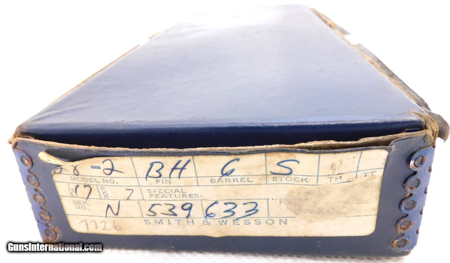 Description: Description: S&W 28-2 Blued Highway Patrolman DA Revolver Manufacturer: Smith & Wesson Model: 28-2 Caliber: .357 Mag Manufactured: 1969-1981 Barrel: 6" ribbed barrel, no serrations on barrel rib Rear Sight: Adjustable square notch Front Sight: Serrated ramp Optic: N/A Finish: Blued Action: Double action/Singe action, mechanically solid, 6 chamber fluted cylinder, checkered cylinder release, serrated trigger, checkered hammer spur, N frame, 3 screw, very light handling marks Grips: Checkered walnut square butt with S&W medallions inset Accessories: Original numbered box Condition: This is an excellent used revolver Serial Number: N539633 Sprague's Number: 142026 This handgun will be a GREAT addition to your future outings! Add 3% for Credit Card Shipping: $35.00 in the 48 contiguous United States SOLD |