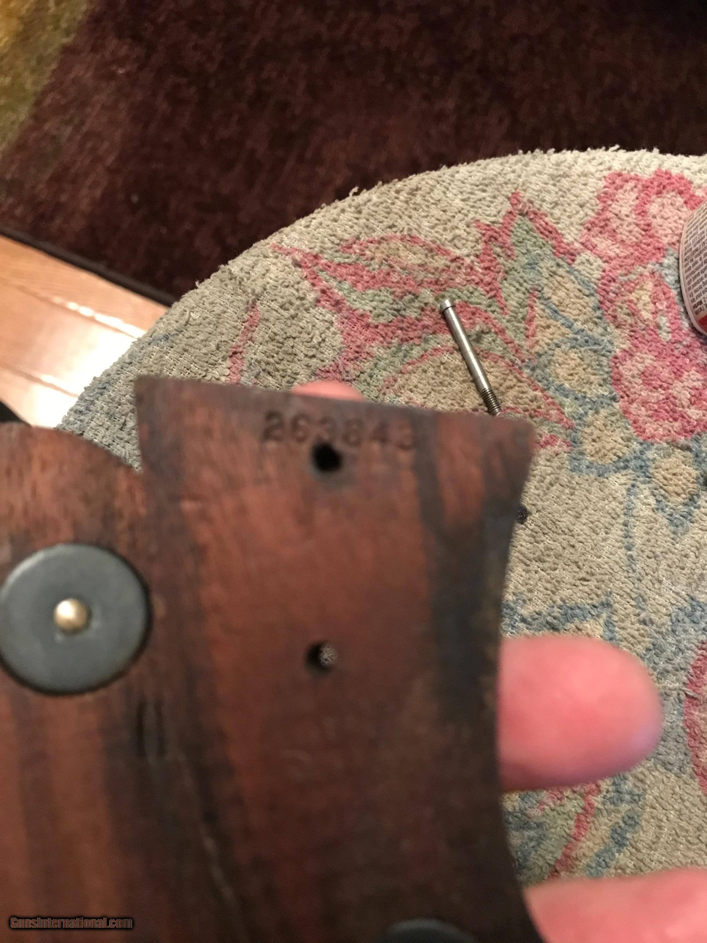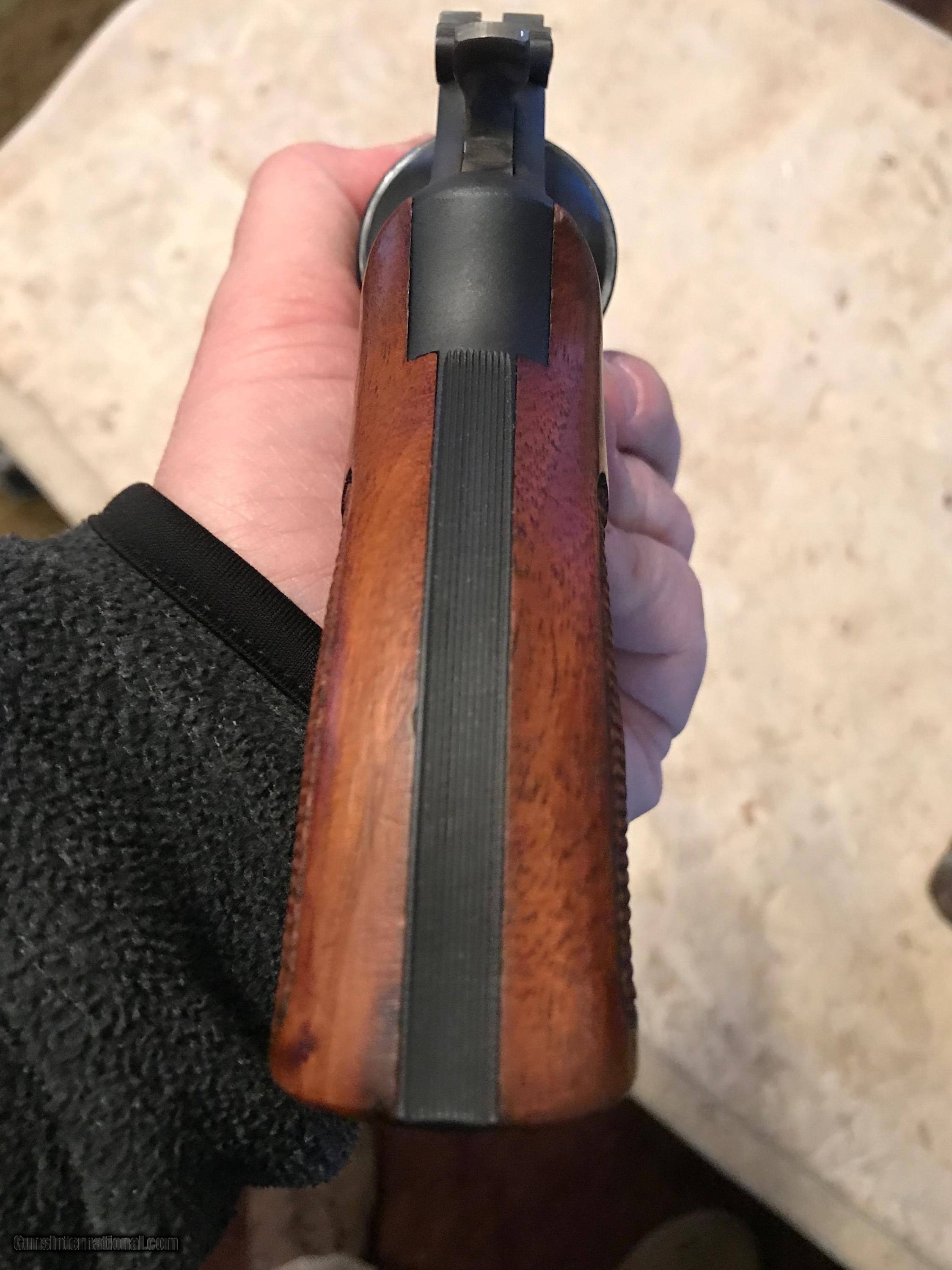 Description: What a nice gun! These 28s have become more popular lately. An S prefix in the original box... rare! This gun has a 4 inch pinned barrel, recessed cylinder, target sights, numbered wood grips, case hardened hammer and trigger. A beautiful piece! Please email with questions. Shipping included. Cards add 3% SOLD Manufacturer: Smith and Wesson Model: 28-2 Barrel Length: 4 in Condition: Excellent Metal Condition: Excellent Wood Condition: Excellent Bore Condition: Excellent Action: Double Finish: Blue Sights: Target Item Location: 37075 |