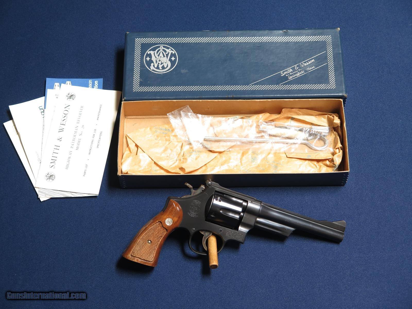 Description: Smith & Wesson 28-2 Highway Patrolman 357 magnum. 6 inch pinned barrel. Recessed cylinder. 98% condition. With matching box and papers. SOLD |