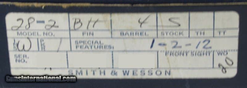 Description: Guns Listing ID: 904718 Up for sale is a gently used S&W 28-2 Highway Patrolman Revolver (.357 Mag.). This item has a 4” barrel, adjustable rear sight and checkered wood stocks. The blueing is in nice condition with only a hint of wear on the bottom of the trigger guard. The stocks are also in great condition with no visible scratches or chips in the wood. Comes in the original box. SOLD Manufacturer: SMITH & WESSON Model: 28-2 Highway Patrolman Caliber Info: .357 MAG Condition: Used - Non-Certified Barrels: 4 BARREL Finish: BLUE |