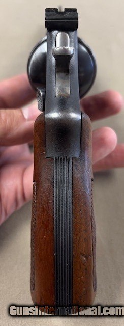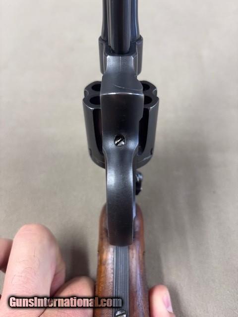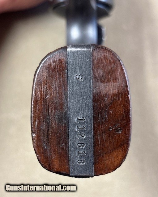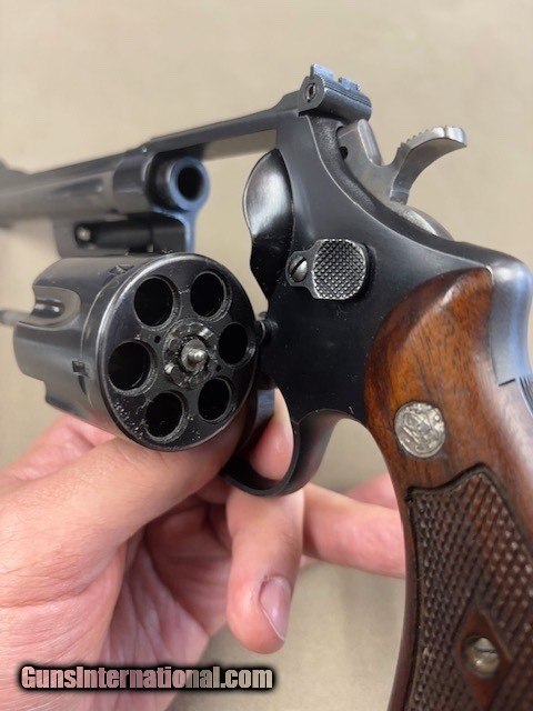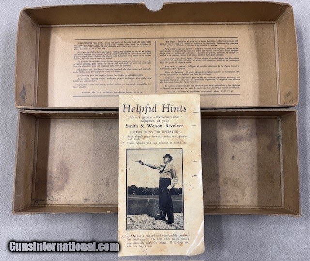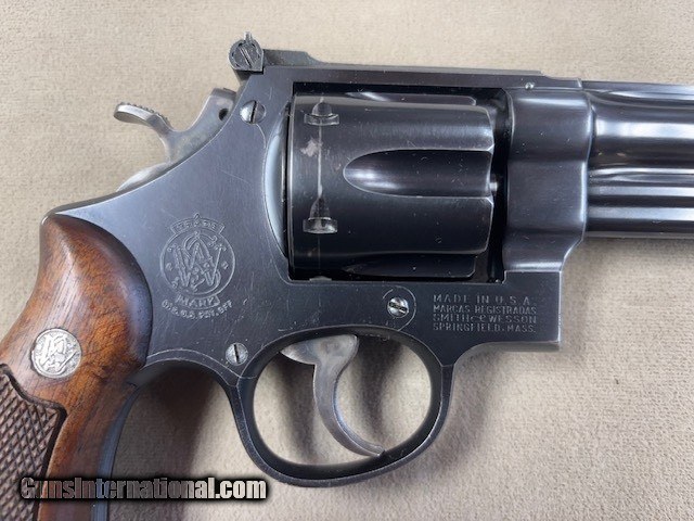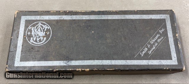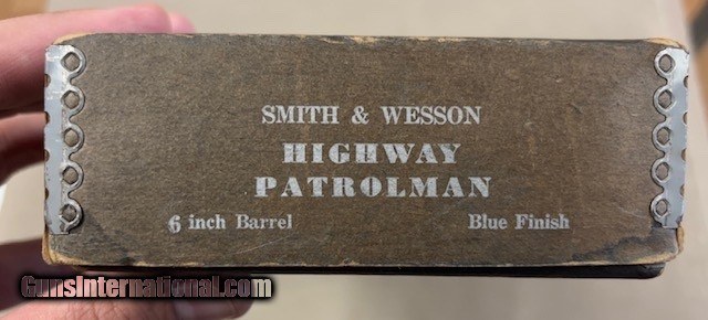 An excellent original condition Smith & Wesson 5 screw Pre Model 28, commonly referred to as a Highway Patrolman, with a 6 inch barrel in .357 Magnum caliber. Revolver is the 5 screw version and has the original and factory diamond checkered magna grips. In addition we have the original S&W box with helpful hints for enjoying your S&W Revolver. About 98% overall condition with a perfect bore and chambers. S prefix serial number. Box shows a bit of exterior fading but is correct.