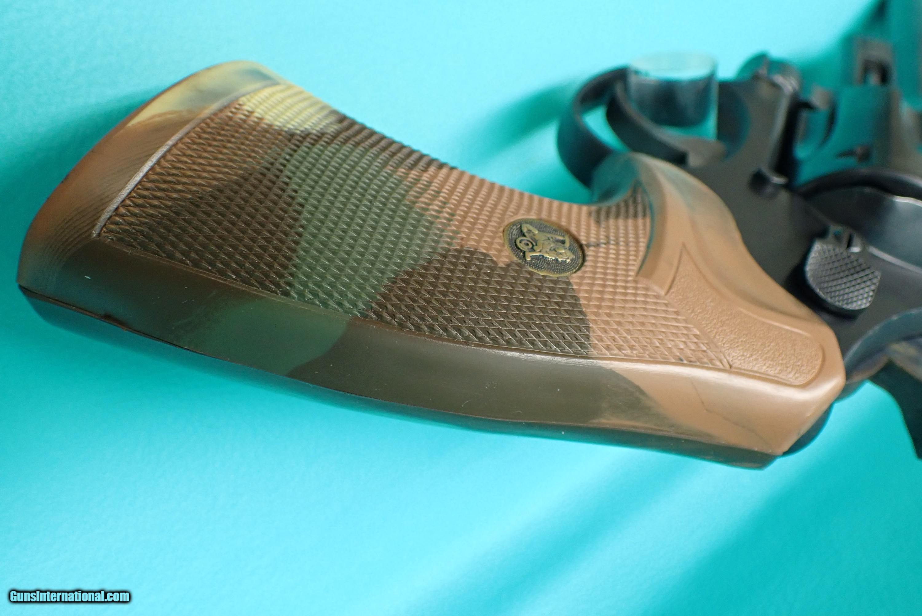 Description: ***SOLD**Smith & Wesson Model 28-2 .357 Magnum revolver, dated to 1979-80. This revolver features a solid steel N Frame finished in a deep blue, with color case hardened hammer and trigger, pinned barrel and recessed cylinder face. The revolver is in great shape for its age, with some minor finish wear and small scuffs in high contact areas, and much of the original blue still intact. The timing and lockup are smooth and solid, with brilliant bore and chamber surfaces. The revolver is fitted with Pachmayr molded-in camo stocks. Please refer to the photos for overall condition. A lovely collectible and shooter! No handgun sales in MA. Shipping $25.00***SOLD*** SOLD Handgun Caliber: .357 Magnum Manufacturer: S&W Model: 28-2 Serial Number: N532611 |