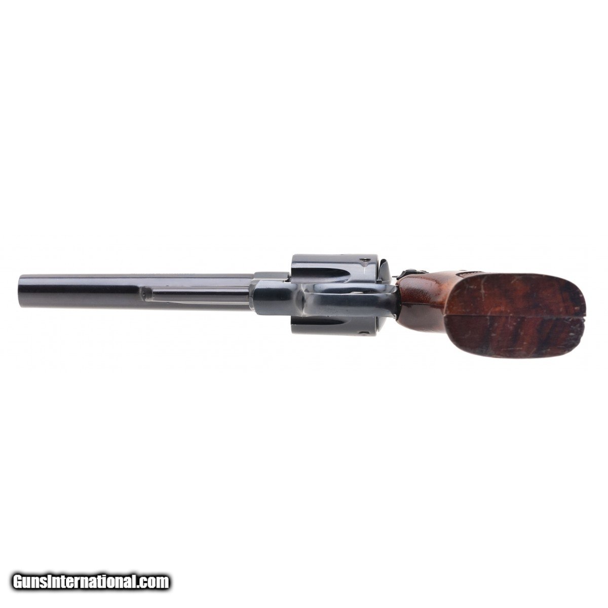 Description: " SN: N859005. Made circa 1970's. .44 MAG with a 6"" Pinned barrel. Bore is excellent. N frame Smith & Wesson with a recessed cylinder. Blue finish is in very good condition with thinning near the muzzle. Wood grips are in very good condition with light handling wear near the bottom of the grips. Overall very good condition. Consignment. SOLD |
