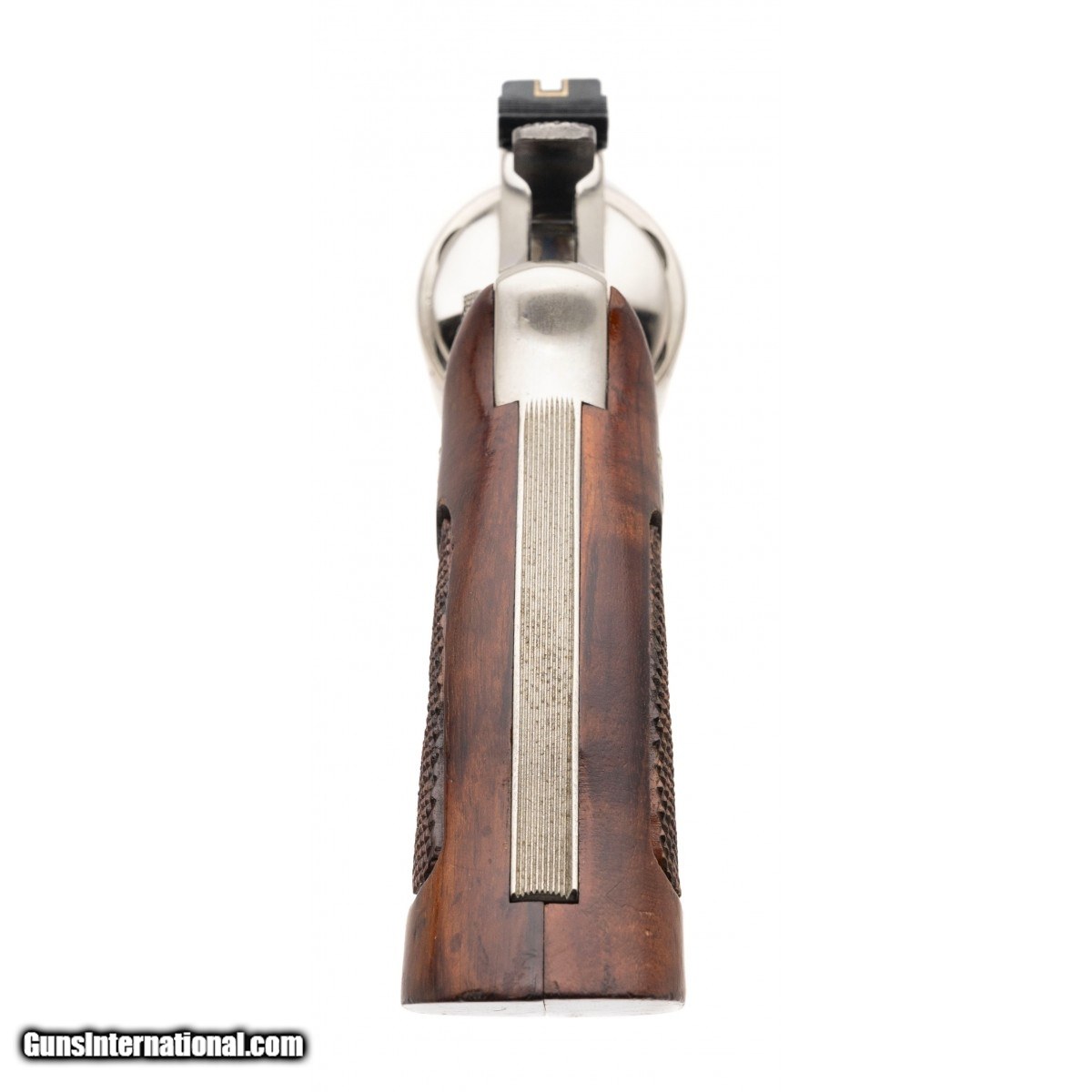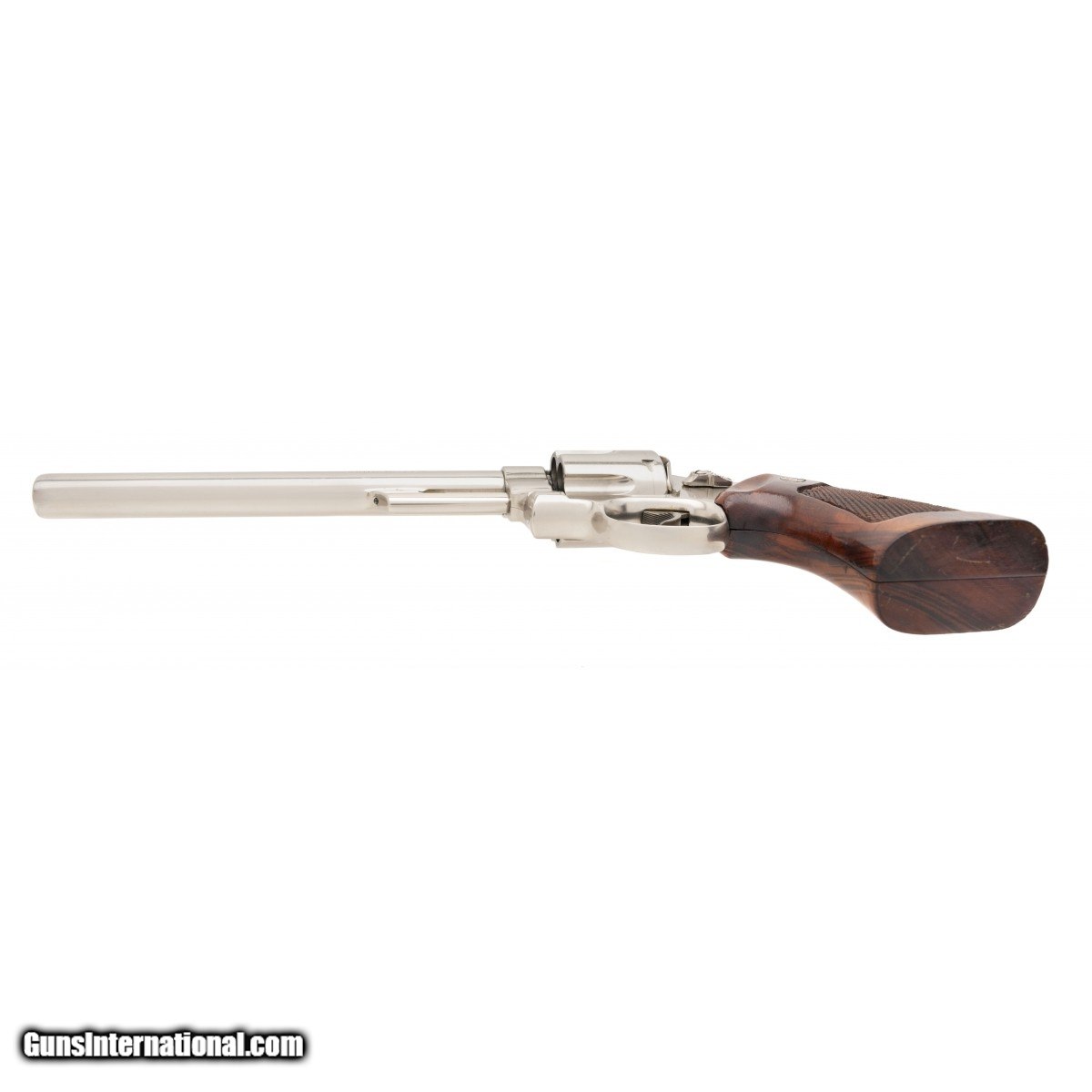 Description: "SN:N357540. made circa 1970's. .44 Magnum with a 8 3/8"" pinned barrel. Bore is in excellent condition. Vintage 70's nickeled Double action revolver. Finish and wooden grips are in very good condition with wear noted on barrel and grips. Revolver is pinned and recessed. Overall condition is very good. SOLD |