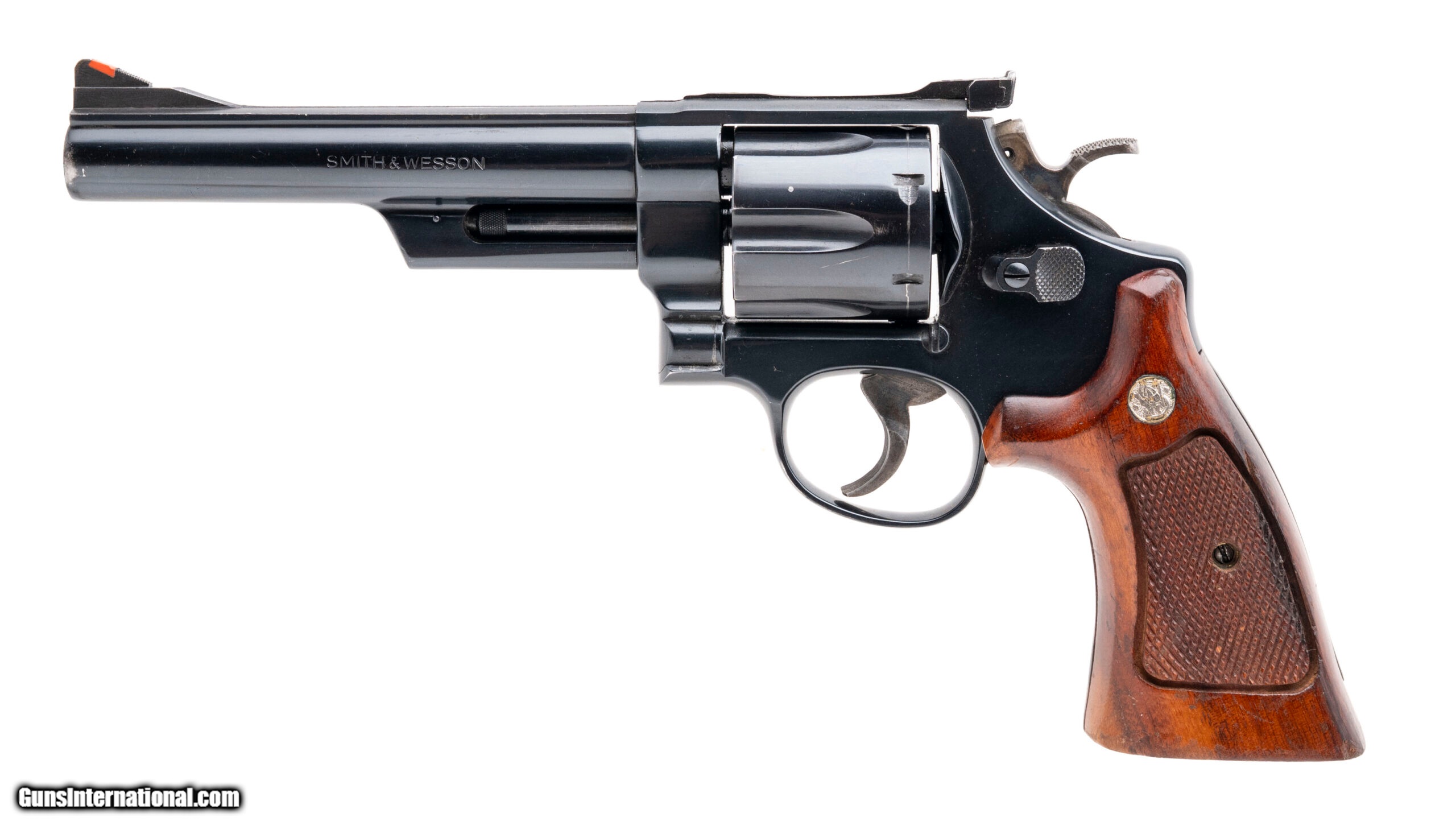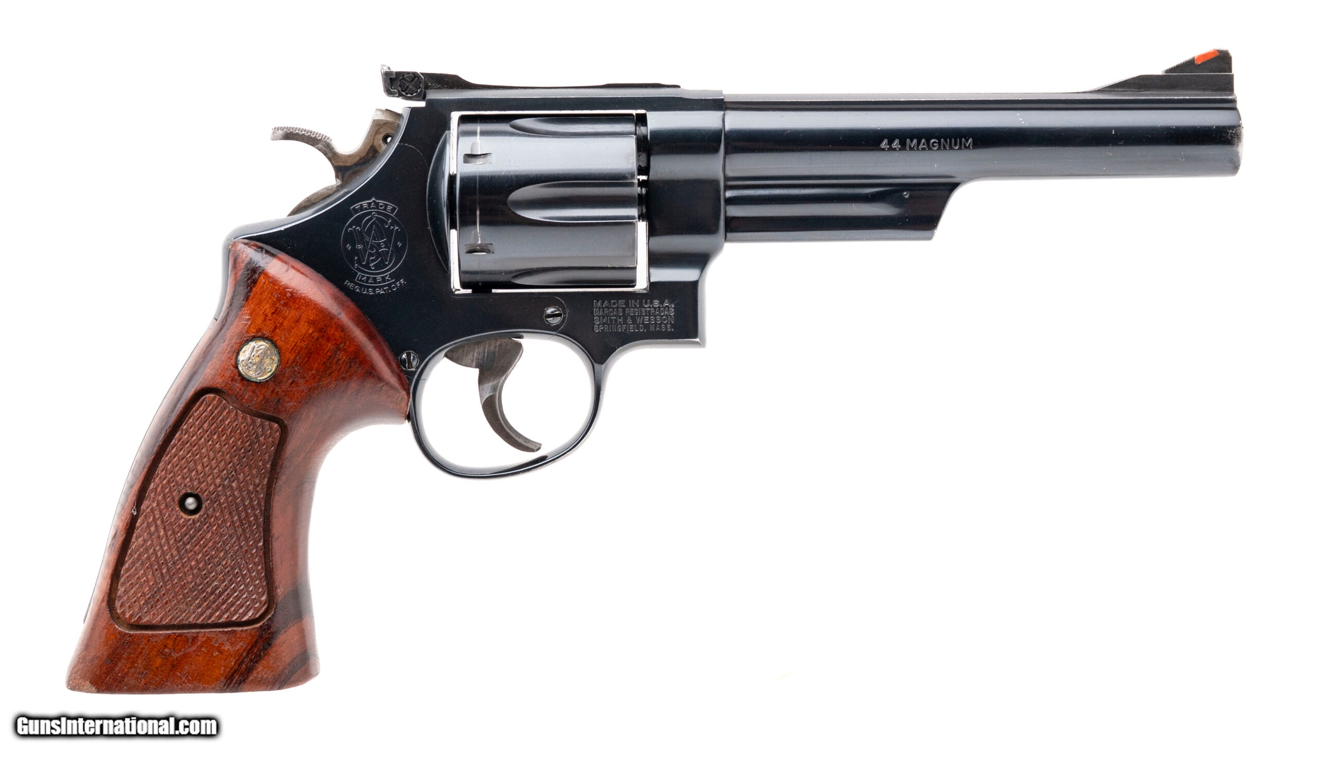 Description: "SN: ADY8613. 1980's vintage .44 Mag with a 6"" barrel. Blued N-frame revolver with wooden grips. Has about 90% original blue with even carry wear. The grips are good with wear along the bottom edge. Overall very good condition. SOLD |