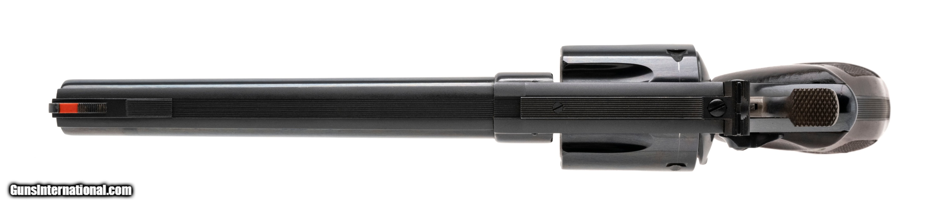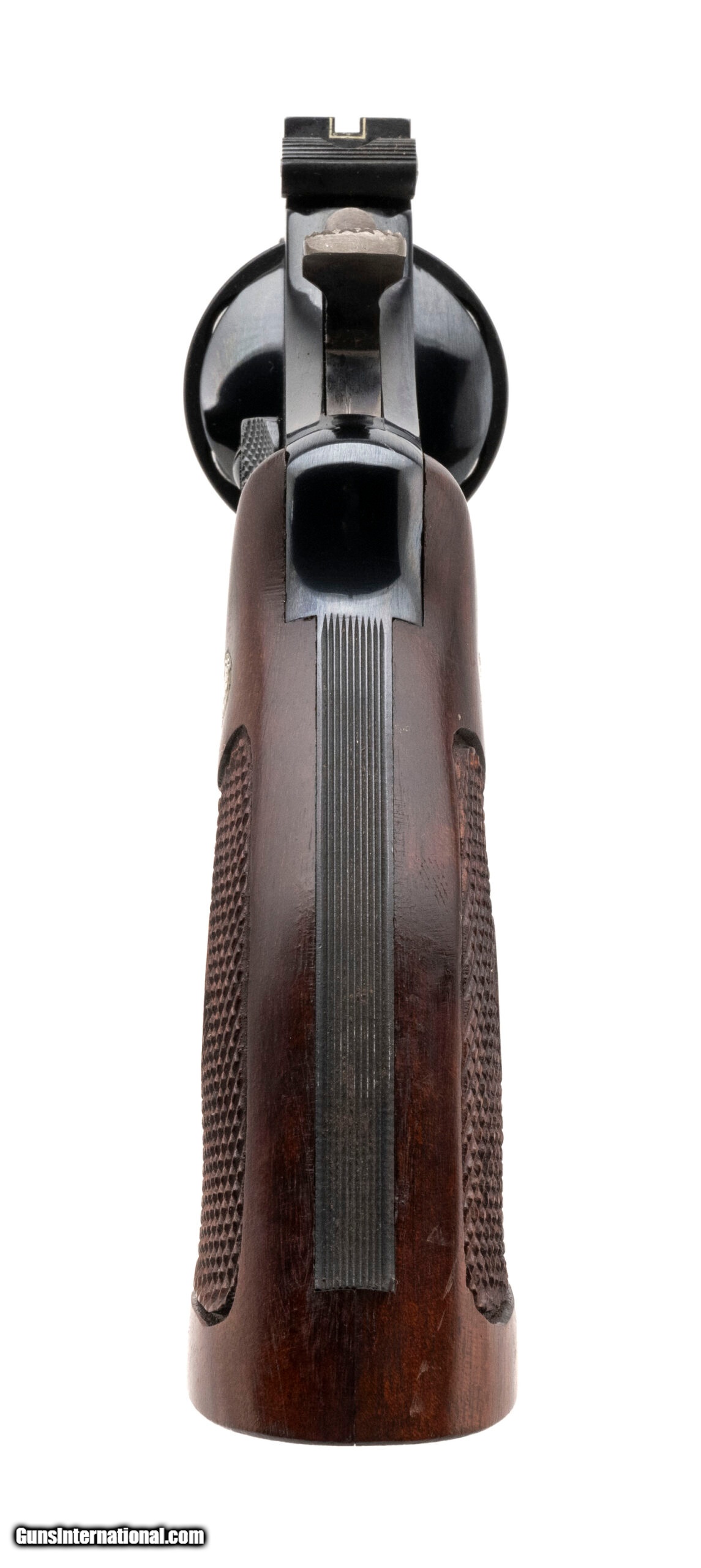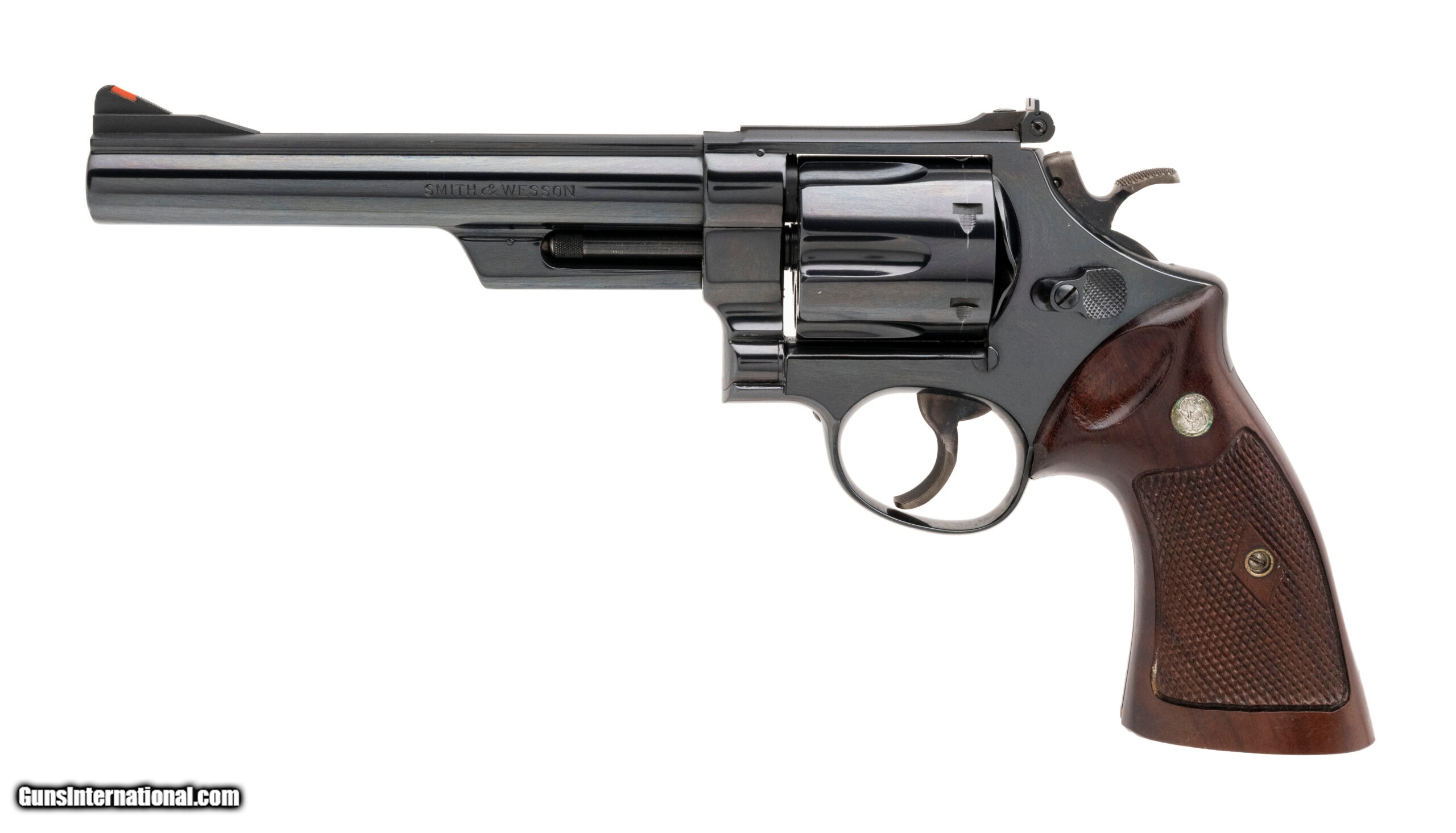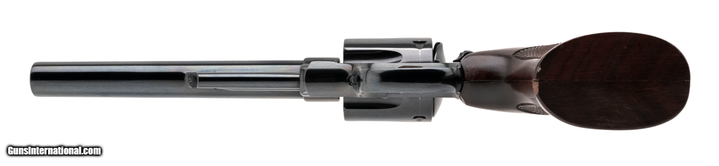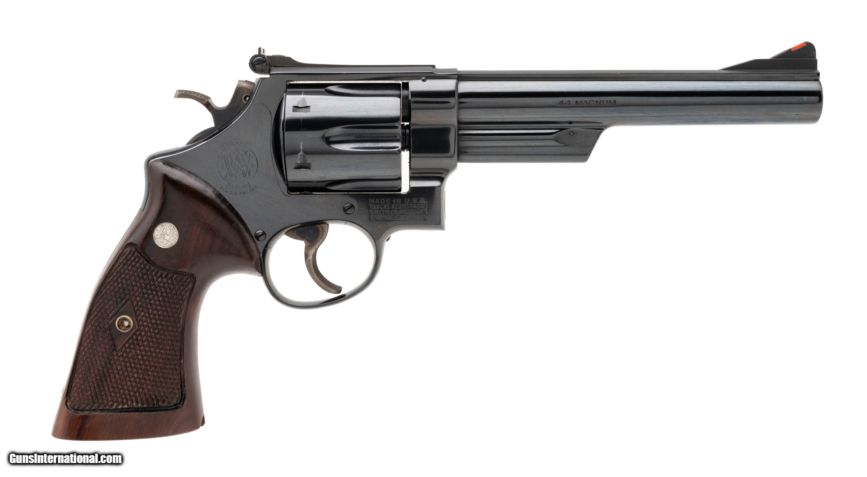 Description: "SN: S196490. Made in 1959, .44 Magnum with a 6.5"" barrel. Bore is bright with strong rifling. Fourth screw N-frame revolver with pinned barrel & recessed cylinder. Blued finish shows light marks but is in very good condition. Diamond checkered wood grips has a chip near the base but are in very good condition. SOLD Curio/Relic: Yes |