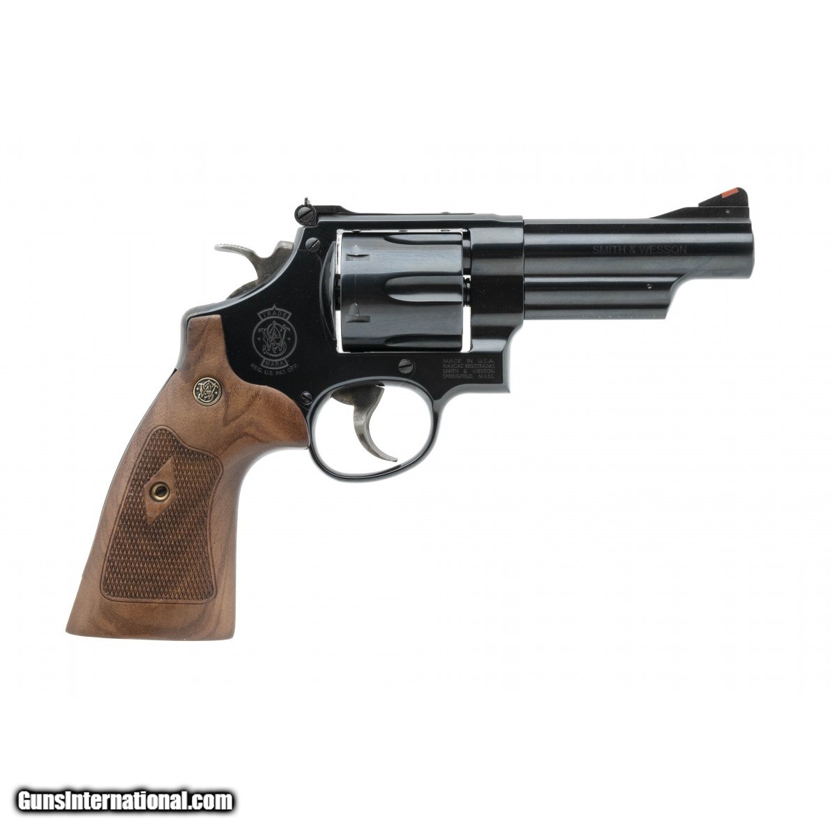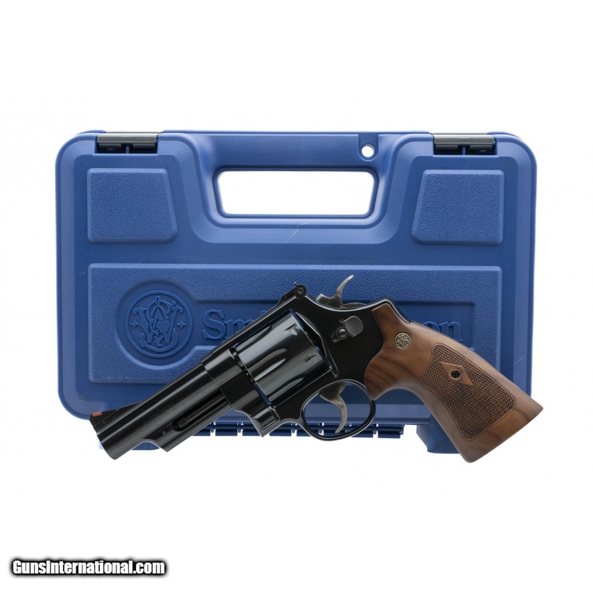 Blued magnum revolver with 4"" barrel, adjustable sights, and wooden grips. NEW. UPC:022188133059.
