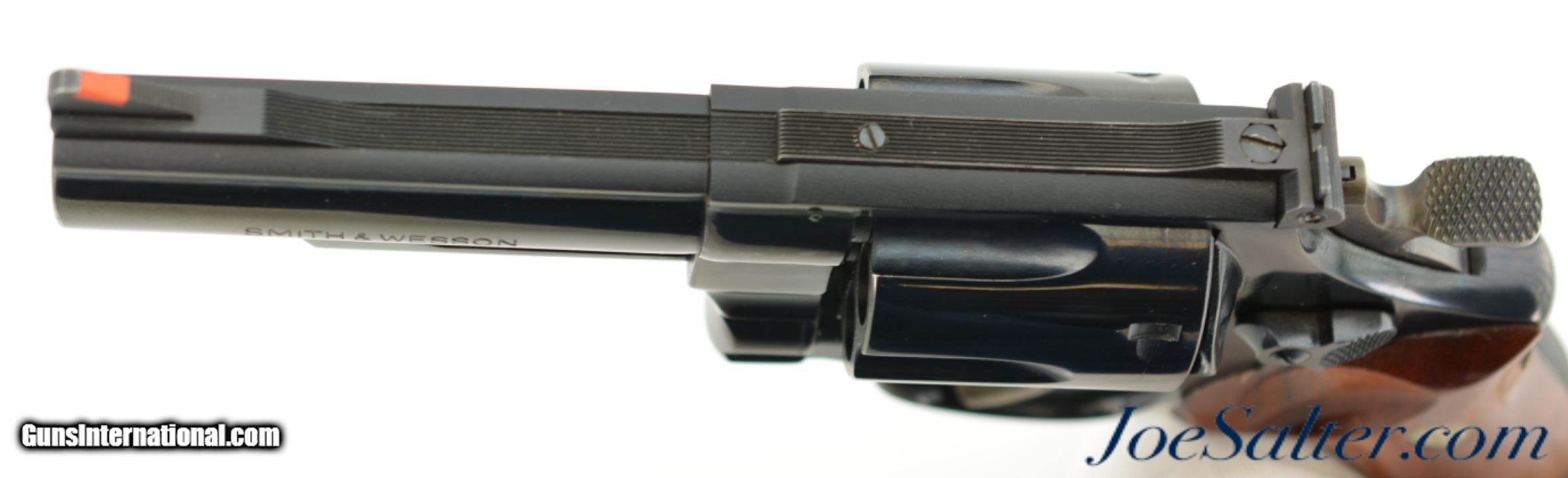 Description: Serial #N794844, .44 Magnum, 4 inch pinned barrel with a bright, excellent bore. This is the Smith & Wesson Model 29-2 revolver with this "N" prefix series built from 1969-1982. In excellent condition the barrel frame and cylinder retain virtually all, 97-99% of the original blue finish with only a very slight drag line on the cylinder and wear at the muzzle. The wide target trigger and hammer show virtually all of the original bright case colors. It is sighted with an adjustable rear and red insert ramp front sights. The oversize smooth target S&W monogram grips are not original to gun but remain in excellent condition. A fantastic 29-2 revolver. FFL SOLD |