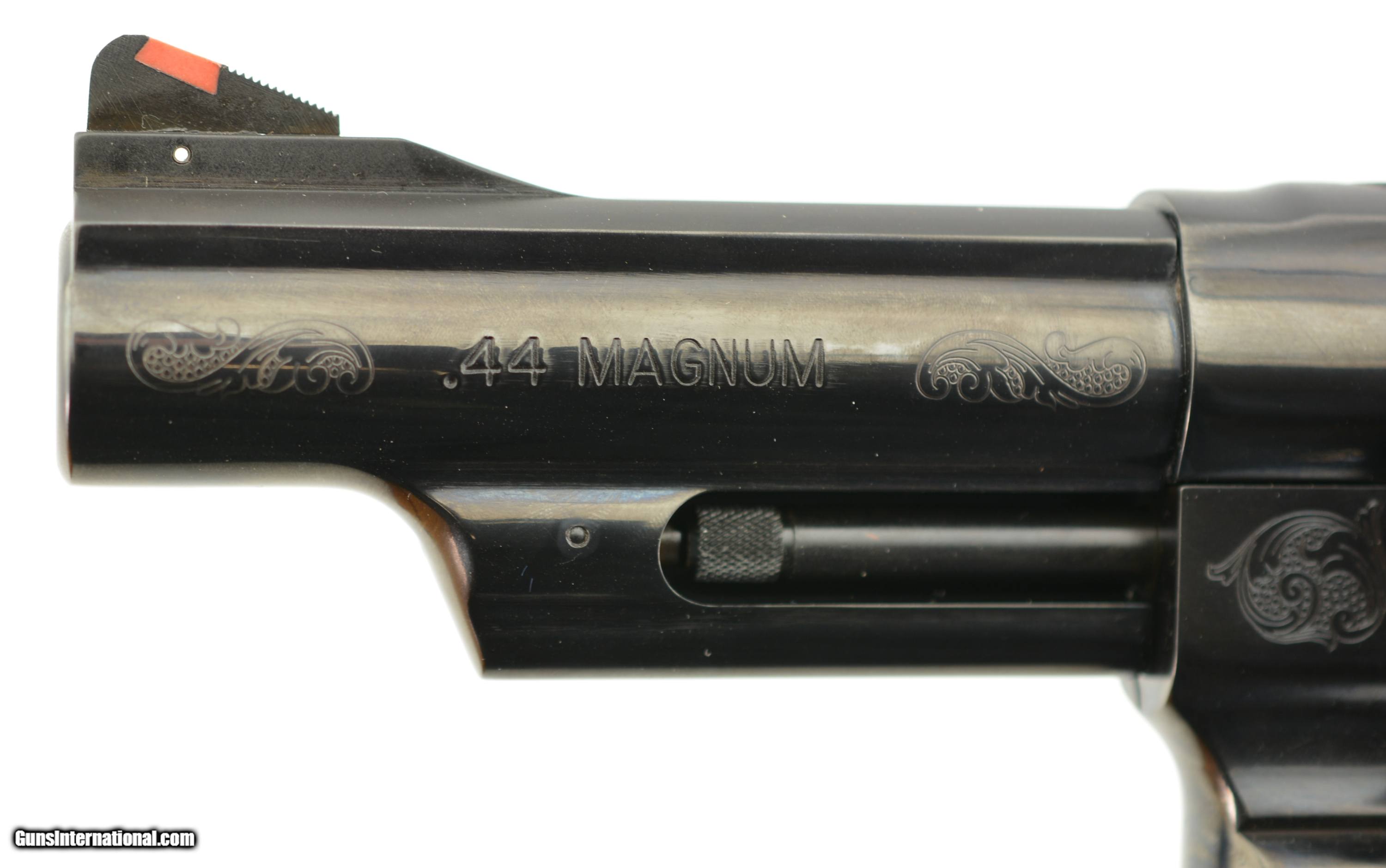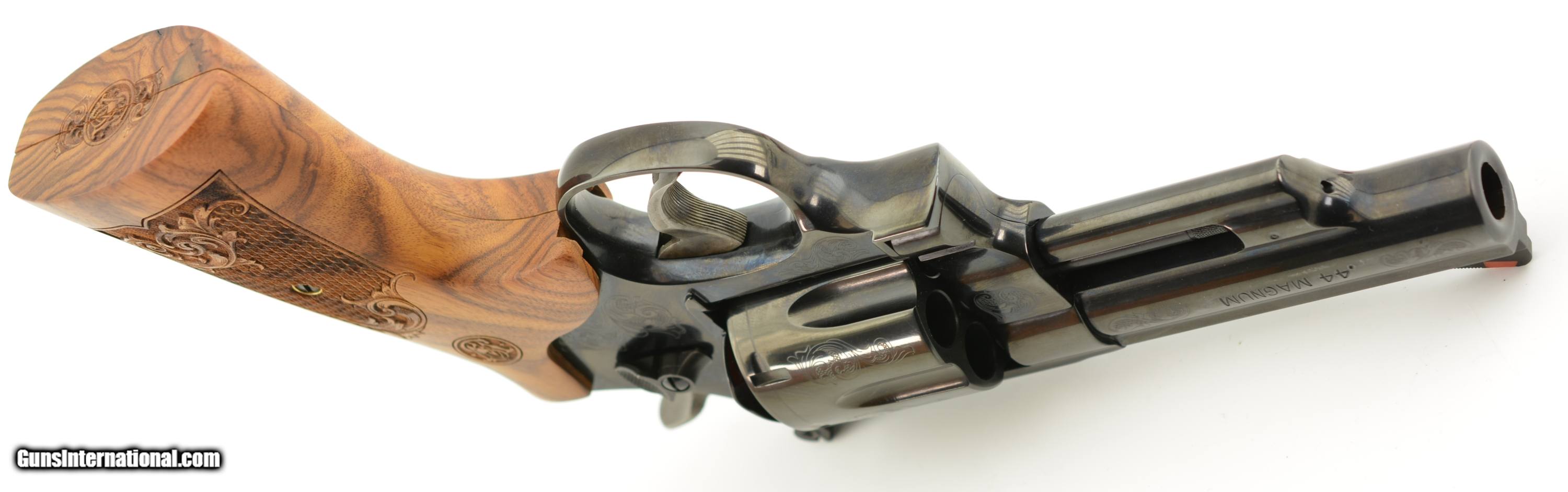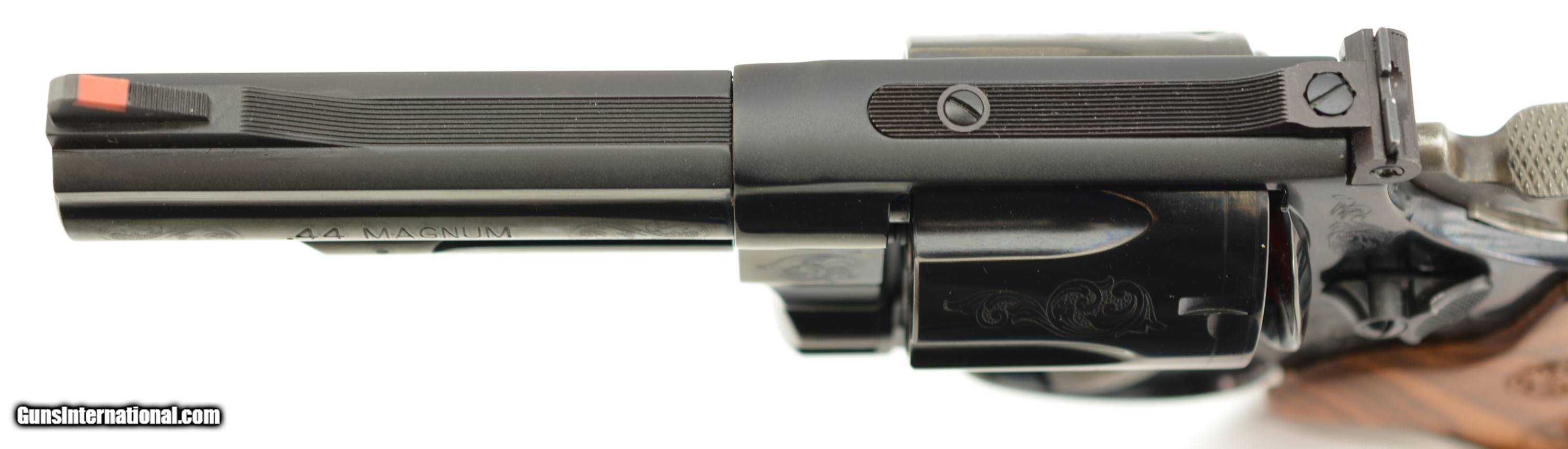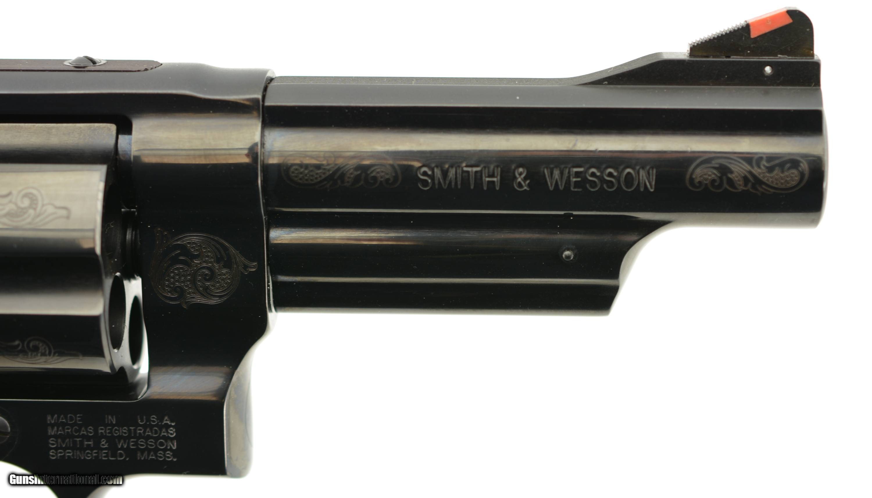Description: Serial #DMV9499, .44 Magnum, 4" barrel with an excellent, bright bore. This revolver features S&W floral scrollwork machine-engraving, and retains practically all of the original blue finish, with only a mild turn-ring on the cylinder. The hammer and trigger retain a commensurate amount of their original color case-hardened finish, and the original relief-carved S&W grips are also in excellent condition. The revolver comes with both the original blue plastic shipping case (along with the original papers and gunlock), as well as the original wooden presentation case. This is a fabulous, factory-embellished N-Frame S&W, and is in virtually new condition. FFL SOLD Manufacturer: S&W Model: 29 Serial Number: DMV9499 Caliber Info: .44 Mag Gauge Info: .44 Mag |