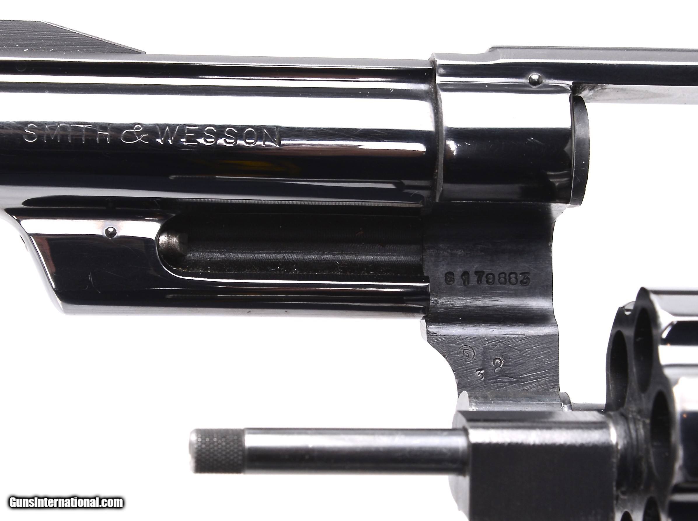 Description: S&W pre-29, .44 magnum revolver. 4-screw, bright blue, 4” barrel, red ramp target sight, target hammer, diamond grips. Gun is perfect mechanically, beautiful/bright bore and this revolver retains 98% dark/bright blue with just some light edge wear. The diamond target grips have a small chip out of the bottom left side. Very fine collectable S&W pre-29 made in early 1957 this revolver may be on of the very last 44 magnums before “29” was stamped on the frame! $1,750.00 SN: S179883 SOLD |