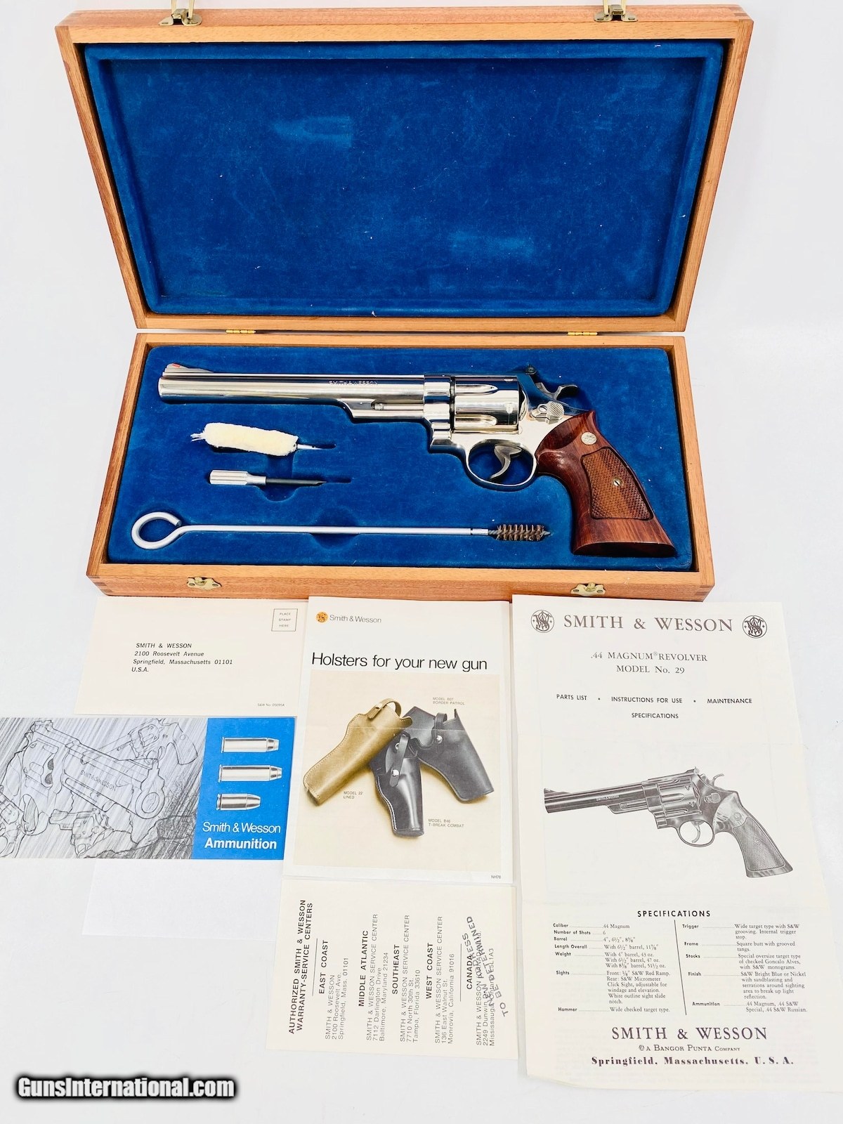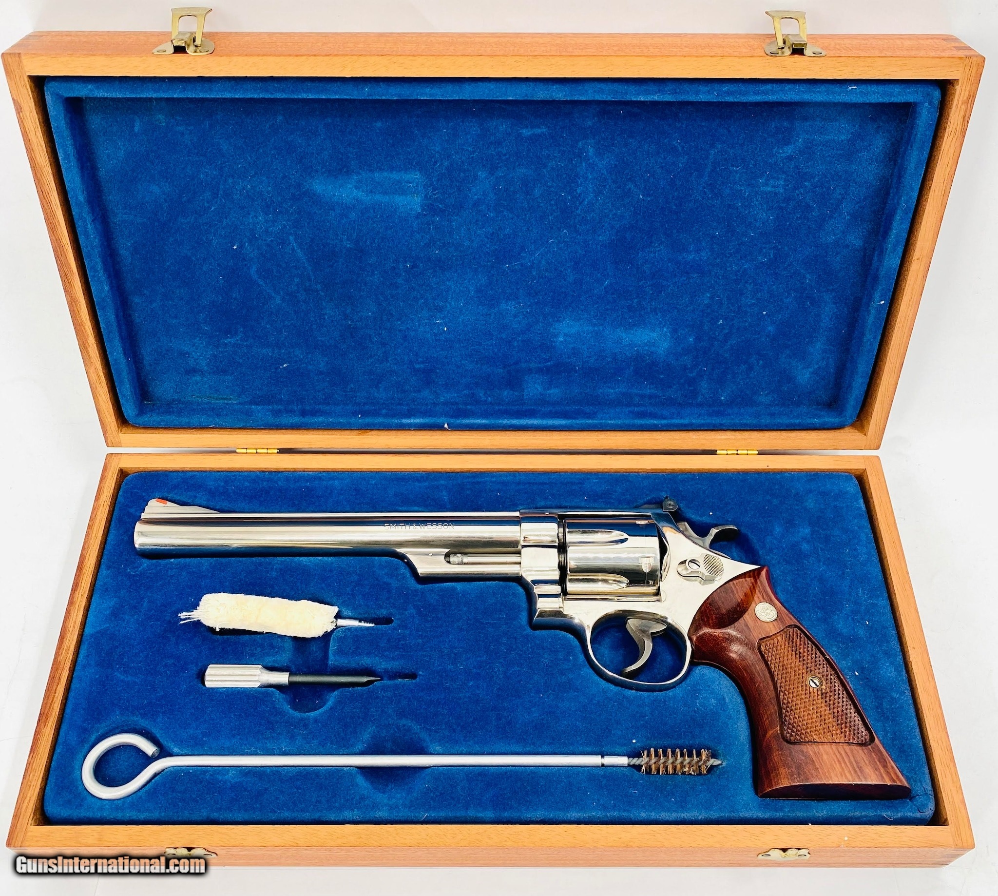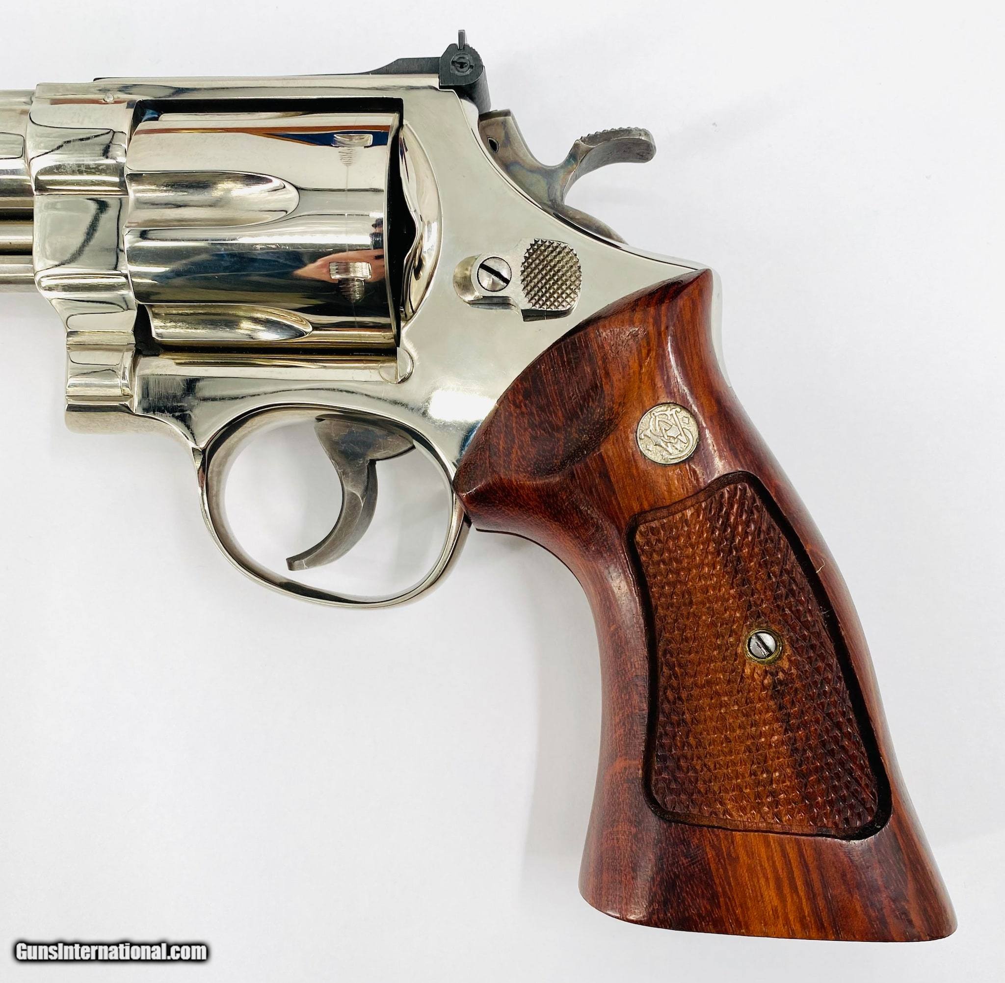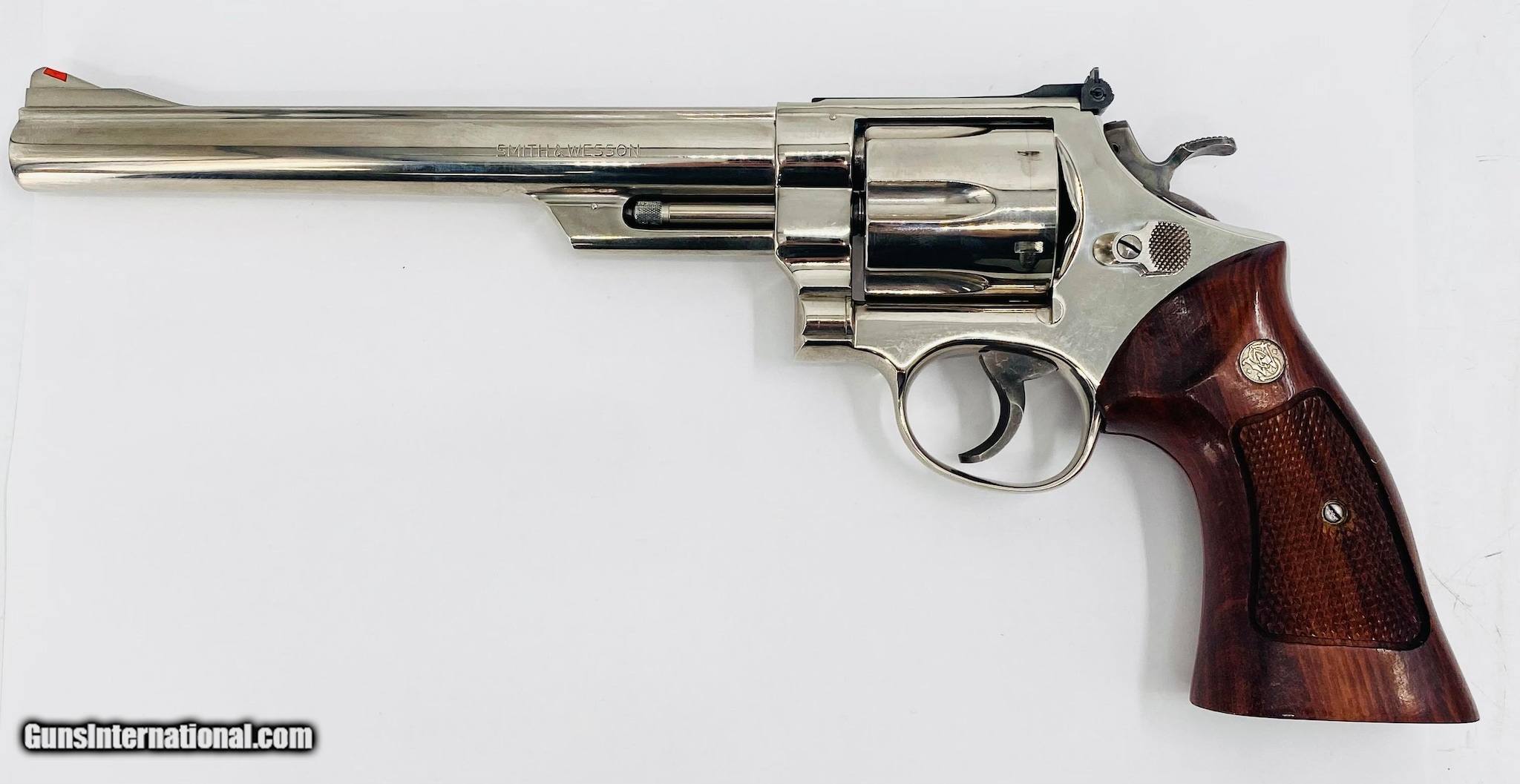 Description: Guns Listing ID: 821537 The Smith & Wesson Model 29 is a six-shot, double-action revolver chambered for the .44 Magnum cartridge made from 1955 to present. The Model 29 is one of the popular revolvers ever made due to its reputation for quality and its worldwide association with the fictional character \"Dirty Harry\" Callahan. The original Model 29 was superseded by the Model 29-1 in 1960, with modifications made to the ejector-rod screw. The Model 29-2 replaced it the following year, with one screw that had secured the cylinder-stop spring being deleted. This Model 29-2 was made in 1976, and features a 8 3/8\" barrel, nickel finish, case hardened trigger/ hammer, checkered walnut Magna-Style grips with S&W medallions, 10-groove rear strap, shrouded extractor rod, ribbed barrel, adjustable rear sight and ramped front sight. Overall is in VERY nice condition with VERY light wear, has a sharp/ clean bore, appears to be in good working order and comes in wooden dovetail case with paperwork & cleaning tools. SOLD Manufacturer: SMITH & WESSON Model: 29-2 Caliber Info: 44 MAG Condition: Used - Non-Certified Barrels: 8.25 BARREL Finish: NICKEL |
